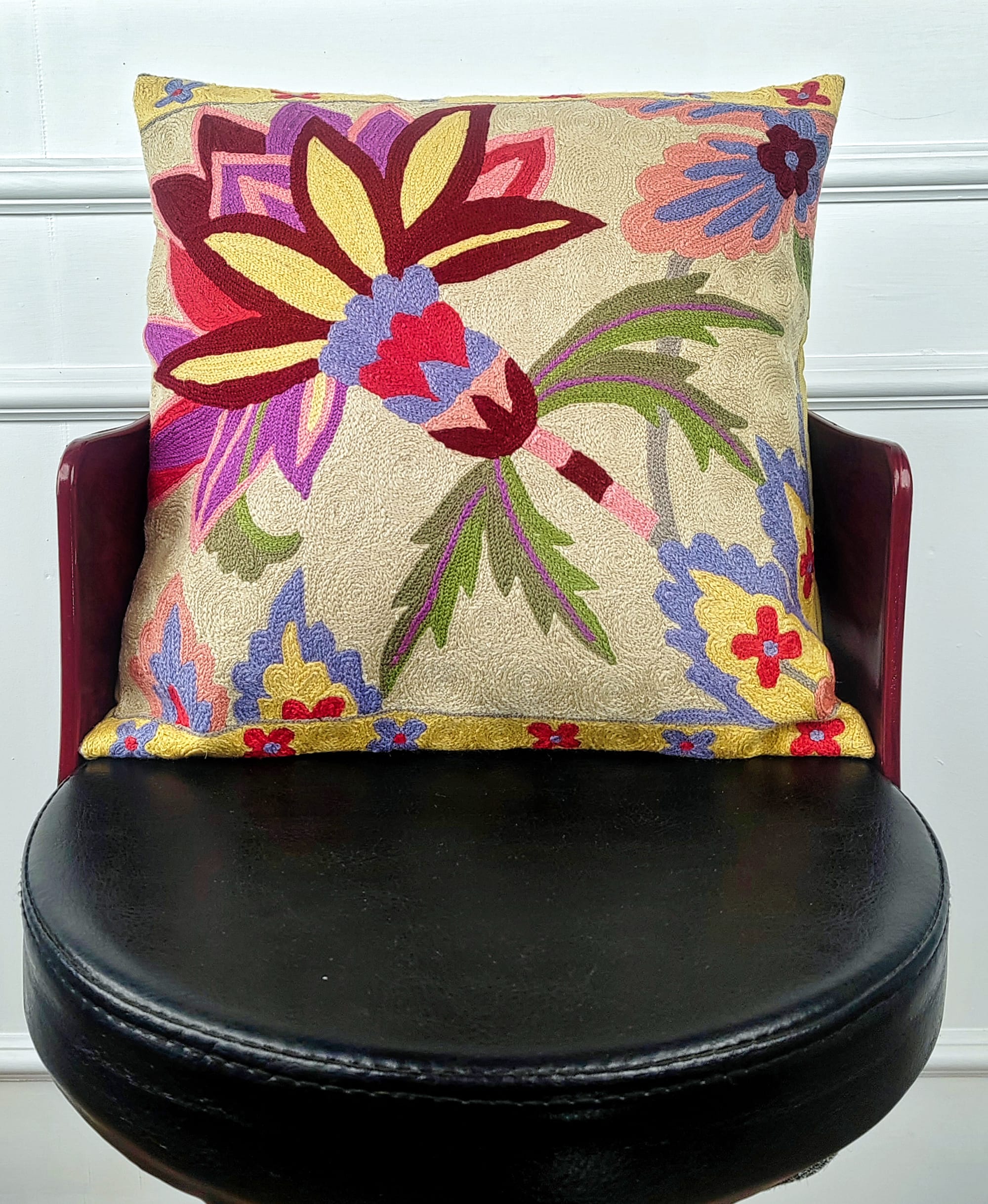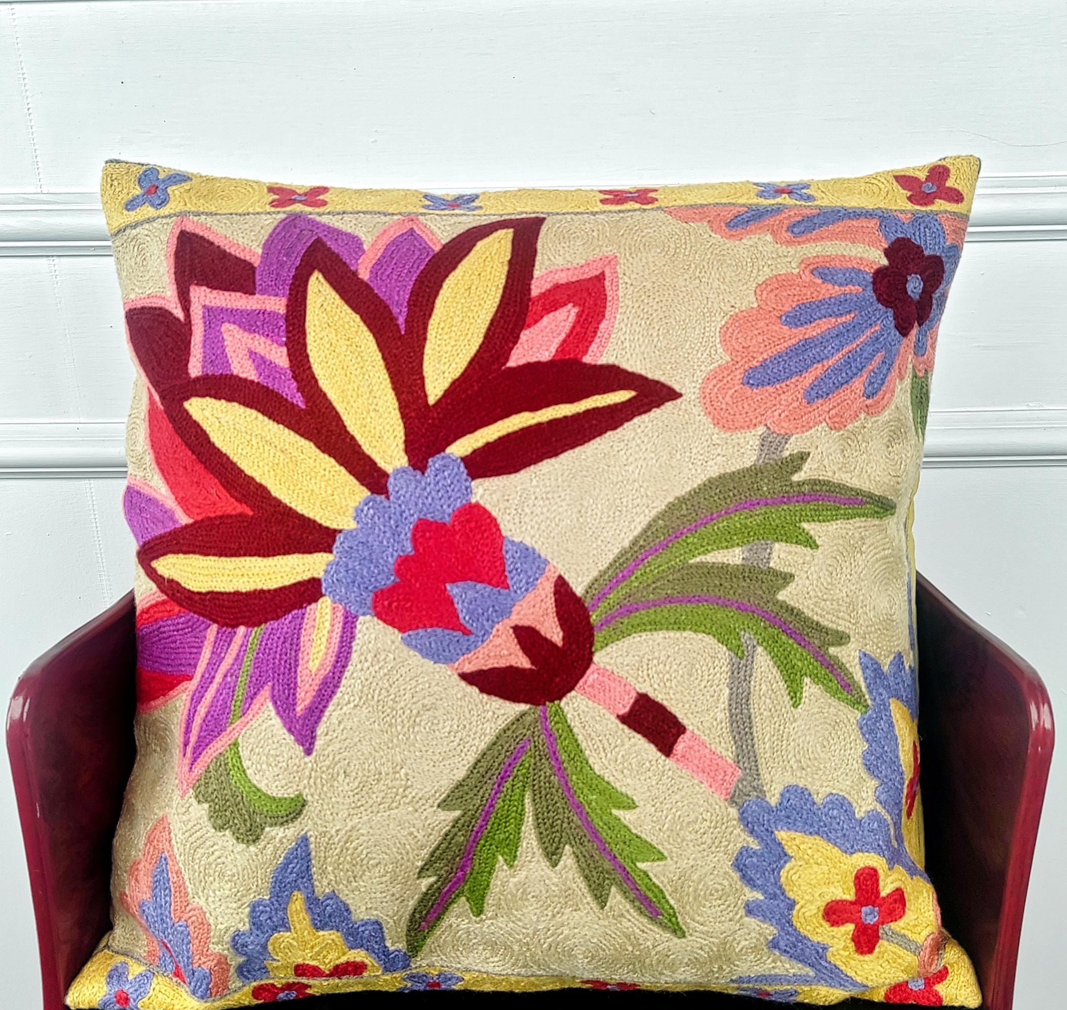 Bloom Reverie is a striking Kashmiri embroidered wool cushion cover that celebrates oversized floral artistry inspired by traditional garden motifs. Set on a warm ivory wool base, the design features a dramatic central bloom rendered in rich crimson, golden yellow, rose pink, lavender, and leafy greens. The bold scale of the flower, paired with flowing stems and surrounding blossoms, creates a dynamic yet harmonious composition. Dense hand embroidery gives the surface a plush, tactile quality, reflecting the mastery of Kashmiri craftsmanship. This cushion cover makes a vivid statement, ideal for adding colour, character, and artisanal charm to curated living spaces.