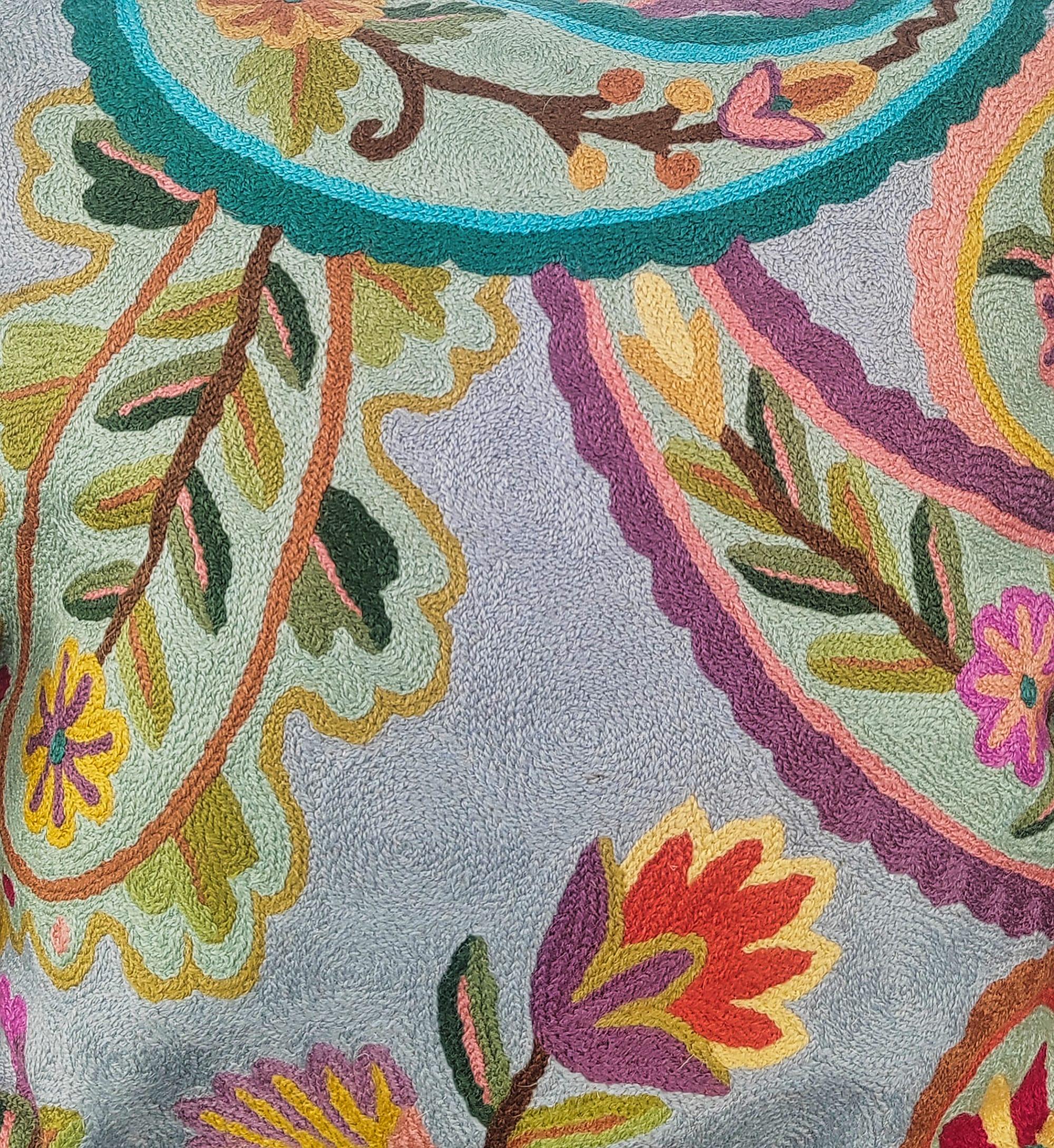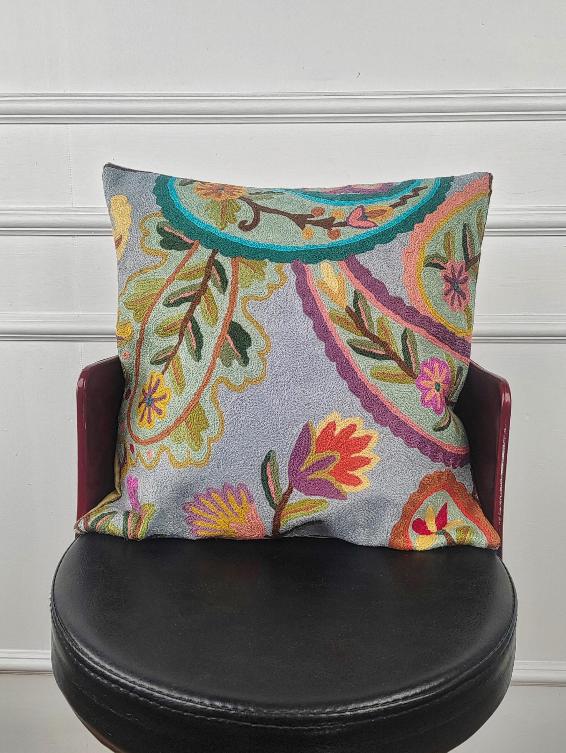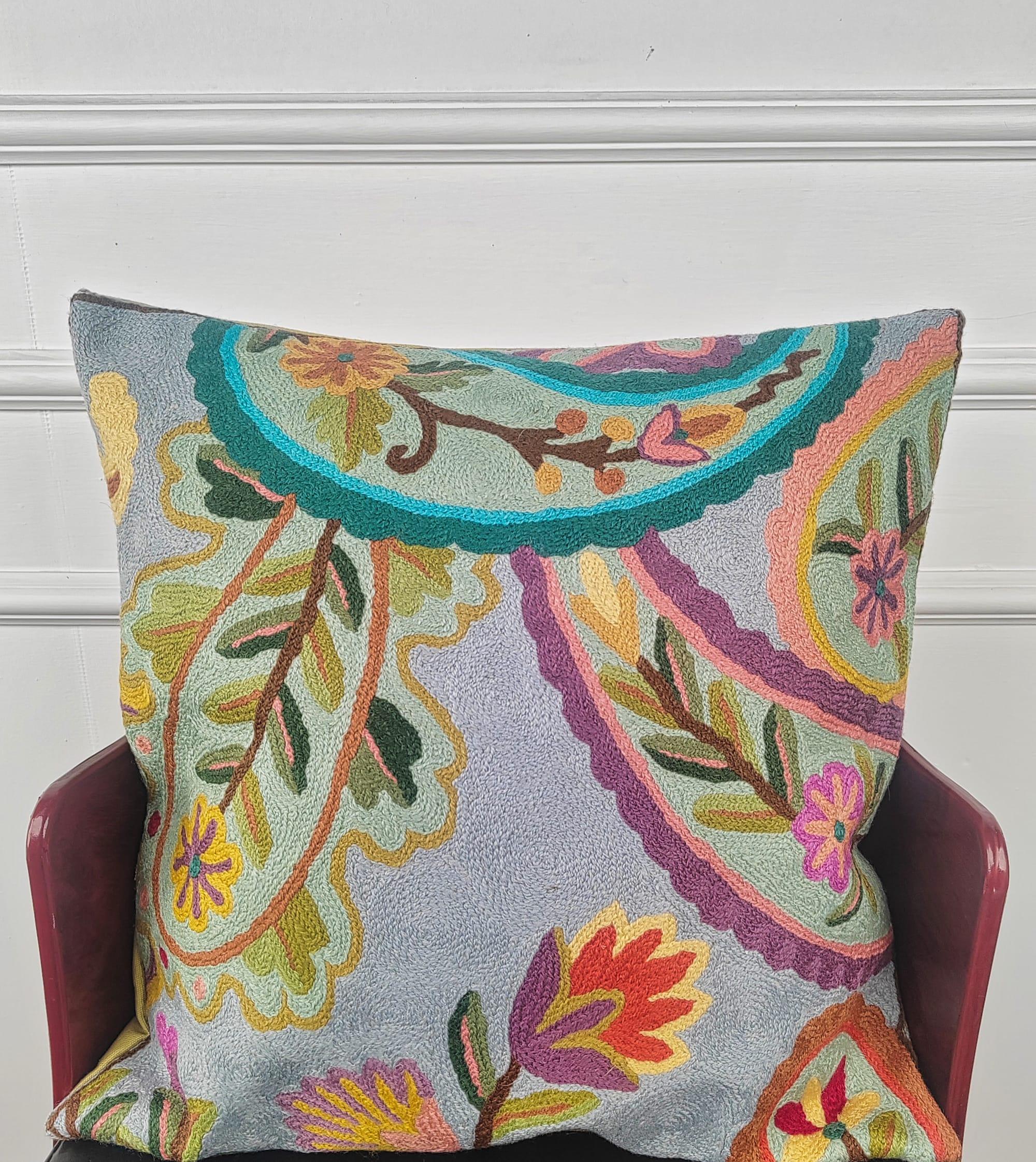The Celadon Paisley Canopy Kashmiri Cushion Cover is a serene celebration of flowing paisley forms and garden-inspired embroidery. Handcrafted in 100% pure wool, the design unfolds in soft celadon and misty grey tones, layered with graceful vines, floral accents, and gently arched paisley canopies. Accents of teal, coral, lavender, and moss green add depth and movement, creating a harmonious composition that feels both tranquil and richly detailed. This cushion brings an elegant, airy sophistication to refined interiors.