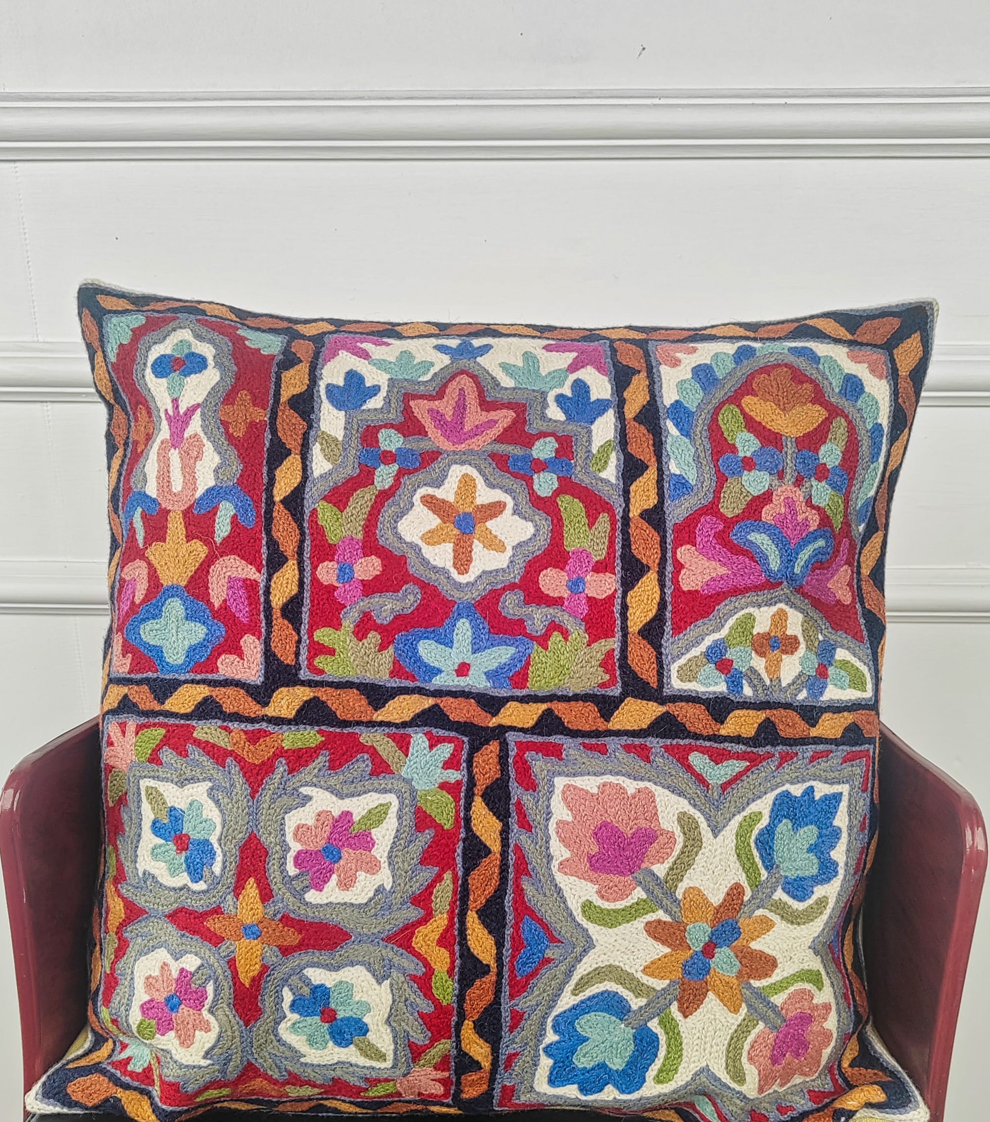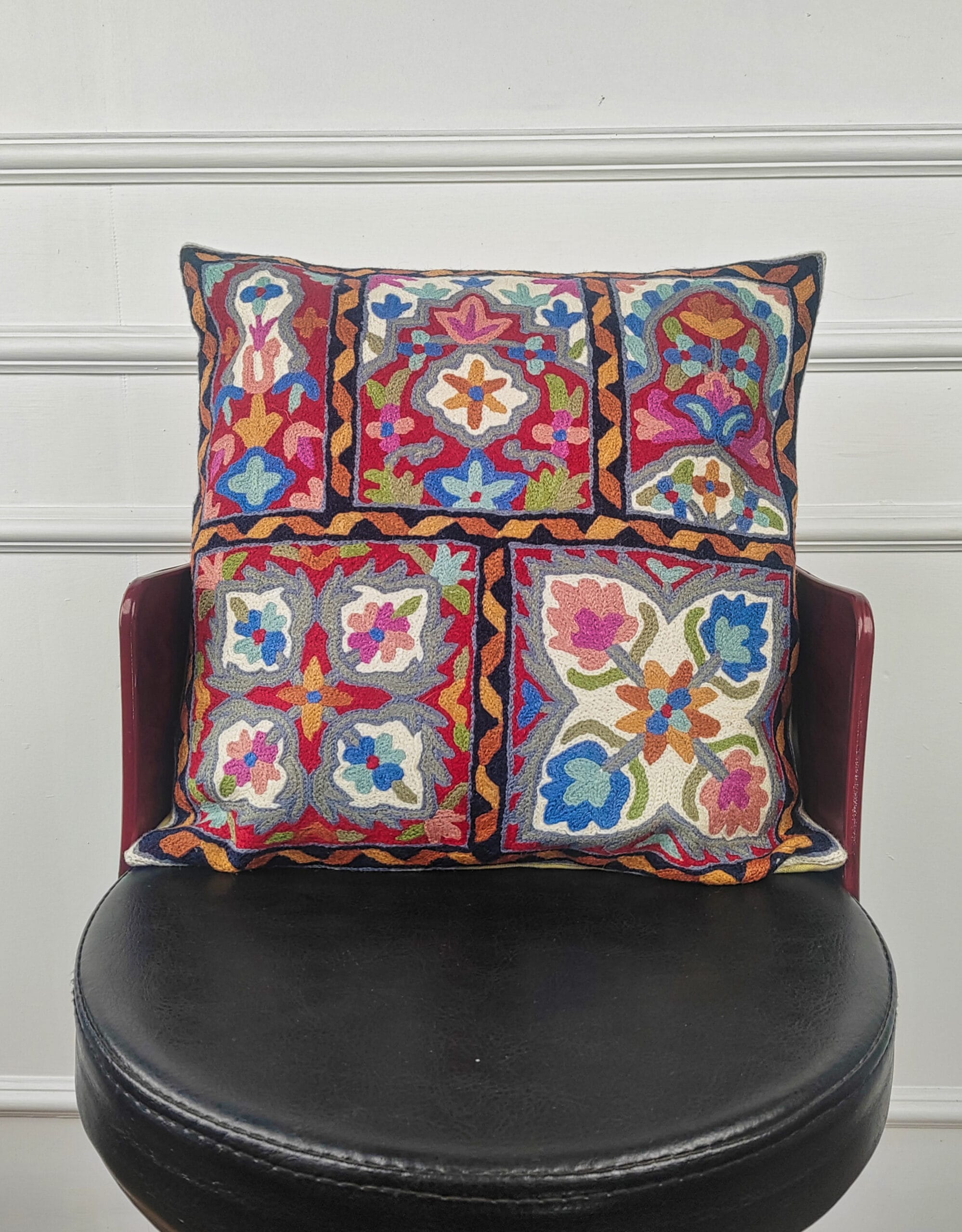 This handcrafted Kashmiri embroidered cushion cover features a striking mosaic-style composition inspired by traditional architectural panels and garden motifs of the Kashmir Valley. Made from 100% pure wool, the cushion showcases intricately embroidered geometric floral panels arranged in a grid formation, framed with bold borders. The rich crimson base is enlivened with harmonious accents of blue, ivory, green, and ochre, reflecting masterful craftsmanship and cultural storytelling. A perfect statement piece, this cushion cover adds warmth, depth, and artisanal elegance to living rooms, reading corners, or heritage-inspired interiors.
