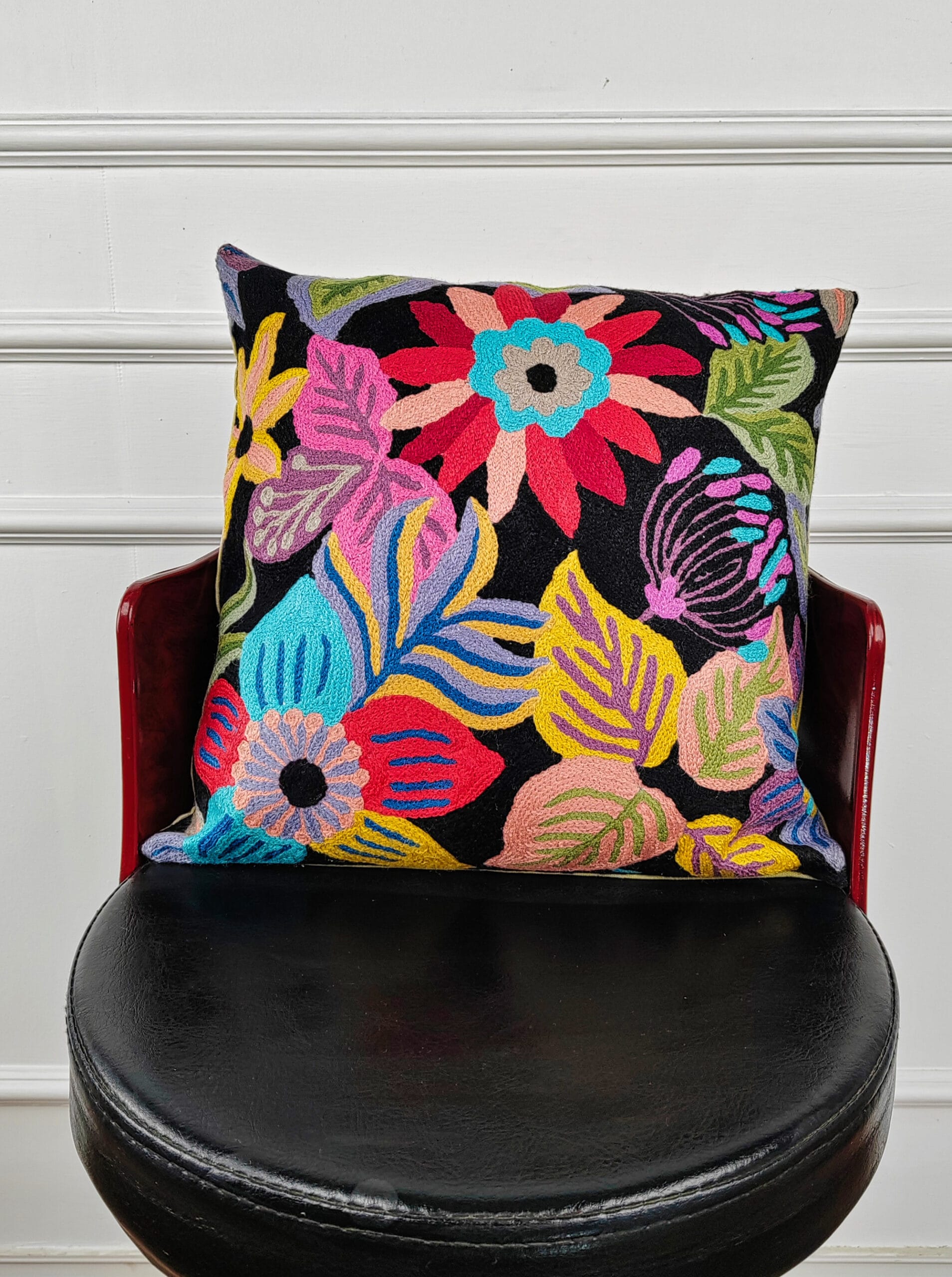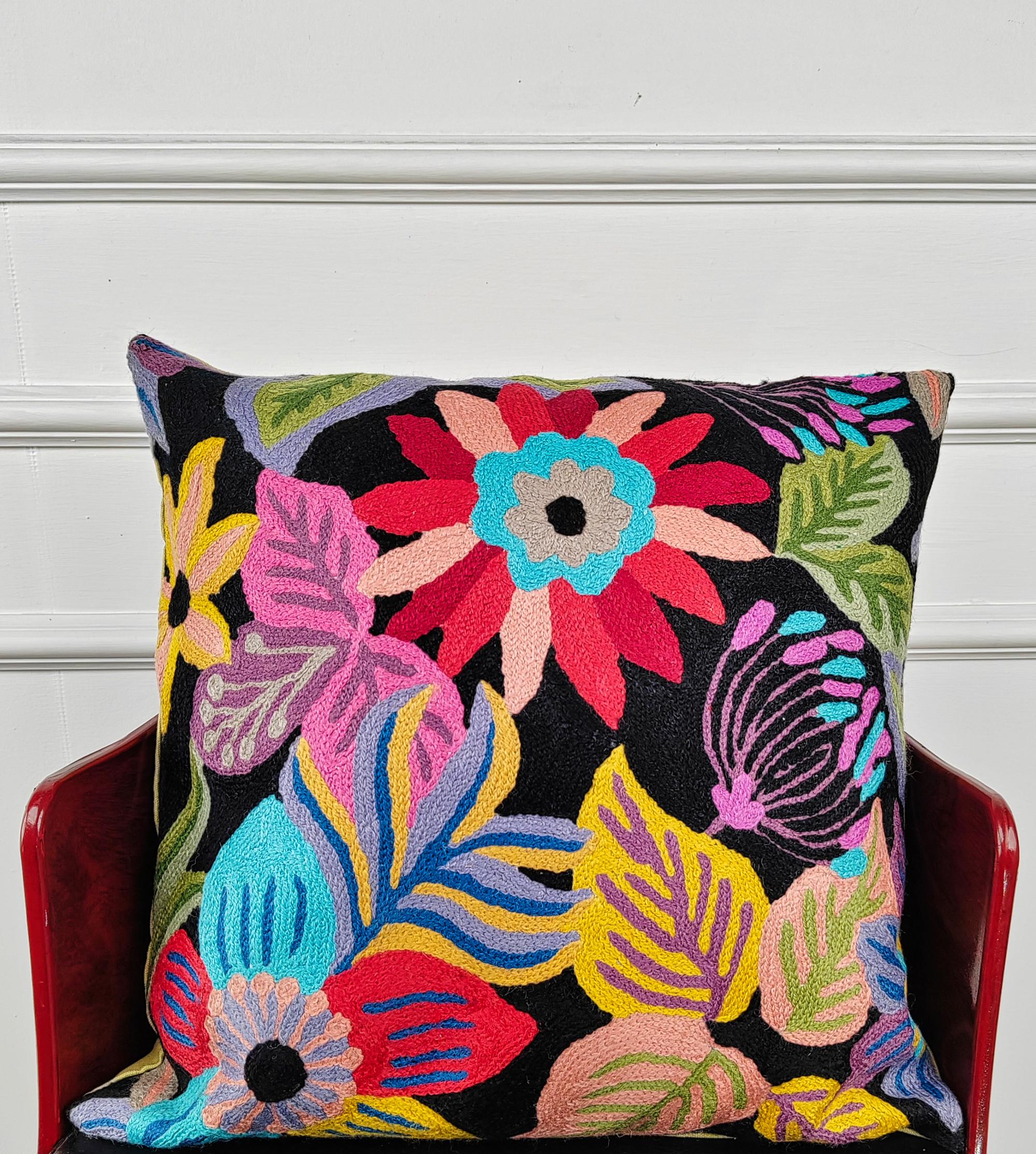 The Eclipse Garden Kashmiri Cushion Cover is a striking expression of Kashmiri embroidery artistry, showcasing bold floral motifs blooming against a deep, dramatic backdrop. Hand-embroidered in 100% pure wool, the design features oversized blossoms and flowing foliage rendered in vibrant hues, creating a captivating contrast reminiscent of a garden illuminated under a night sky. This embroidered cushion cover blends heritage craftsmanship with a contemporary aesthetic, making it a statement accent for both modern and classic interiors.