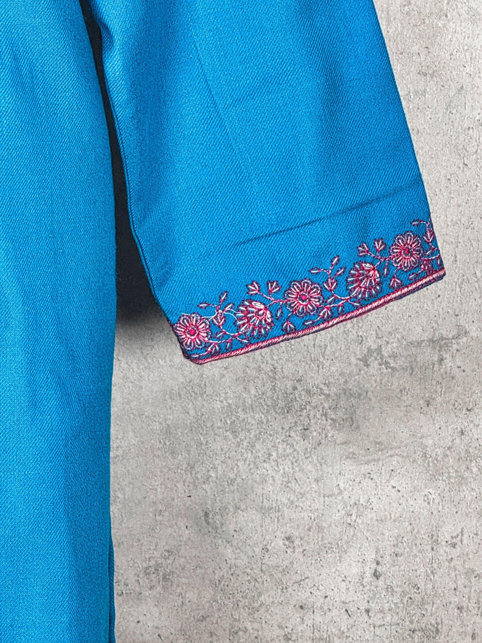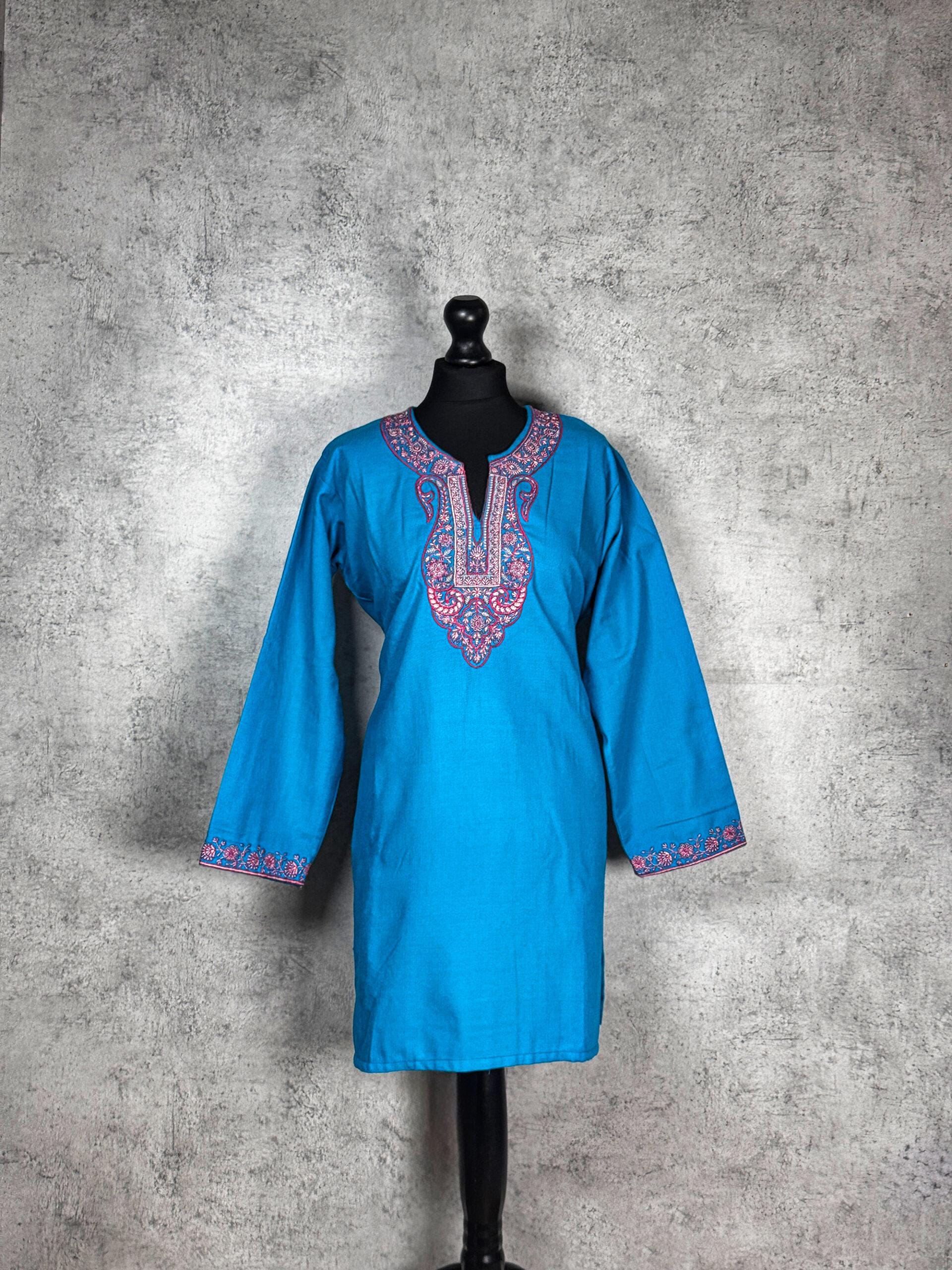 A serene expression of Kashmiri artistry, the Elaris Blue Kashmiri Short Kurti is crafted in a soothing blue hue, elevated by intricate aari embroidery inspired by traditional paisley and vine motifs. The harmonious blend of colour and craftsmanship makes this piece effortlessly elegant perfect for both everyday grace and understated festive wear. Delicate hand embroidery adorns the neckline and sleeve cuffs, creating a striking focal point while maintaining a balanced, wearable silhouette. Rooted in heritage yet styled for modern wardrobes, Elaris Blue is a timeless addition to your kurti collection.