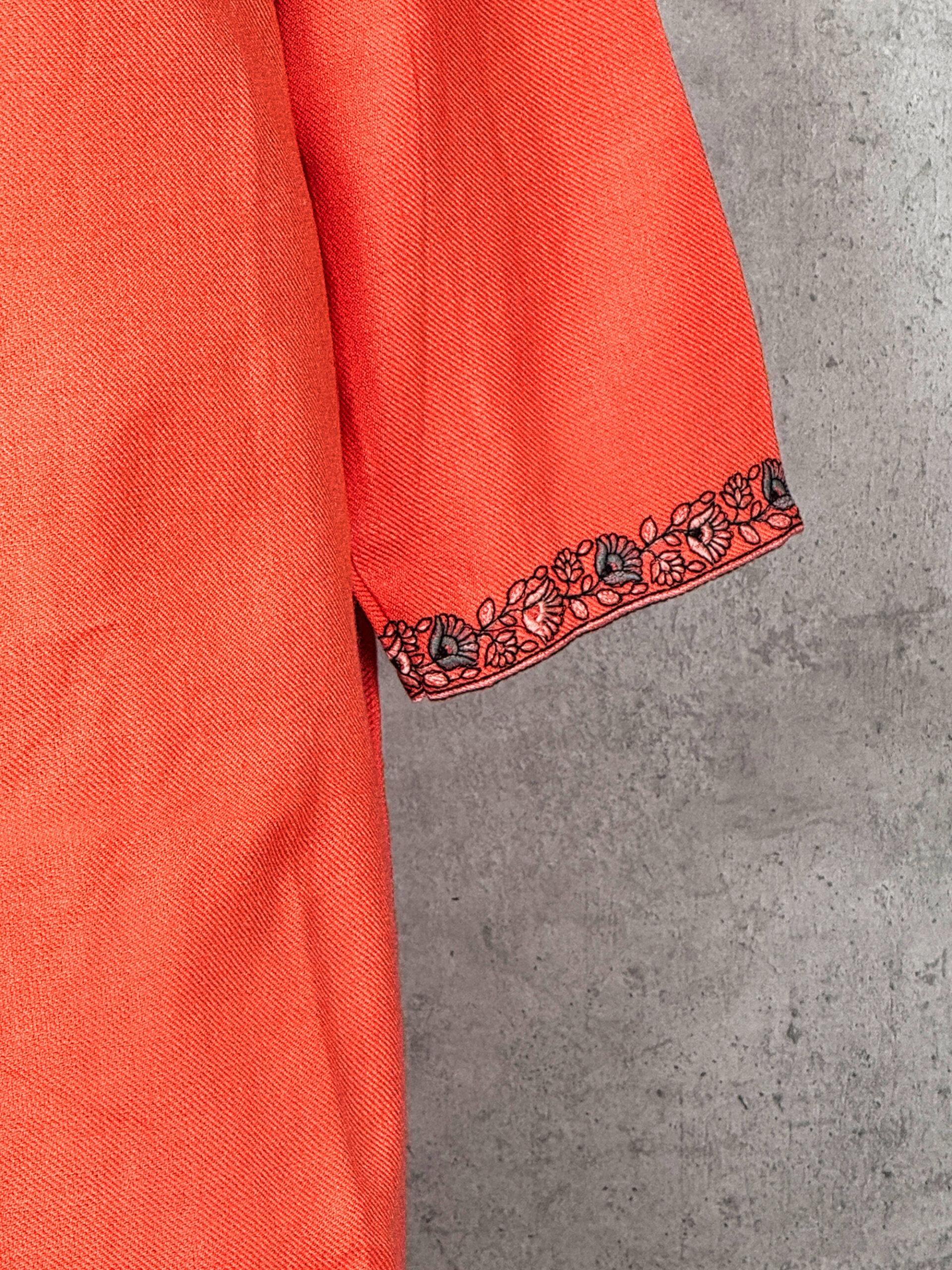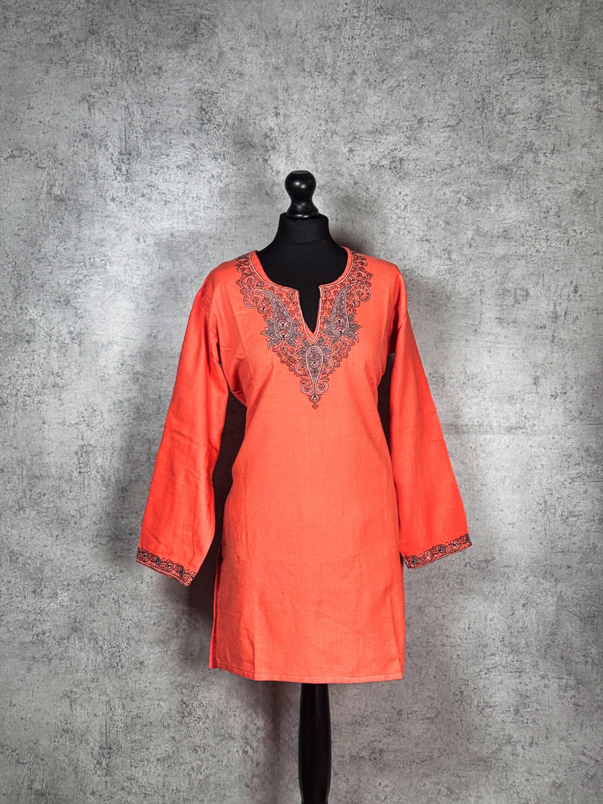 The Elowen Vine Kashmiri Short Kurti is a graceful celebration of Kashmiri embroidery traditions, inspired by flowing vine motifs and organic symmetry. The neckline is adorned with finely hand-executed aari embroidery, featuring elegant paisley and floral forms that cascade naturally across the chest, while delicate detailing at the sleeve cuffs adds a balanced finish. Crafted from a soft, breathable fabric with a smooth texture, this kurti blends everyday comfort with artisanal sophistication ideal for both relaxed wear and refined occasions.