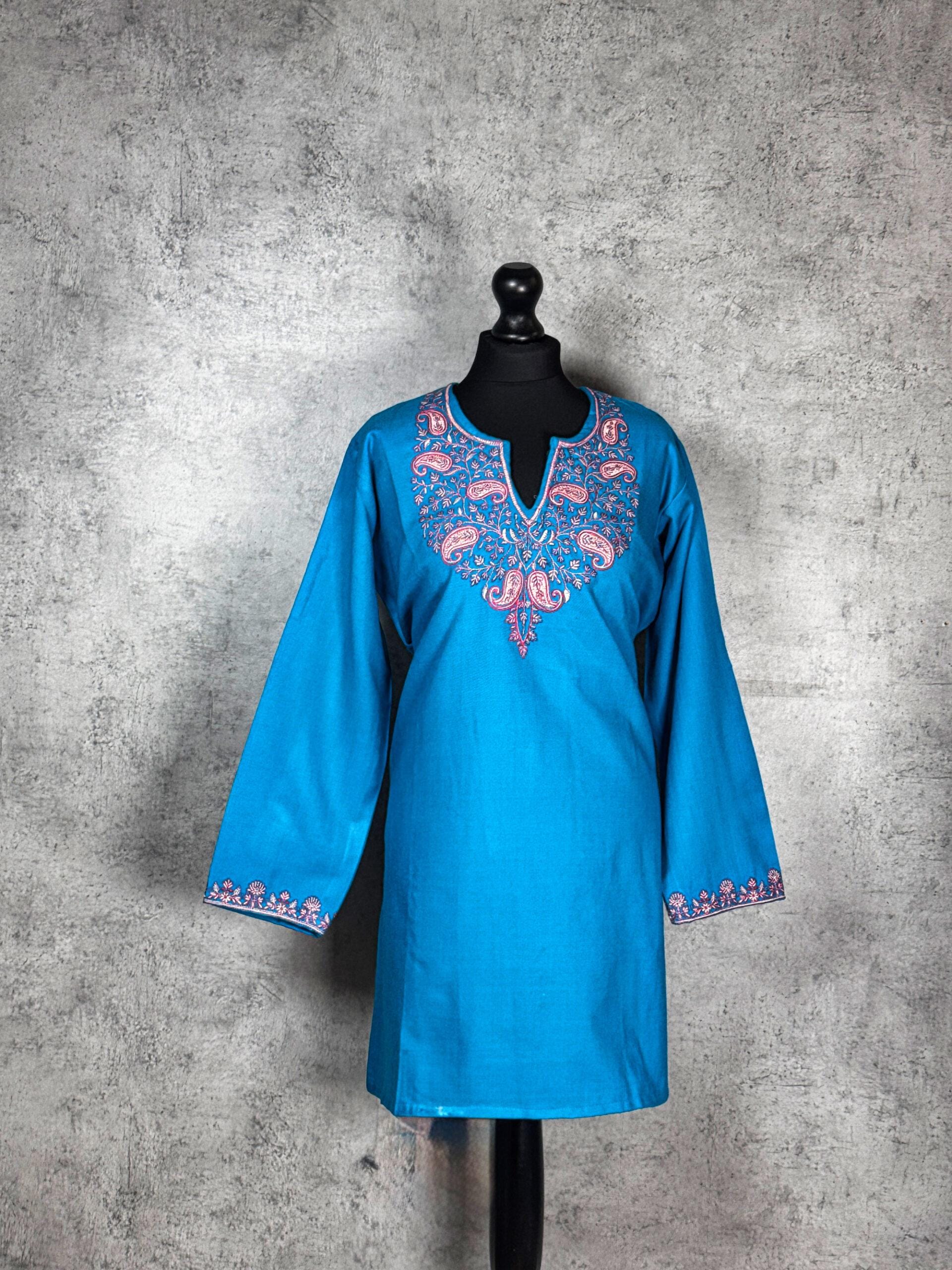 The Elysian Thread Kashmiri Short Kurti is a graceful fusion of Kashmiri heritage and contemporary elegance. Crafted from soft, breathable fabric, this short kurti features finely executed Aari embroidery inspired by traditional paisley and vine motifs. The embroidery flows delicately around the neckline and sleeve cuffs, creating a refined focal point that highlights the skill of Kashmiri artisans. Designed for effortless day-to-evening wear, this kurti offers comfort, artistry, and timeless appeal perfect for those who appreciate subtle luxury rooted in craftsmanship.