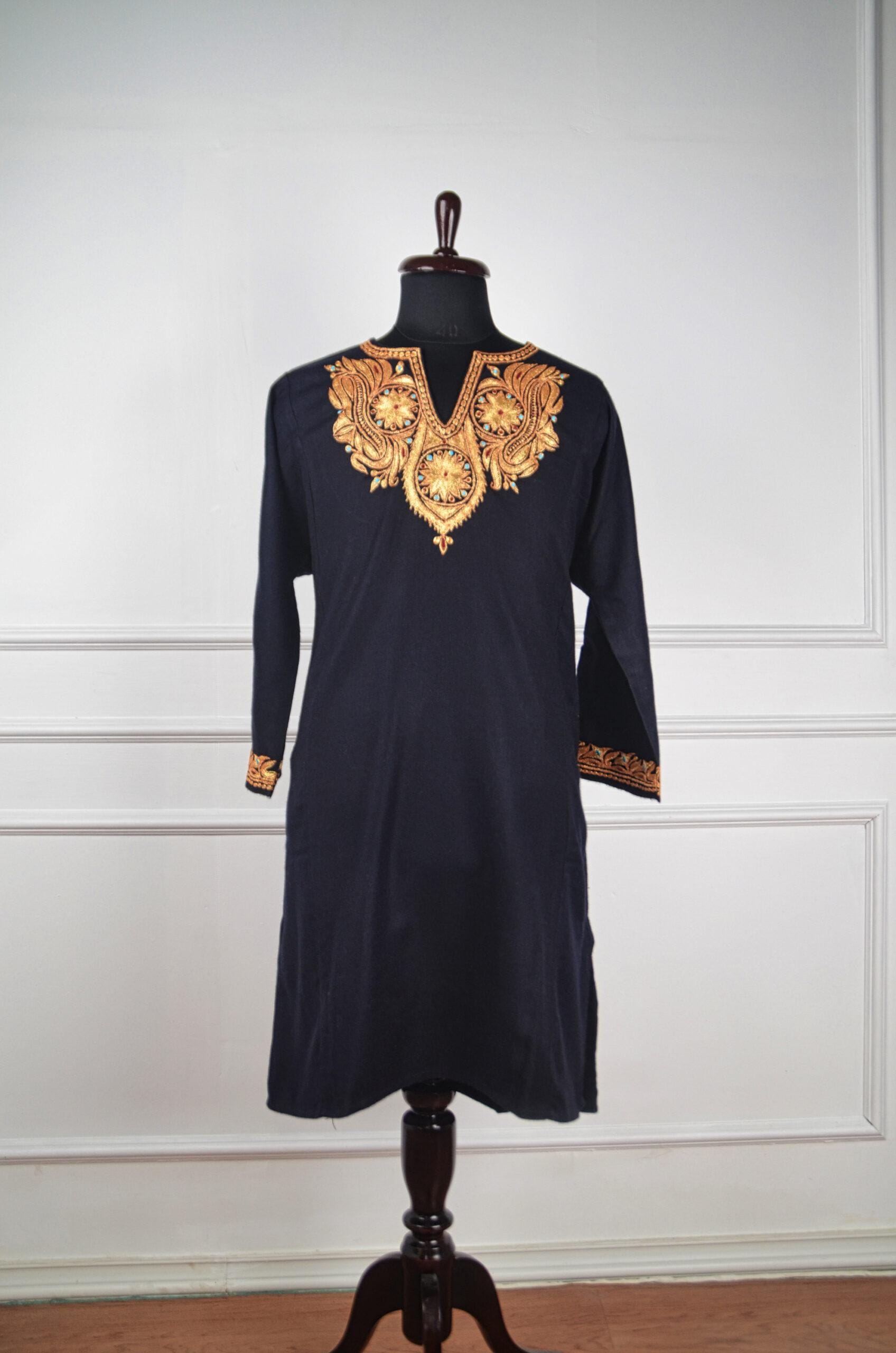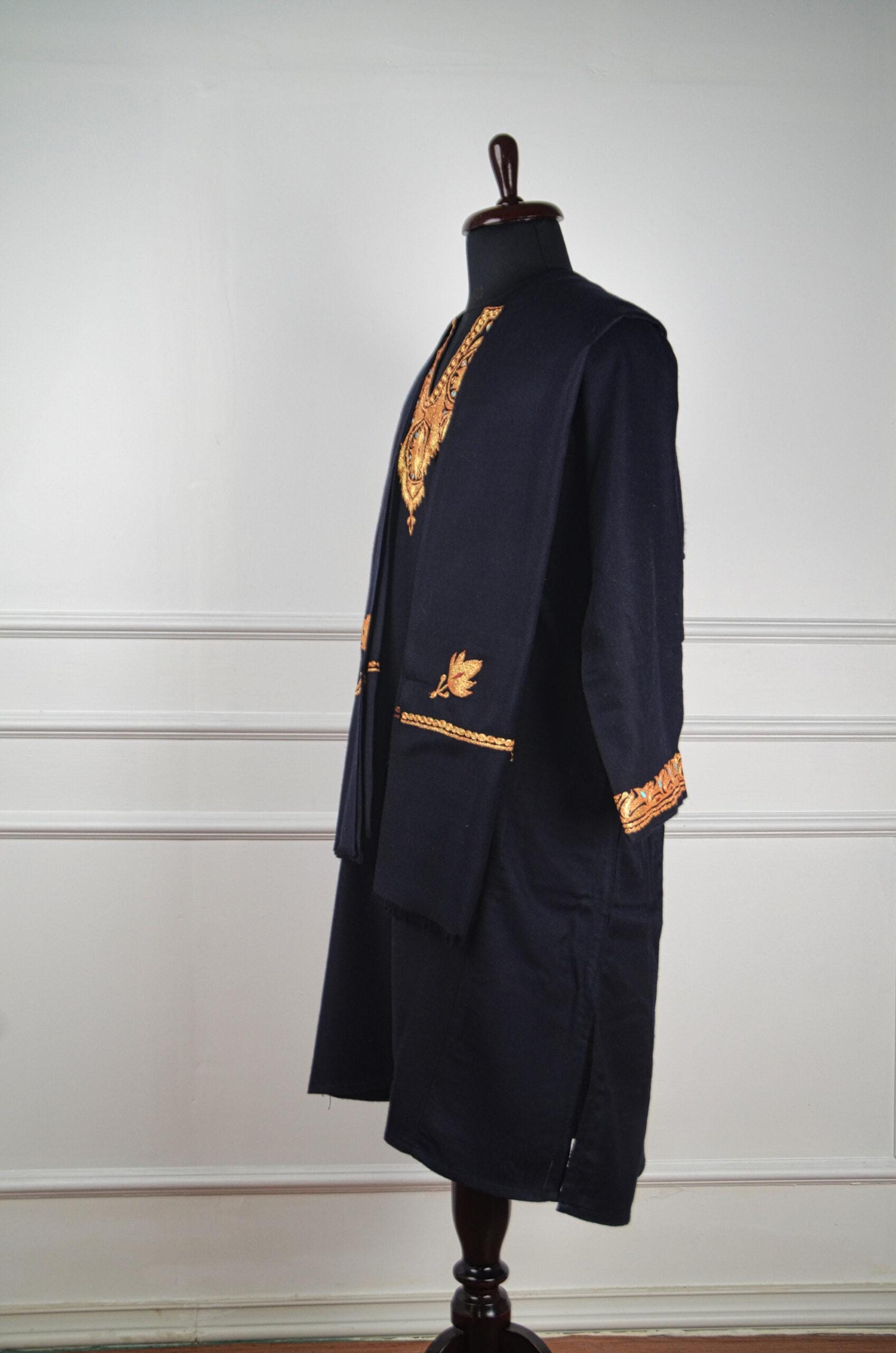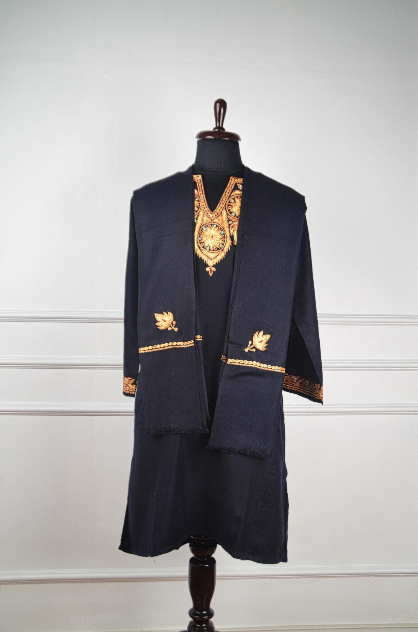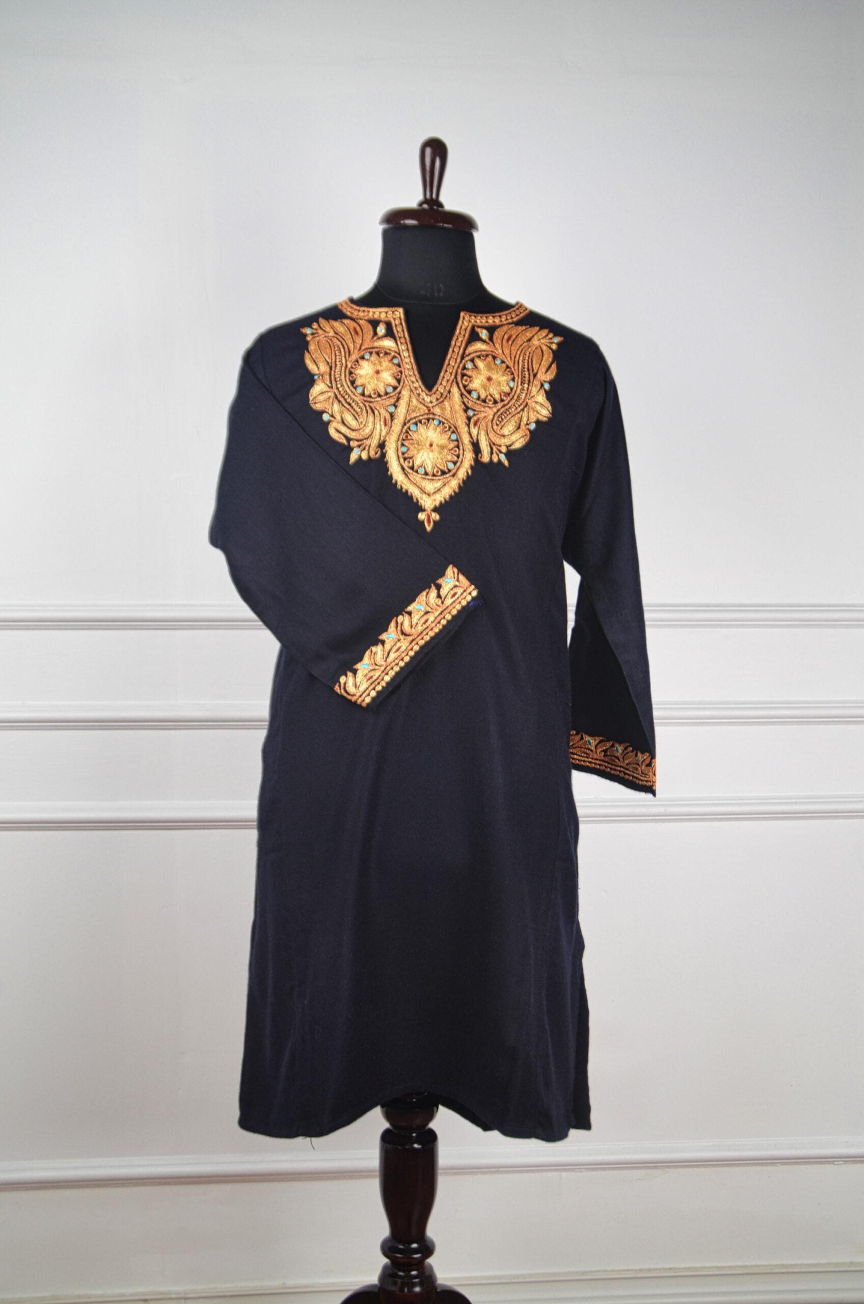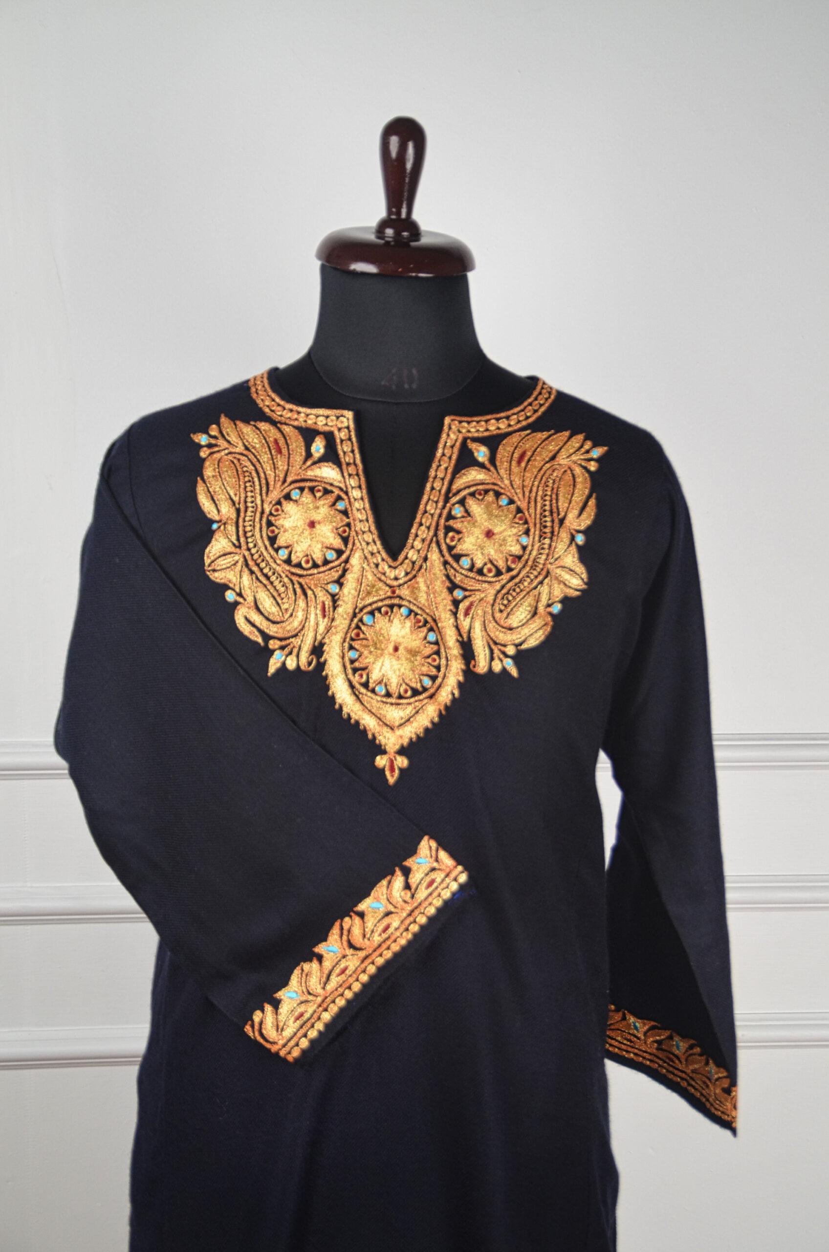 Ember Royale is an opulent Kashmiri pure wool pheran, where timeless artistry meets regal sophistication. The deep midnight base is illuminated by glimmering gold Tilla embroidery, meticulously hand-worked into ornate paisley and floral medallions. Each motif radiates with warmth, touched by turquoise and ruby accents that evoke the glow of glowing embers in a winter hearth. Exquisite detailing on the cuffs adds to its royal charm, making Ember Royale not just attire but an expression of Kashmiri luxury and enduring craftsmanship.