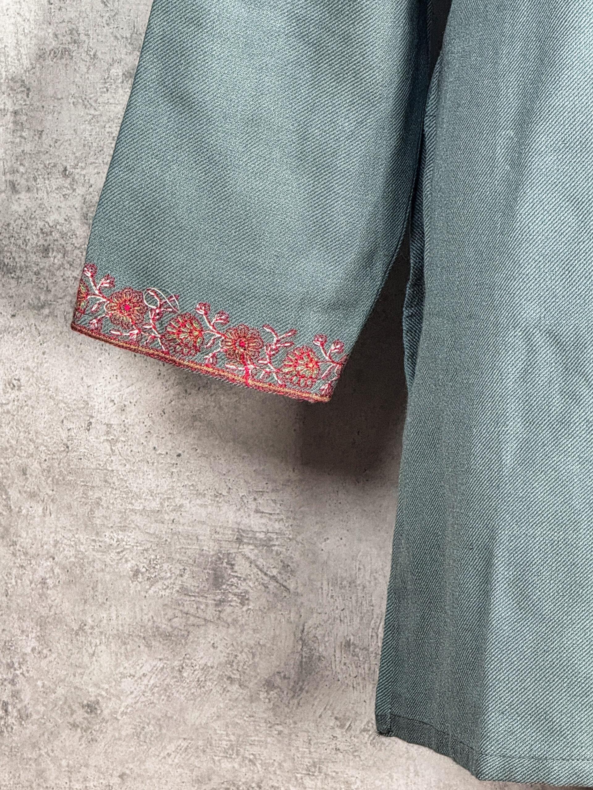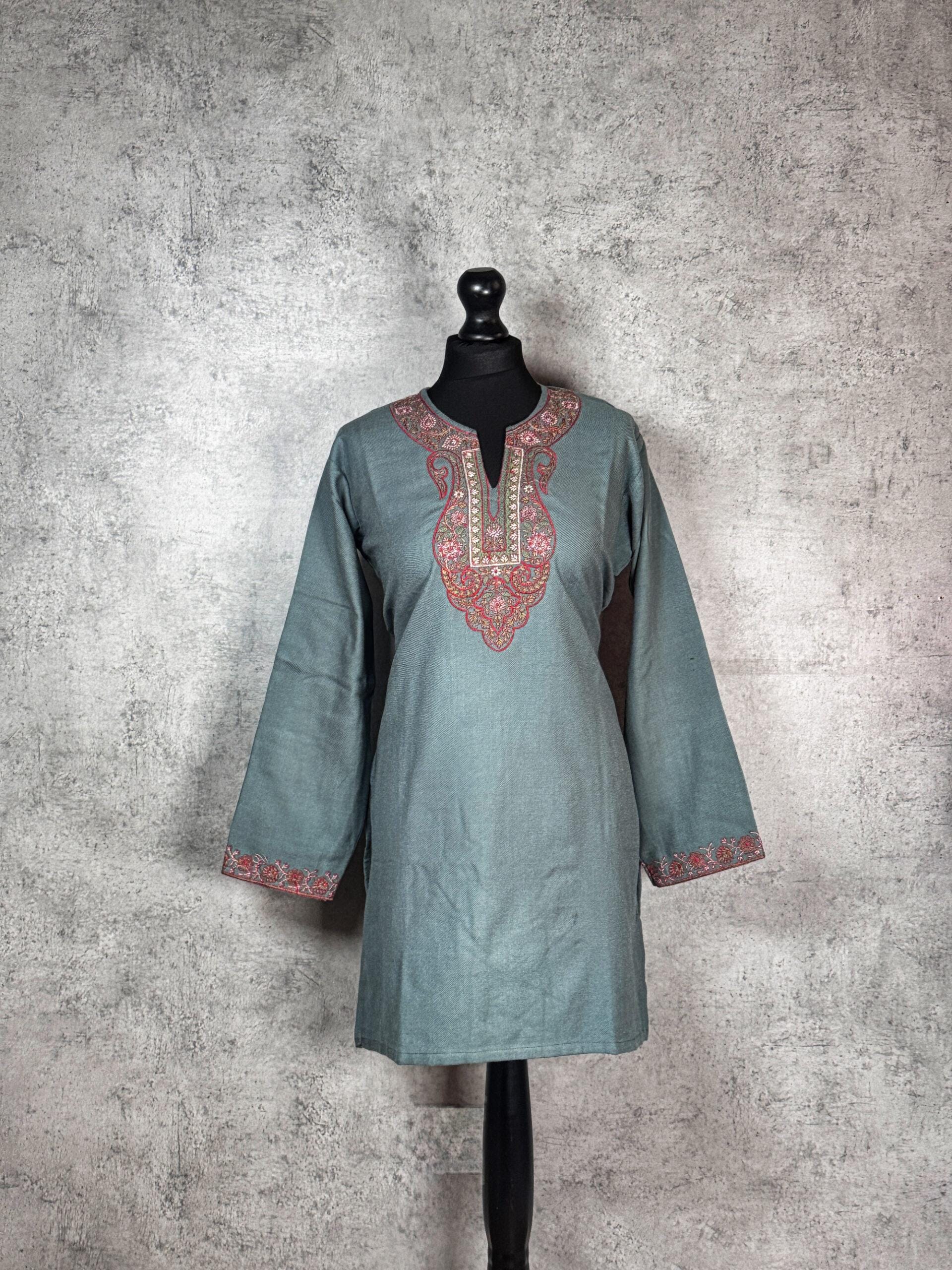 Inspired by the quiet elegance of forest foliage and blossoming valleys, the Fern & Bloom Kashmiri Kurti is a refined Kashmiri short kurti that beautifully blends nature-inspired aesthetics with traditional craftsmanship. Crafted from warm, comfortable Acrowool with a machine-woven base, this kurti features intricate Aari-style paisley and floral embroidery flowing gracefully along the neckline. The embroidery reflects delicate fern-like curves and blooming motifs, echoing the organic harmony found in Kashmir’s landscapes. Finished with coordinated embroidered sleeve cuffs, the silhouette remains elegant yet versatile ideal for winter wear, cultural gatherings, or everyday sophistication. This kurti offers a timeless balance of comfort, artistry, and heritage charm.