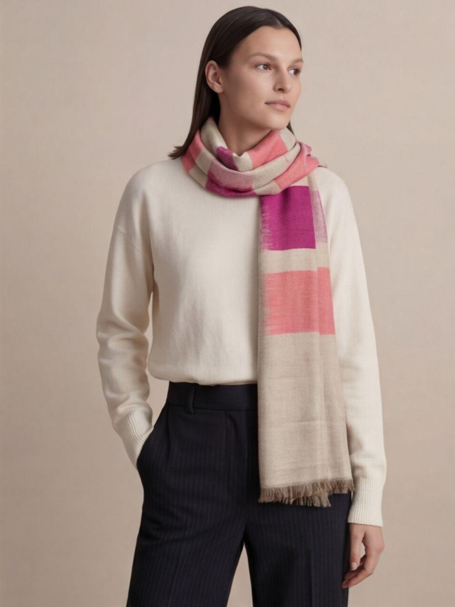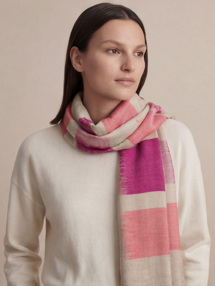 Fuchsia Blush Strata is a vibrant Kashmiri Ikat Cashmere Scarf featuring bold horizontal bands of fuchsia, rose pink, and soft blush layered over a calm ivory base. The design feels like painted color blocks with gentle Ikat feathering at the edges, giving it an artistic, modern character while staying rooted in Kashmiri textile tradition. Crafted in pure Cashmere, this Scarf is luxuriously soft, lightweight, and naturally warm ideal for adding a pop of color to neutral outfits or styling as an elegant statement wrap.