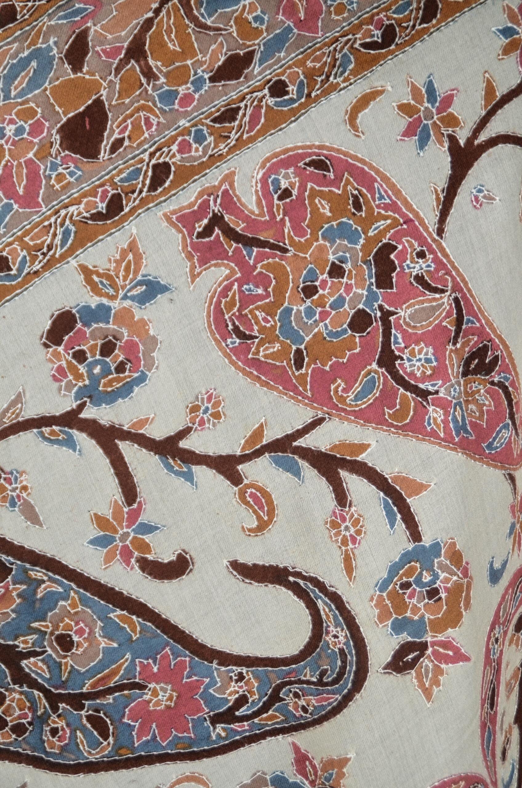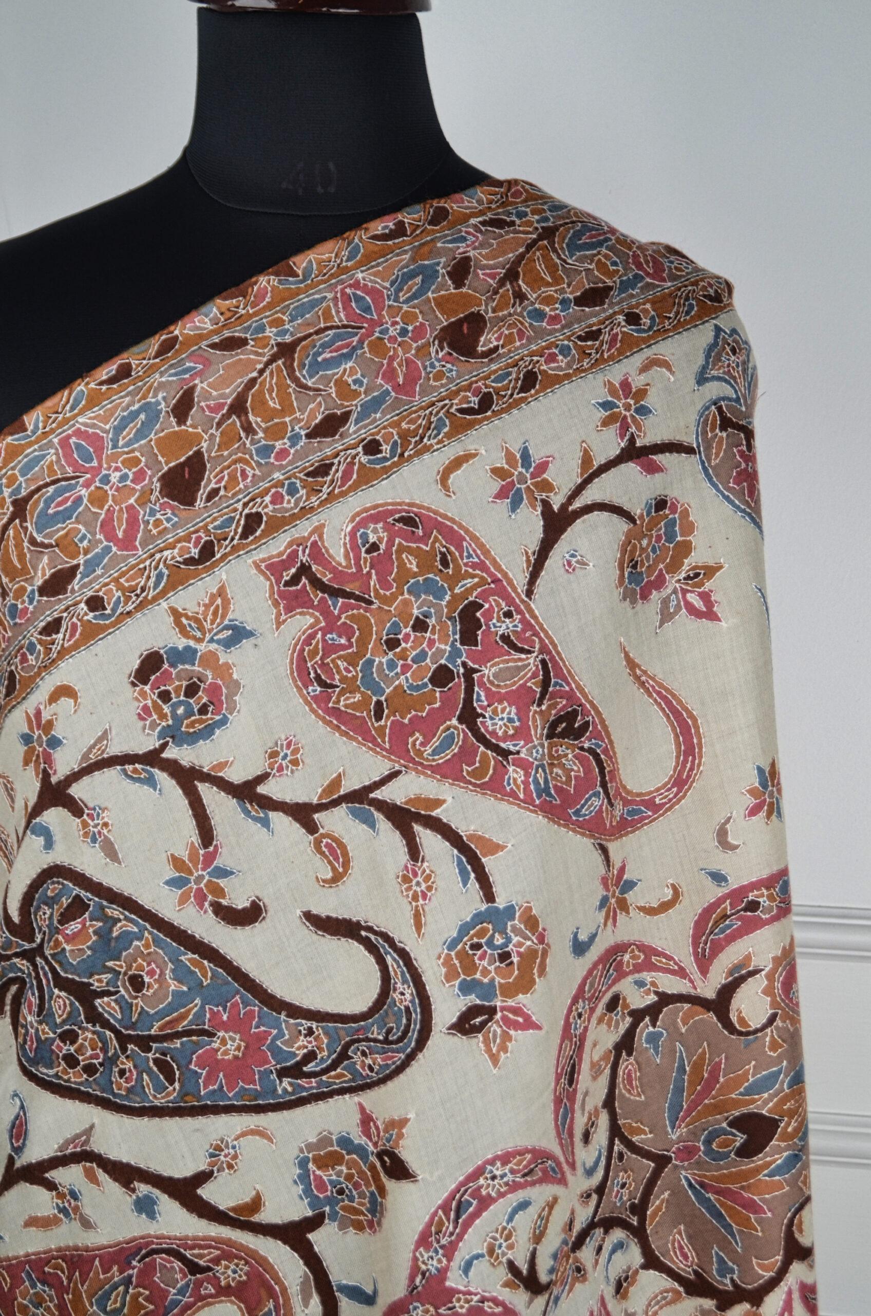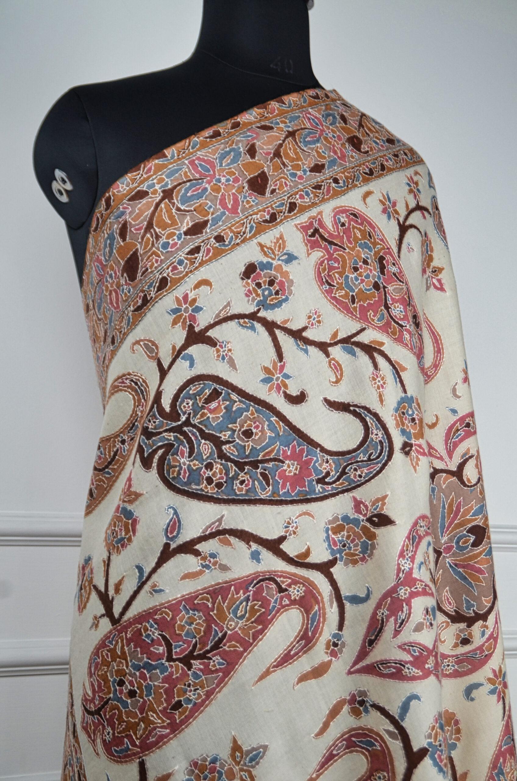 The Heritage Ivory Paisley Shawl blends Kashmiri finesse with understated elegance. Crafted on a soft ivory-toned wool base, this shawl features beautifully detailed paisleys and floral vines outlined in delicate Sozni inspired needlework. The muted palette dusty rose, slate blue, walnut brown, and soft tan creates a sophisticated, heritage-inspired aesthetic reminiscent of classical Kashmiri Kalamkari patterns. Lightweight yet warm, this shawl drapes gracefully, making it ideal for both casual refinement and traditional wear. An embodiment of timeless artistry, it brings together comfort, craftsmanship, and culture in every thread.