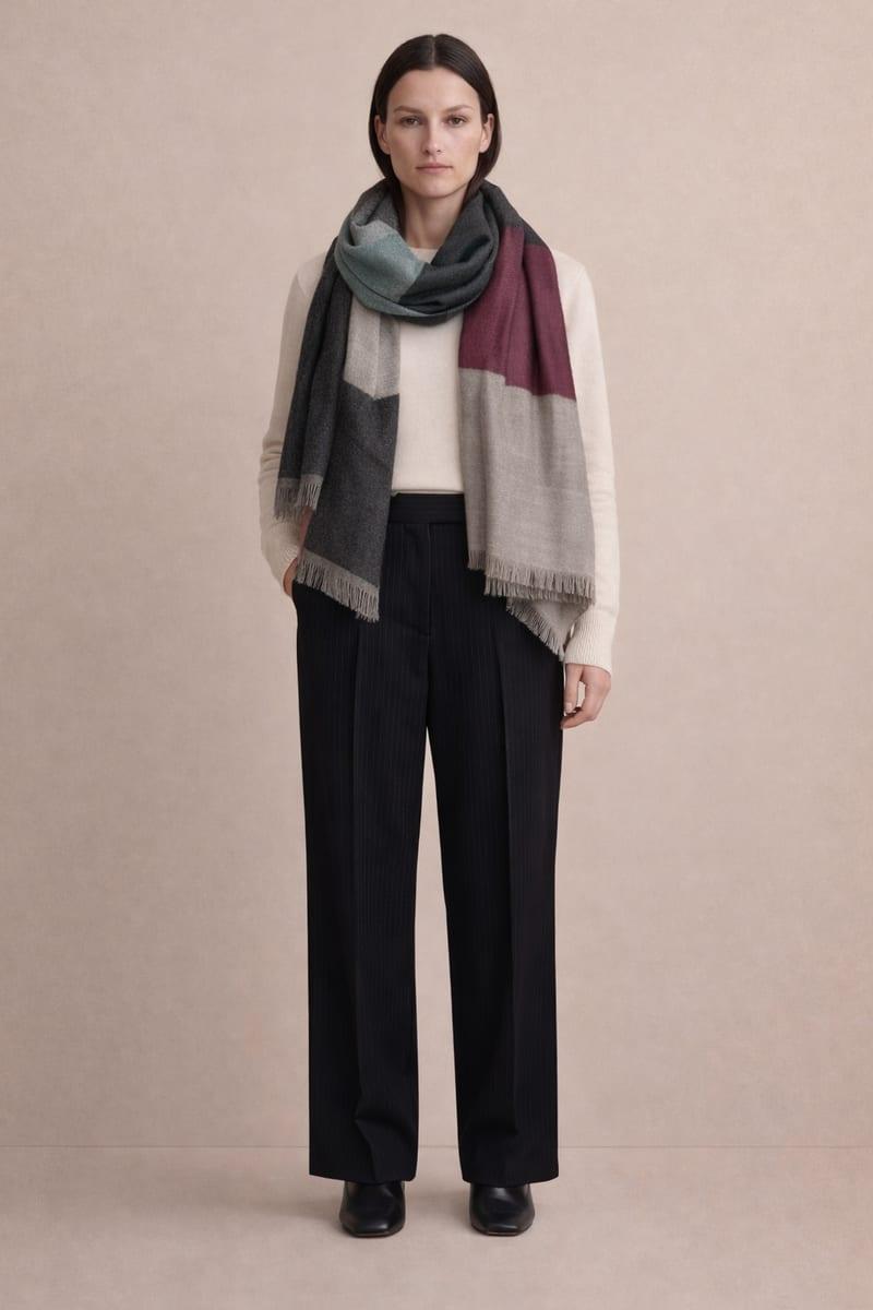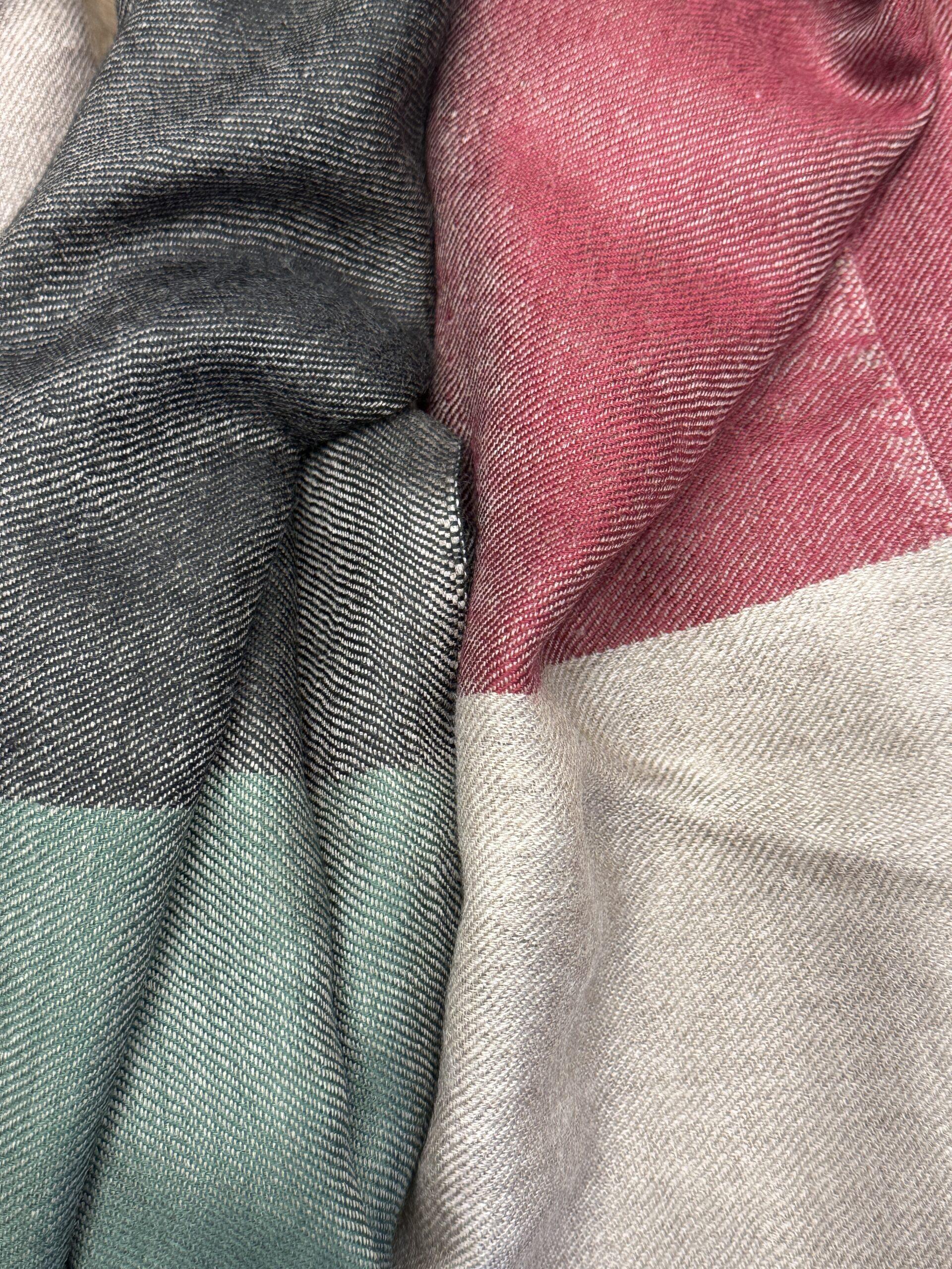 Crafted from the finest cashmere, this scarf features a color block design that harmoniously blends muted shades of maroon, green, and grey with a warm beige base. The thoughtful combination of jewel tones creates a versatile piece that can effortlessly transition from day to night. Every detail reflects the artistry involved in handweaving, ensuring that each scarf is not only a functional accessory but also a distinguished piece of art.
