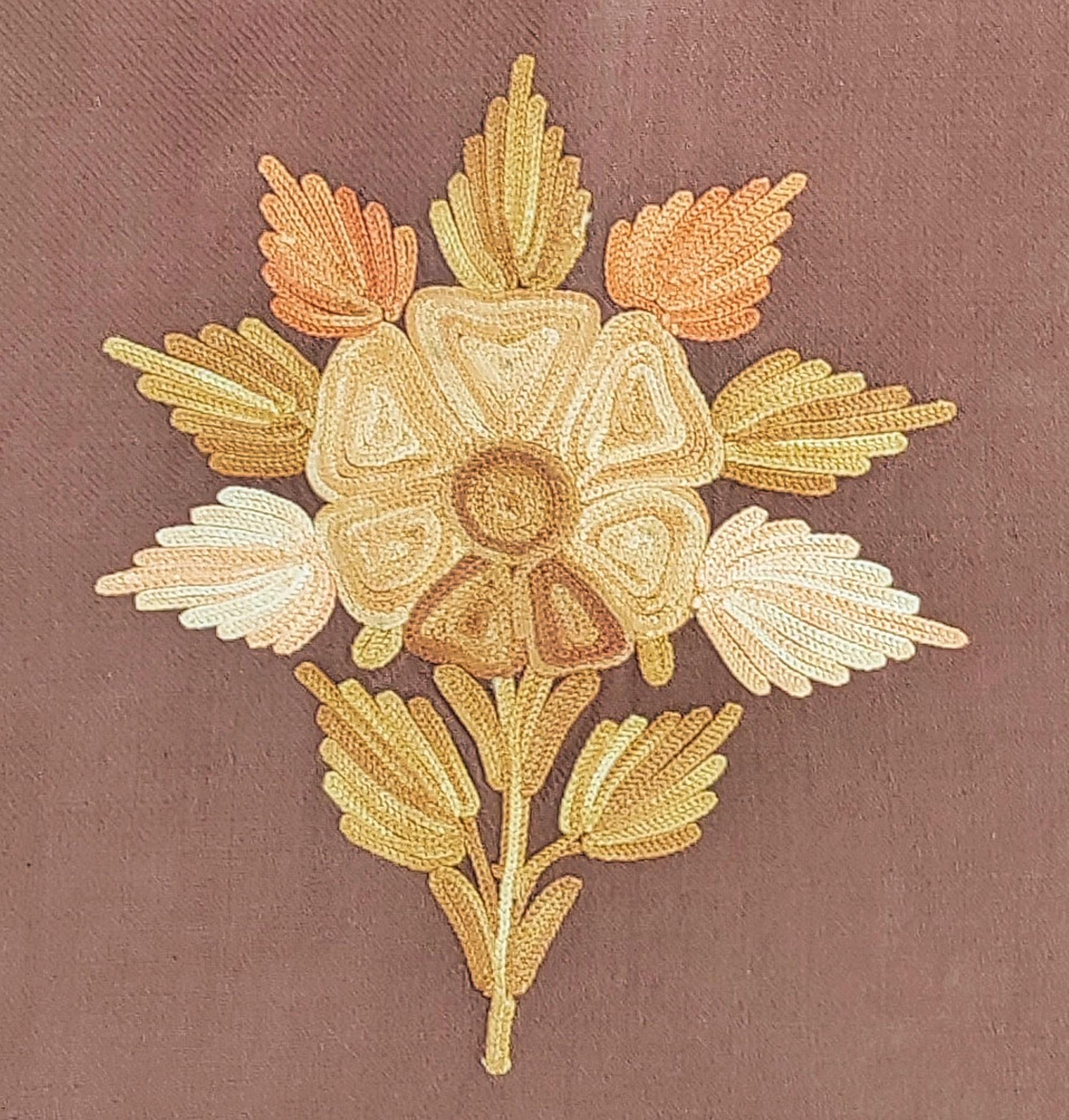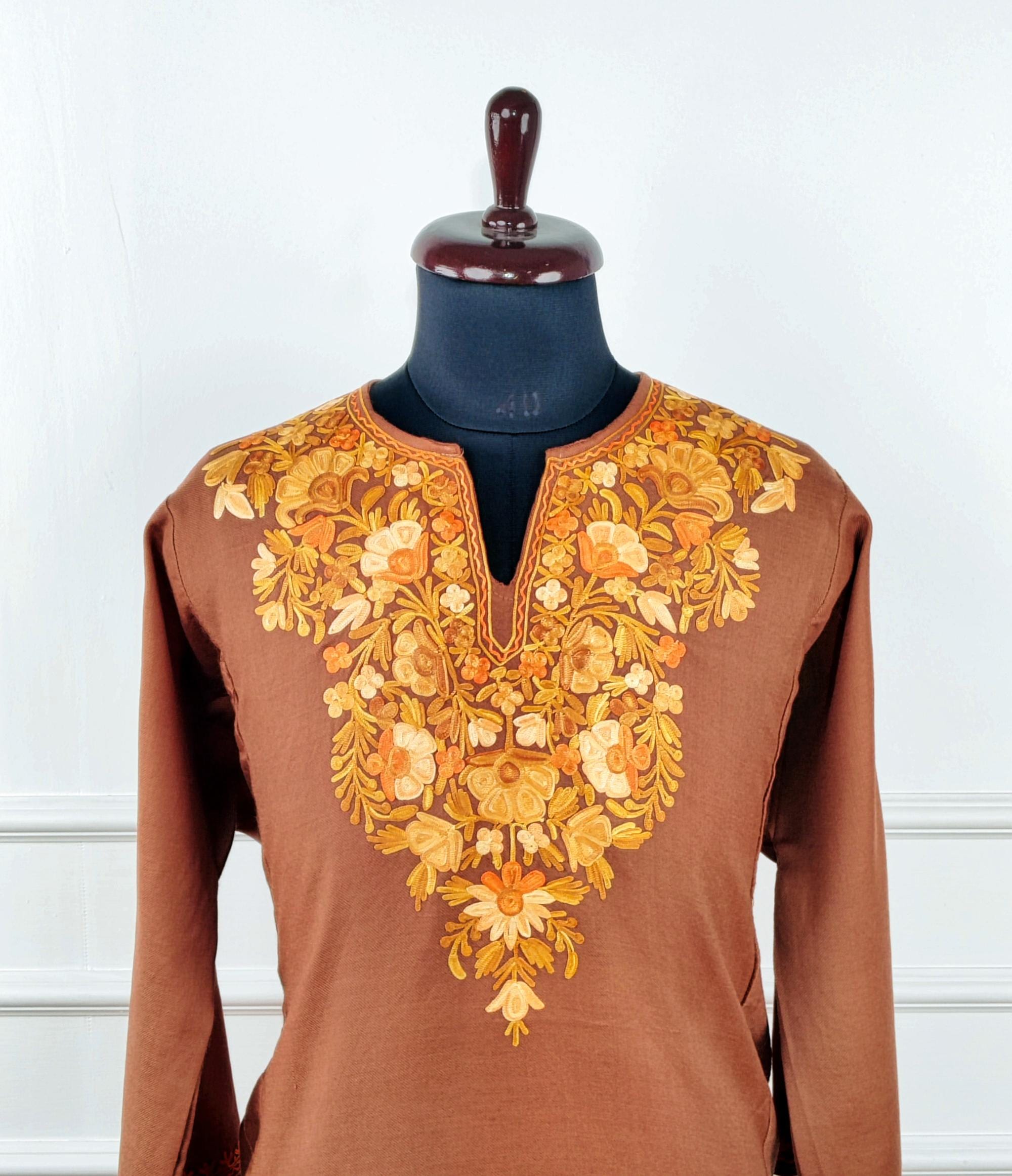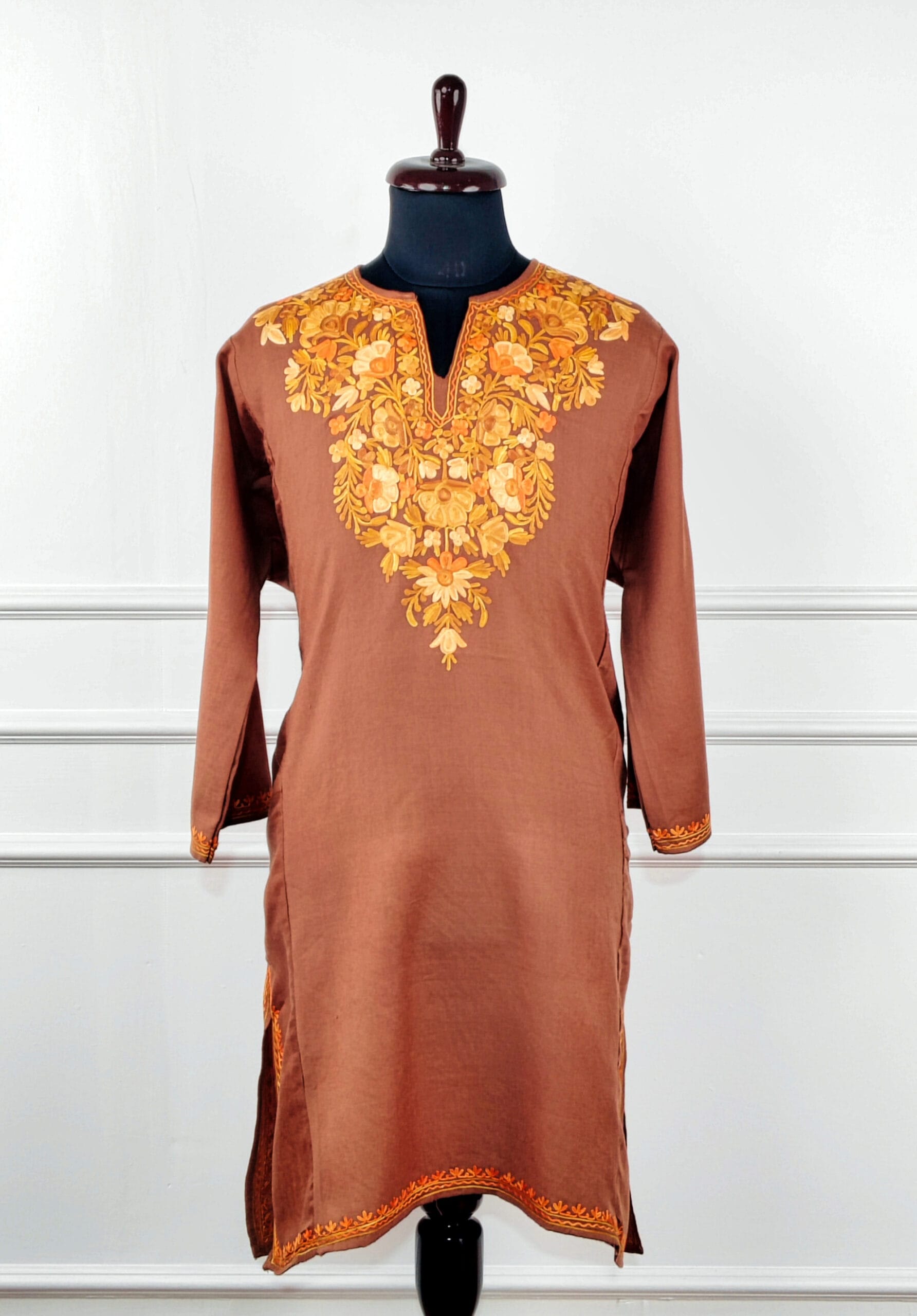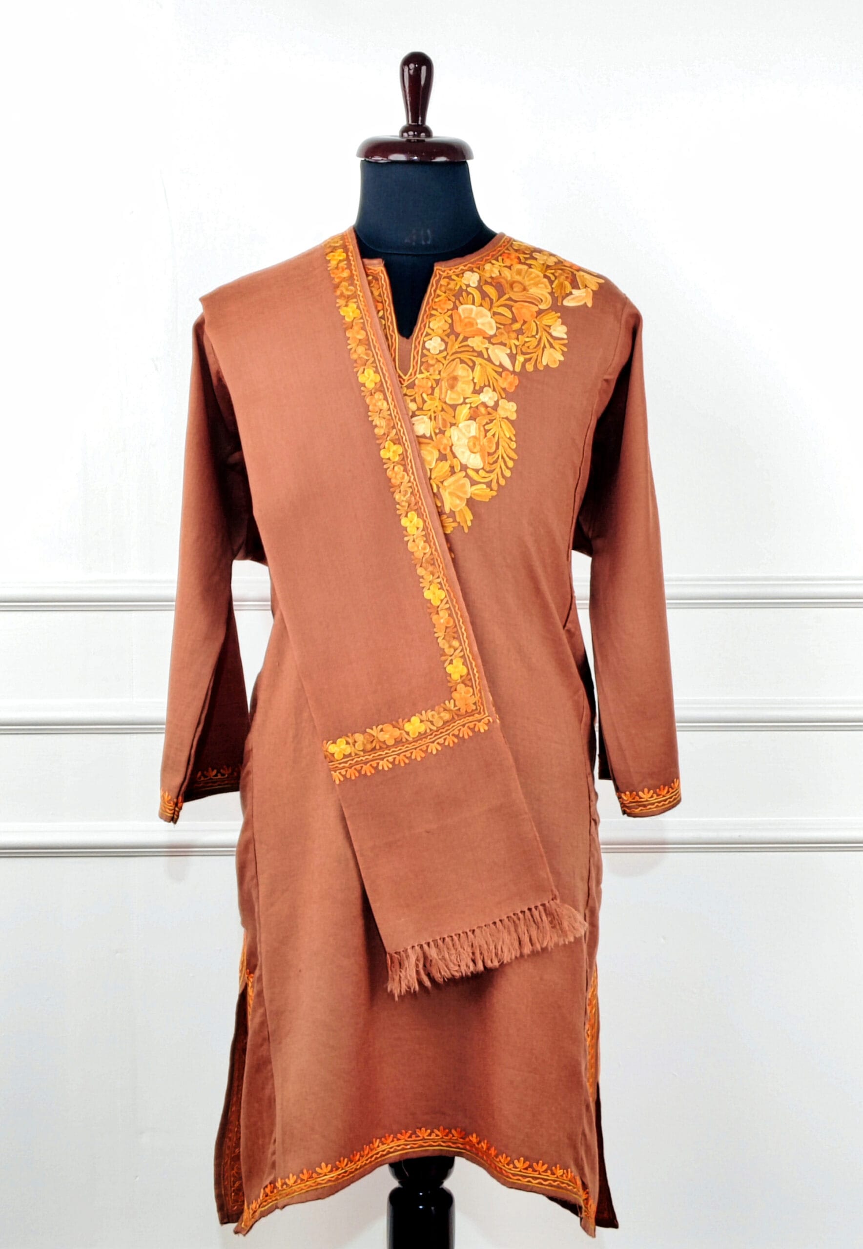 Khizaan-e-Zar is an elegant Kashmiri Aari Embroidered Pheran crafted from warm, finely woven wool, inspired by the golden warmth of autumn landscapes. The pheran features a rich warm brown base with subtle copper undertones, creating a grounded and refined canvas. Intricate Aari embroidery is concentrated around the neckline, forming dense floral motifs in luminous shades of marigold, honey gold, and soft amber. The embroidery flows downward in a balanced, symmetrical composition, while minimal detailing at the cuffs and hemline keeps the silhouette clean and graceful. This pheran reflects timeless Kashmiri craftsmanship, offering understated luxury and winter comfort.