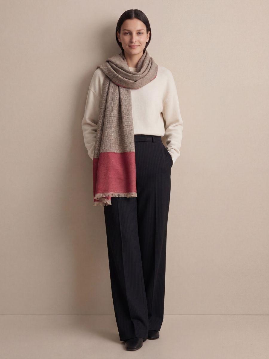 A graceful blend of tradition and modern minimalism, this handwoven Kashmiri cashmere scarf is crafted for effortless everyday elegance. The upper body features a refined micro-textured weave in soft greige tones, giving it a calm, neutral sophistication, while the bold crimson-laal colour-block border adds a striking finish. Woven by artisans in Kashmir using fine cashmere, this scarf feels feather-light yet warm, draping beautifully around the neck or shoulders. Finished with delicate fringed edges, it’s a timeless winter essential that pairs perfectly with both classic and contemporary wardrobes.