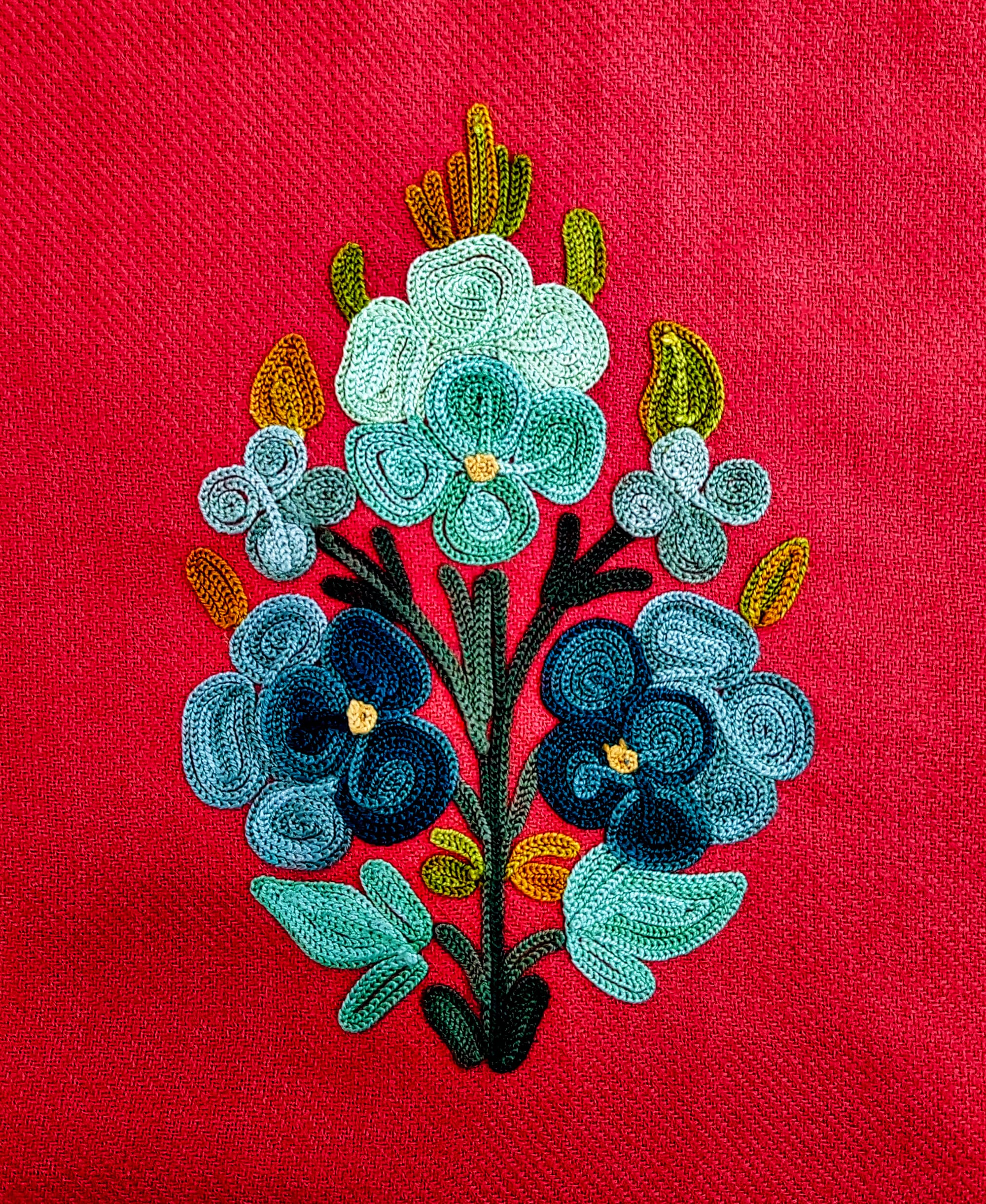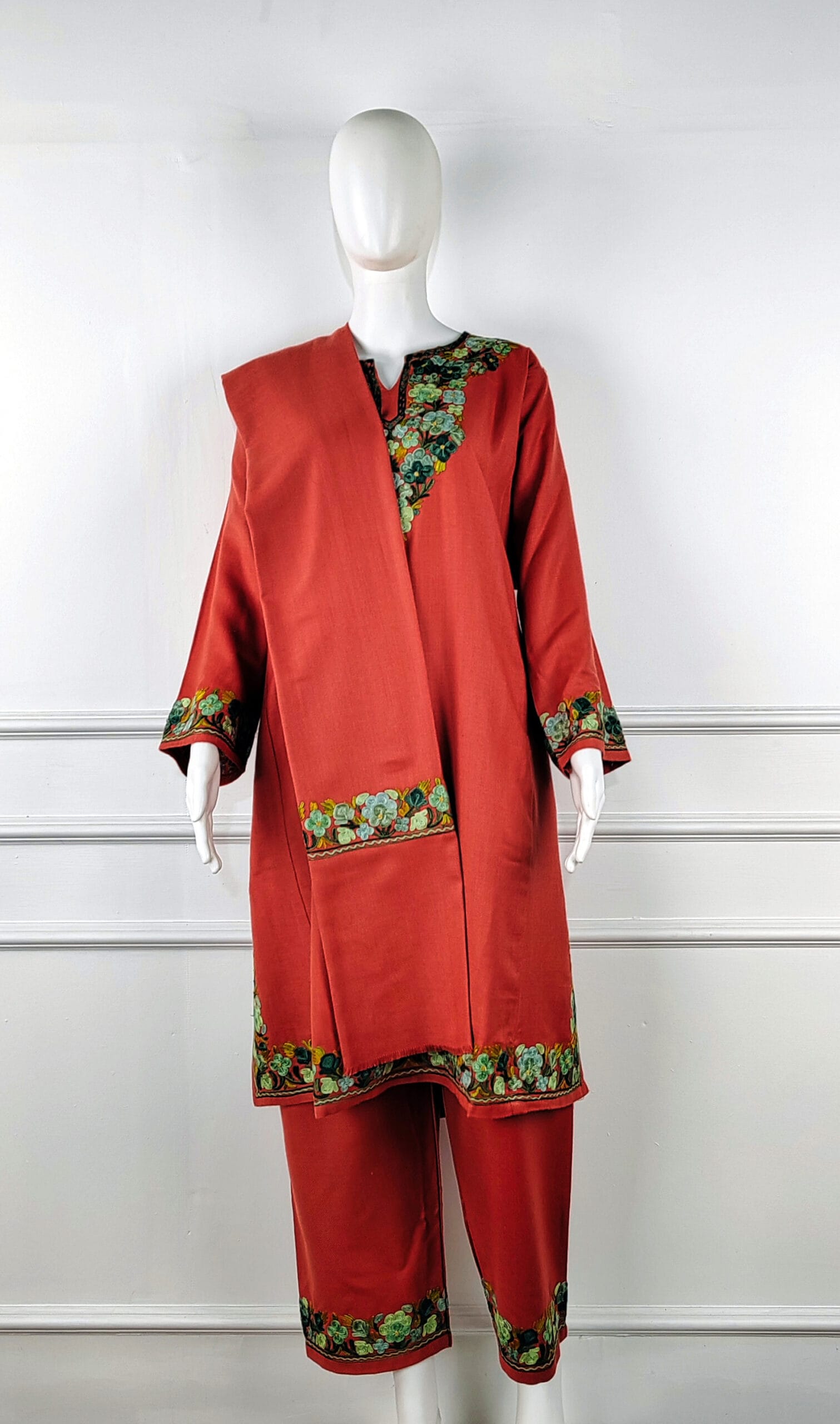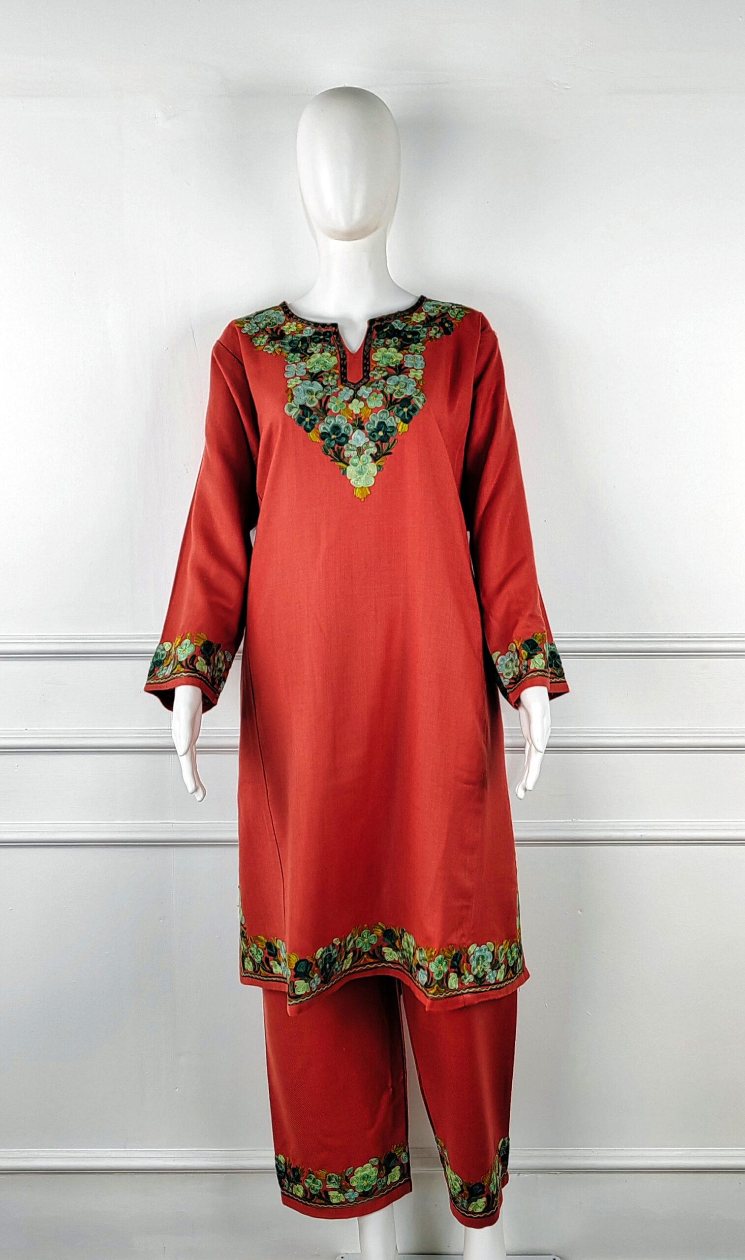 Mehr-e-Surkh is a distinguished Kashmiri Aari Embroidered Pheran crafted from warm, finely woven wool, embodying radiance, depth, and heritage elegance. The pheran features a rich brick-red base, evoking warmth and intensity, beautifully balanced by intricate Aari embroidery. Floral motifs in layered shades of sage green, olive, and soft teal adorn the neckline, sleeve cuffs, and hemline, creating a harmonious contrast reminiscent of sunlit gardens against earthen tones. The classic straight-cut pheran silhouette ensures comfort and graceful drape, while the thoughtfully placed embroidery highlights the finesse of Kashmiri craftsmanship, making this piece a timeless winter garment with a bold yet refined presence.