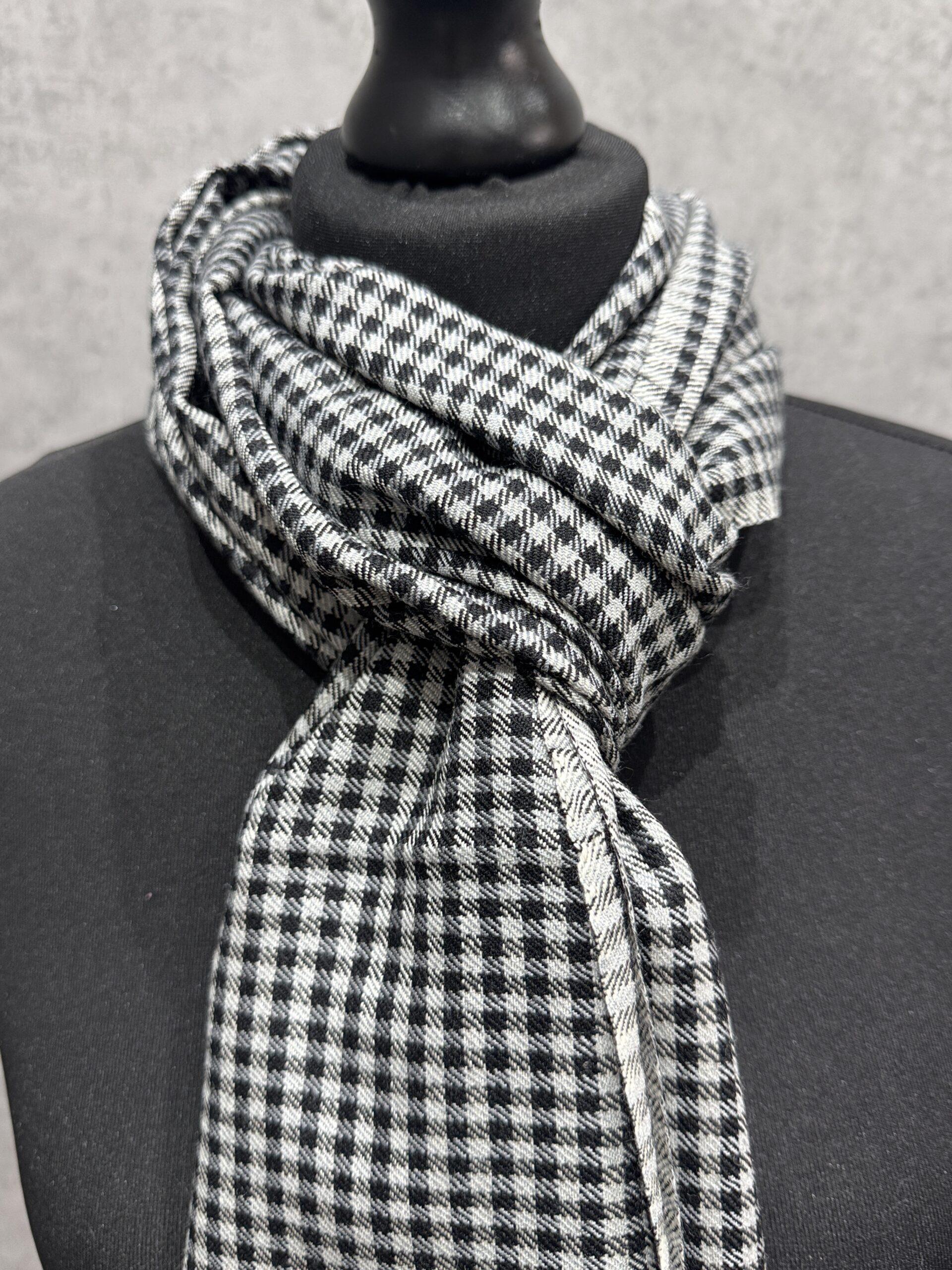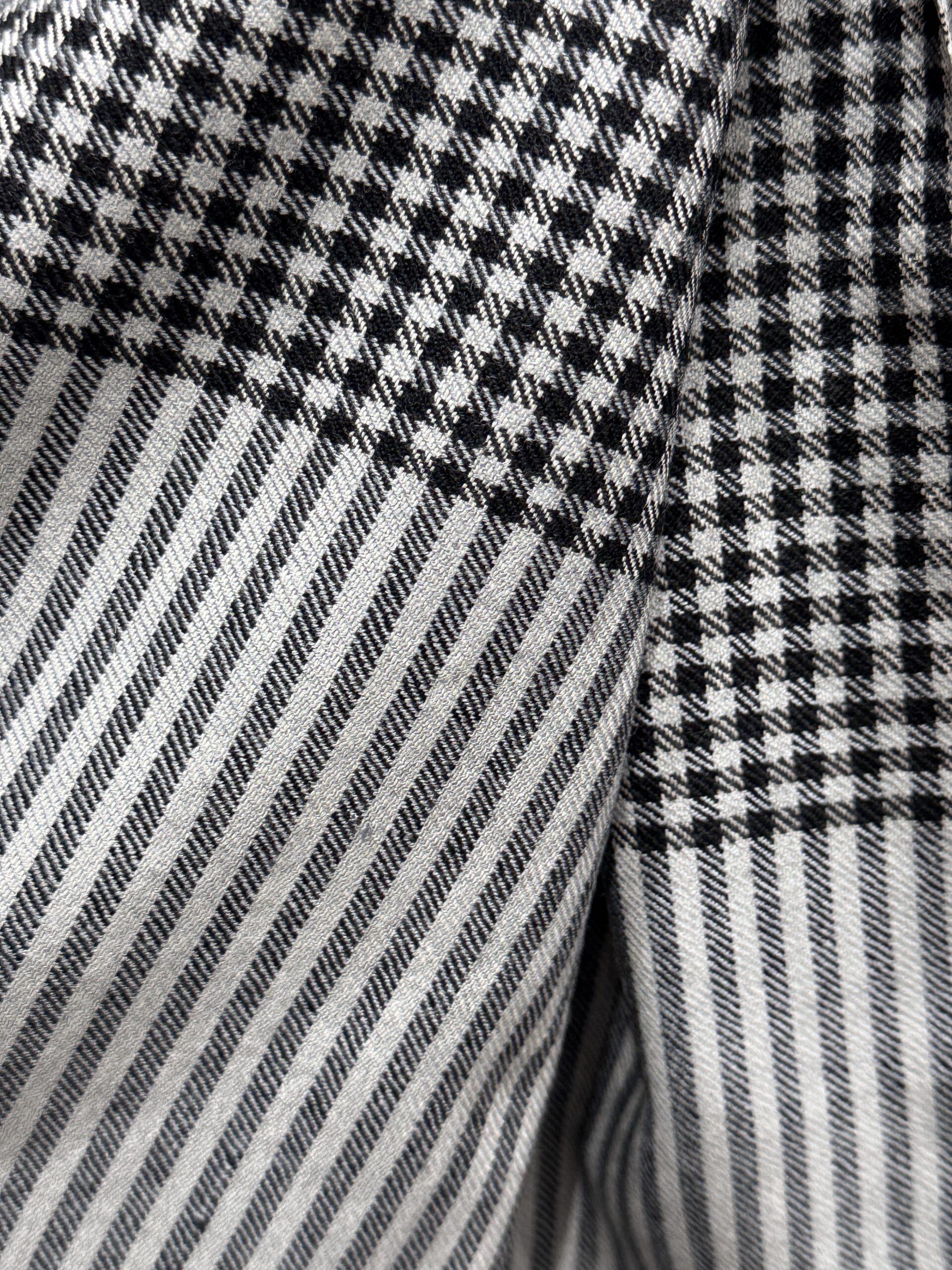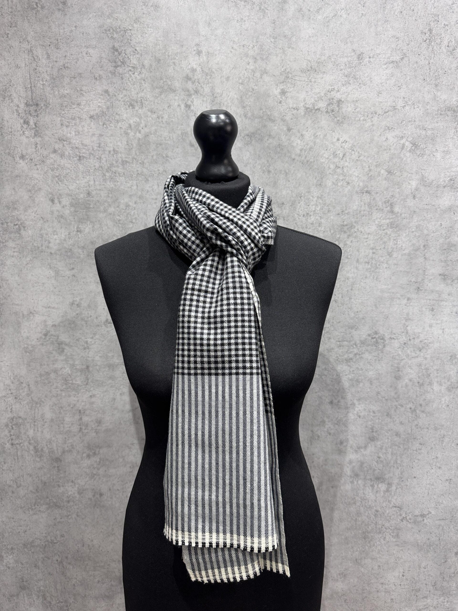 Embodying sophistication and timeless masculine elegance, the Midnight Matrix Wool Scarf is a hand-woven Kashmiri masterpiece crafted from 100% pure wool. Its striking interplay of deep charcoal tones, refined checks, and linear stripes creates a bold modern aesthetic while maintaining the softness and warmth expected from fine Kashmiri wool. Designed for men who appreciate subtle luxury, this scarf blends classic craftsmanship with contemporary style perfect for formal wear, winter layering, or elevating everyday outfits.