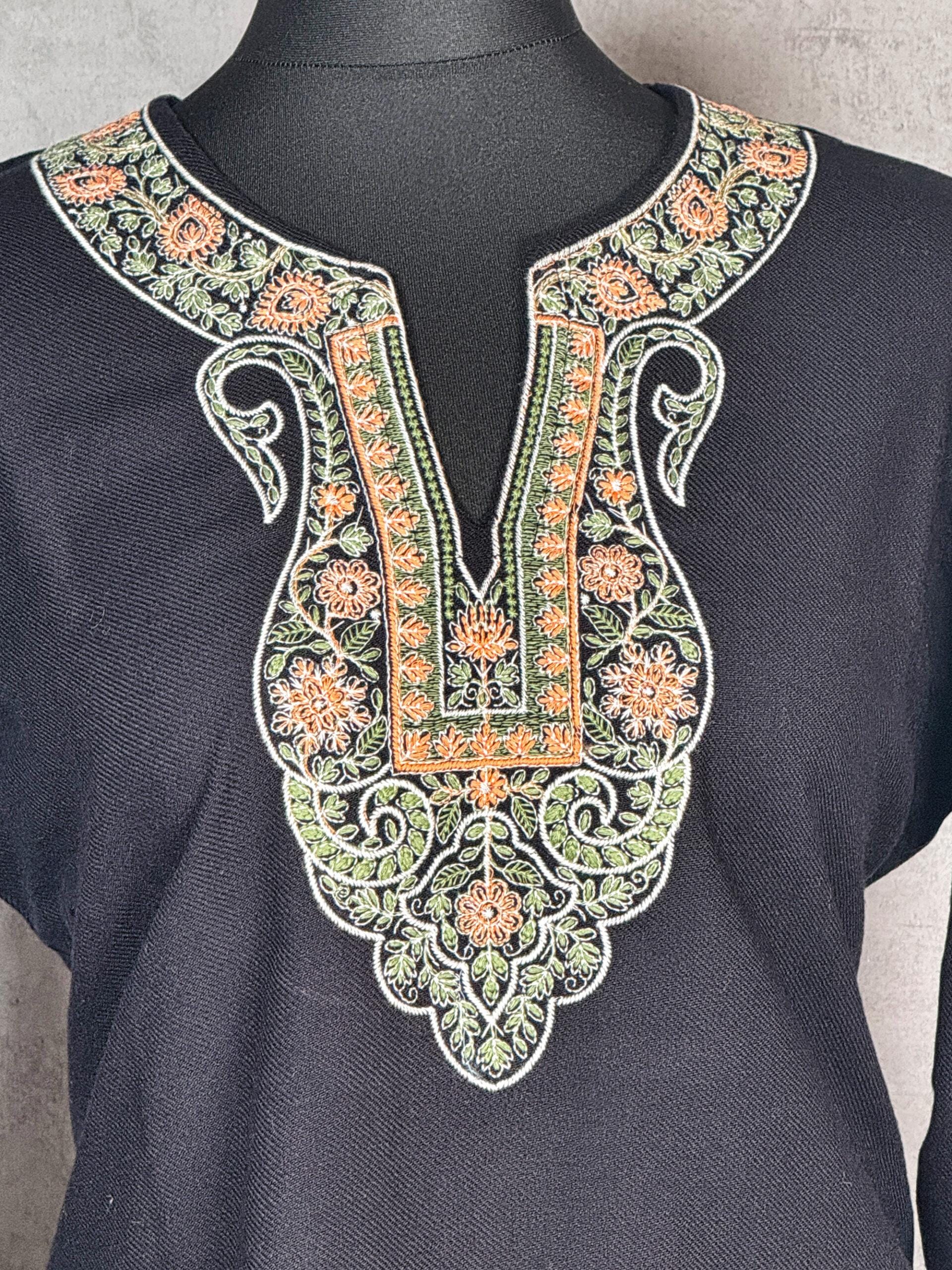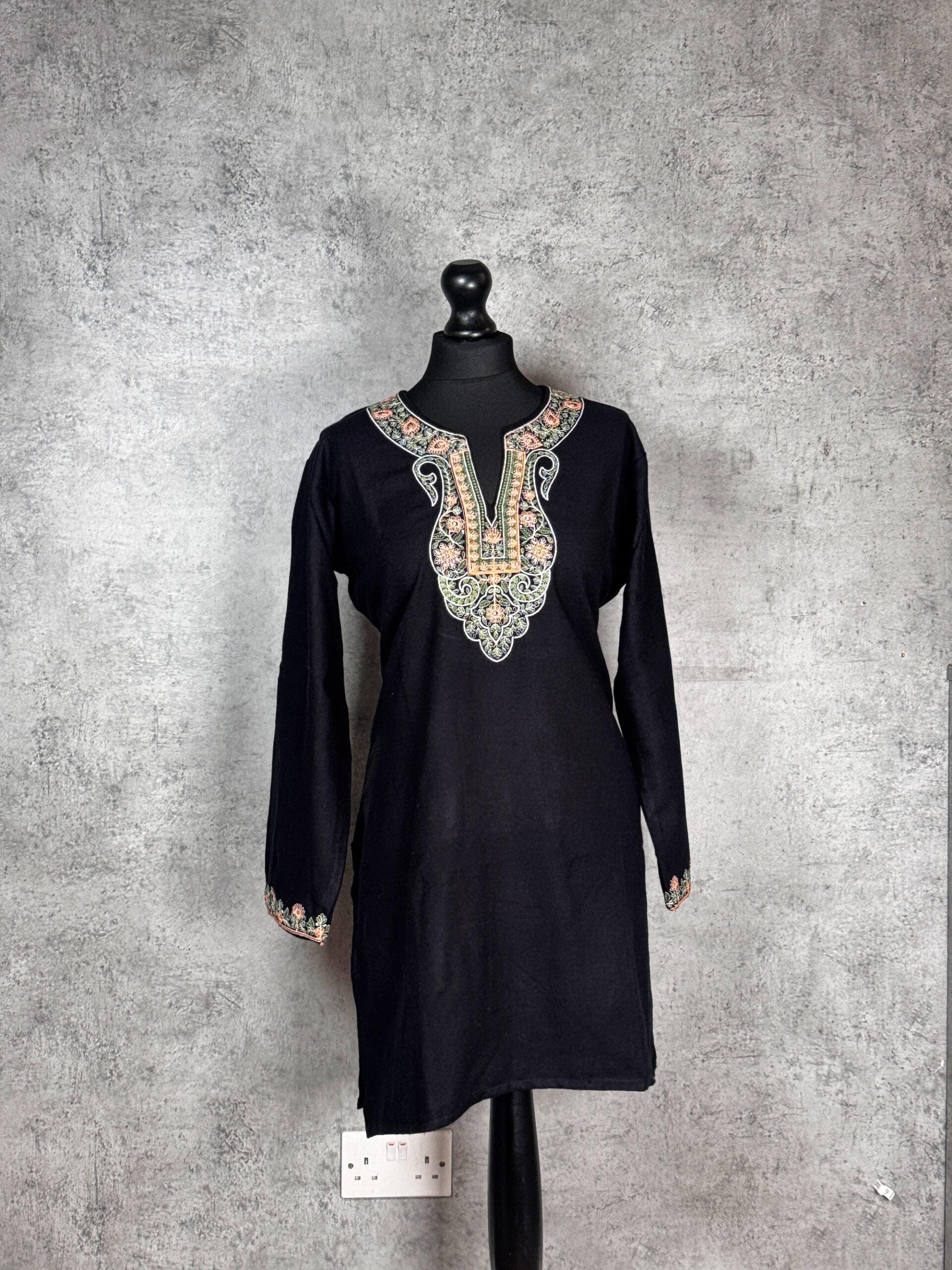 Midnight Zayra Kashmiri Short Kurti is a timeless expression of Kashmiri artistry set against a deep, inky black base. Crafted in soft, breathable fabric, this short kurti features intricate hand-done aari embroidery inspired by traditional vine and floral motifs. The embroidery blooms gracefully around the neckline and cuffs, creating a striking contrast that feels both regal and refined. Designed for effortless elegance, this kurti transitions seamlessly from day gatherings to evening occasions, celebrating heritage with a contemporary silhouette.