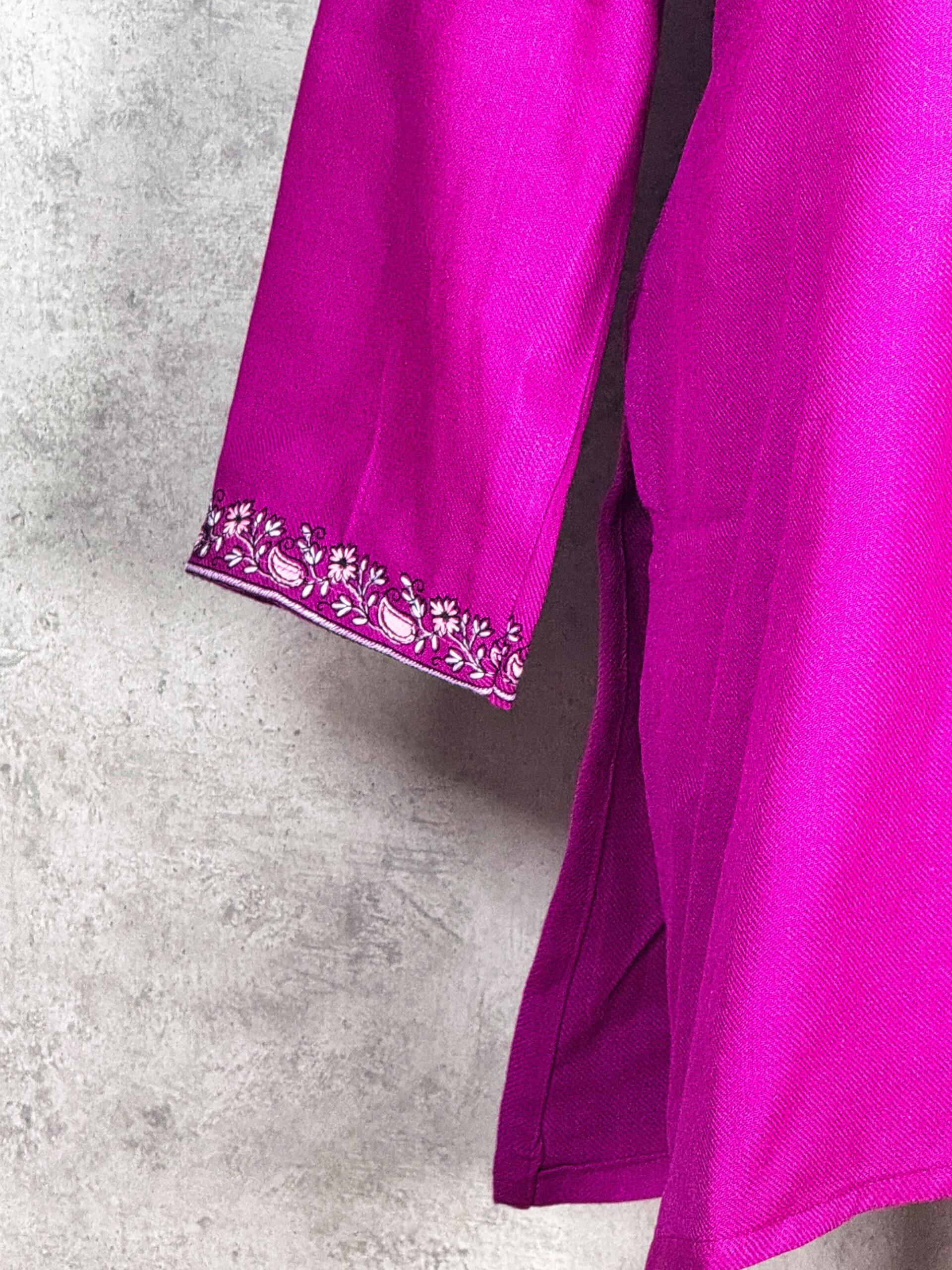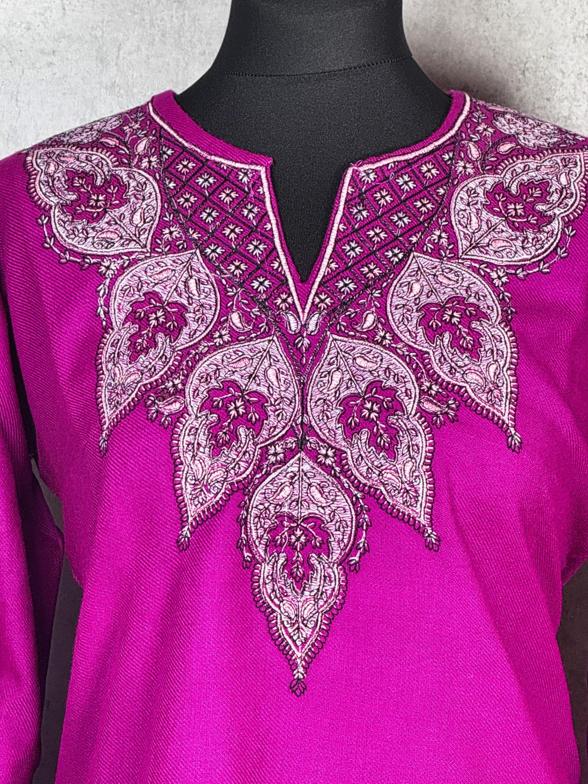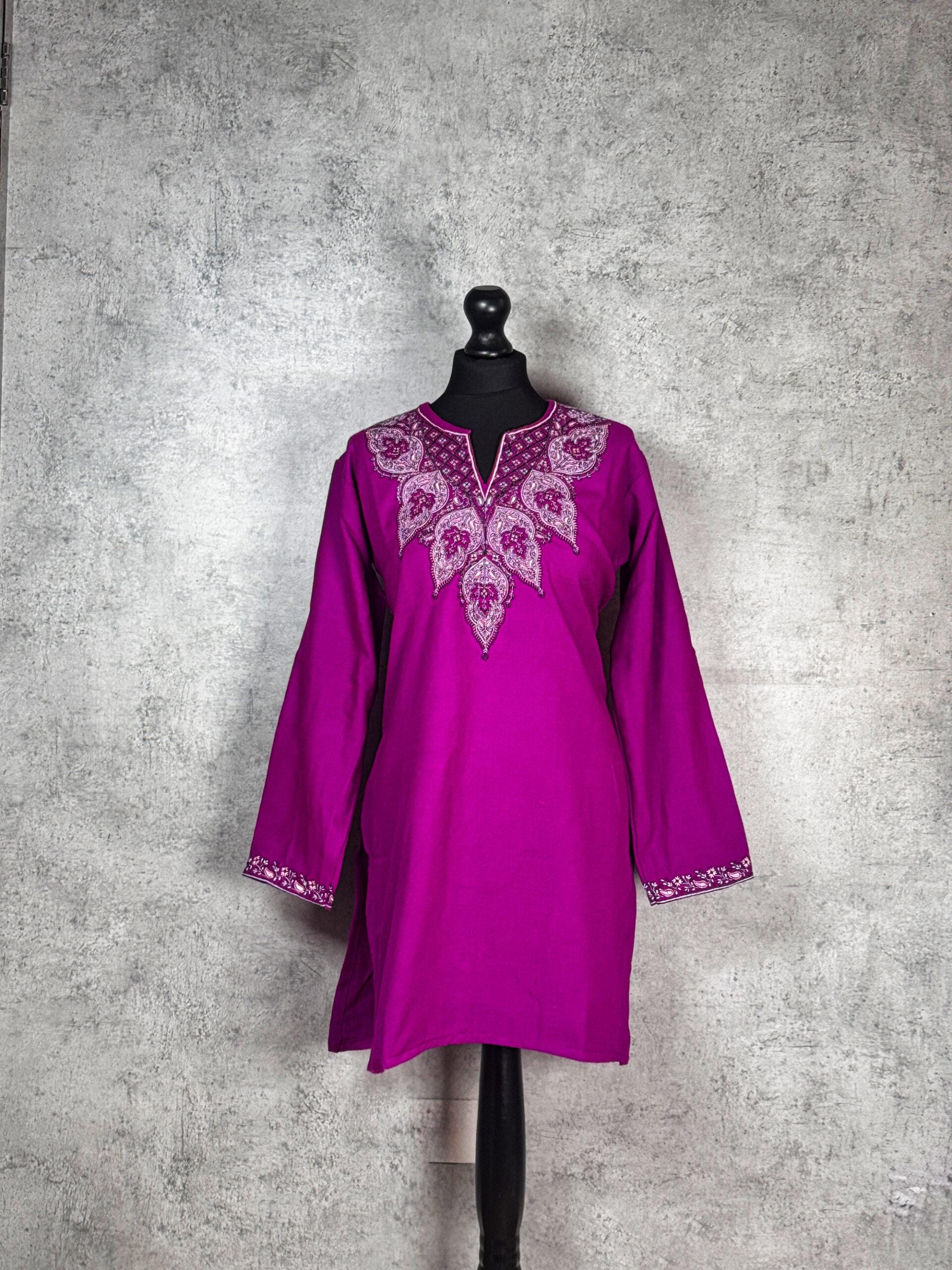 Elegant and quietly radiant, the Moonflower Kashmiri Kurti is a refined Kashmiri short kurti inspired by the serene beauty of night-blooming florals. Crafted from warm, comfortable Acrowool with a machine-woven base, this kurti features intricate Aari-style paisley and floral embroidery delicately arranged across the neckline. The embroidery unfolds like a moonlit bloom ornate yet balanced reflecting classic Kashmiri artistry with a soft, graceful presence. Finished with finely embroidered sleeve cuffs, this kurti is ideal for winter wear, festive evenings, or elevated everyday styling, offering a harmonious blend of heritage craftsmanship and timeless elegance.