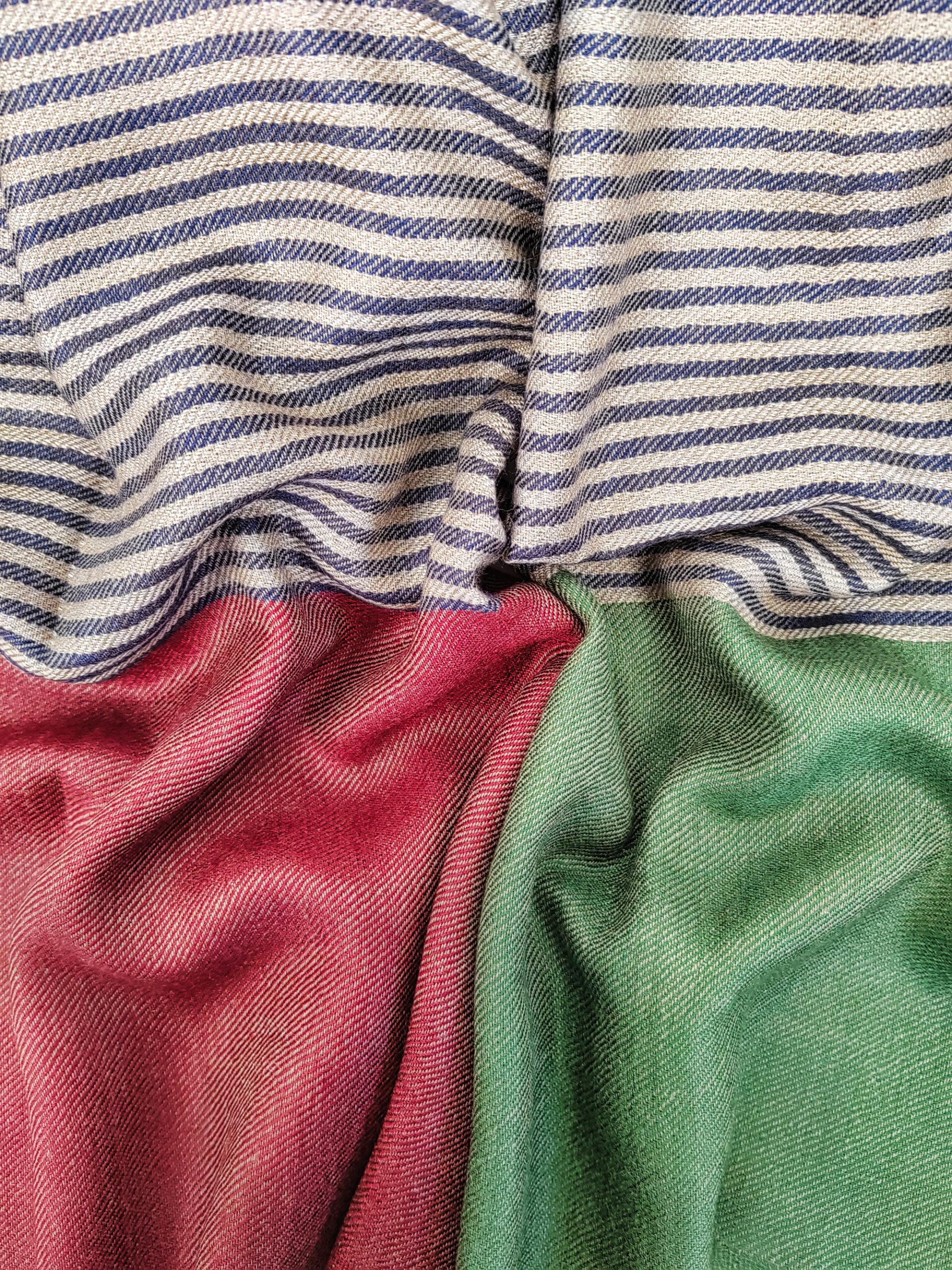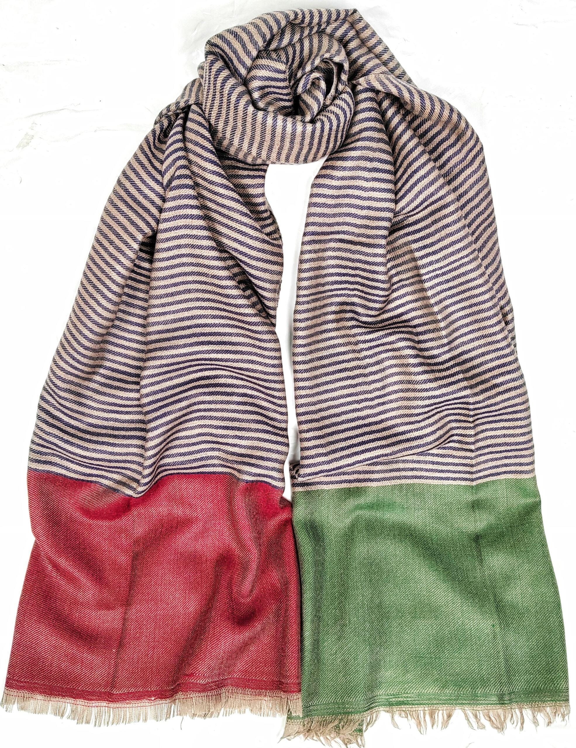 Nava Stripe is a bold yet beautifully balanced handwoven Kashmiri cashmere scarf, designed with fine horizontal pinstripes that feel modern, minimal, and endlessly wearable. The soft beige base is layered with deep navy striping, creating a calm, tailored look while the contrasting colour-block ends in crimson red and forest green add a distinctive artisan touch. Lightweight yet warm, this scarf is a refined statement piece that drapes effortlessly and celebrates the timeless value of handloom craftsmanship.