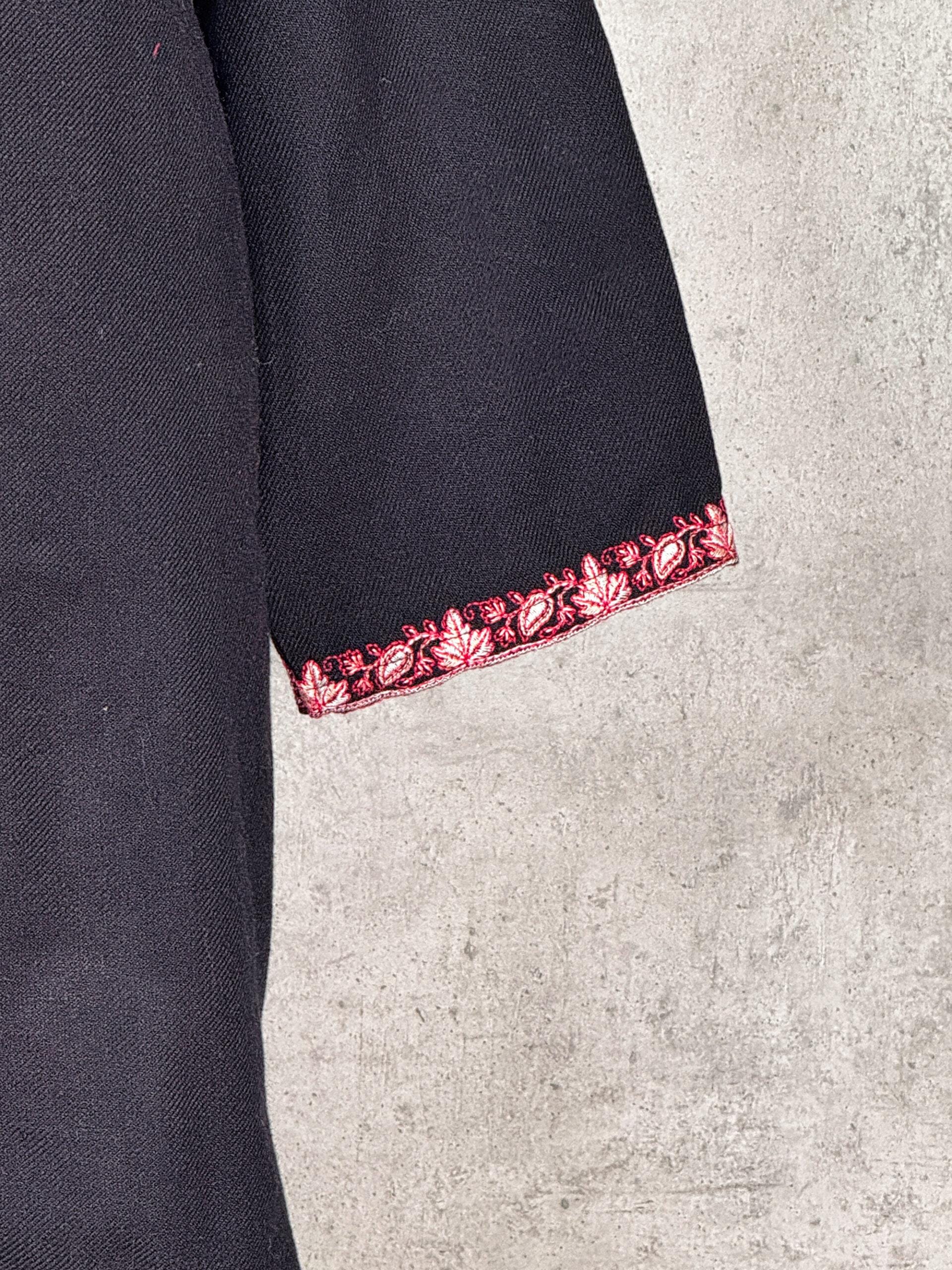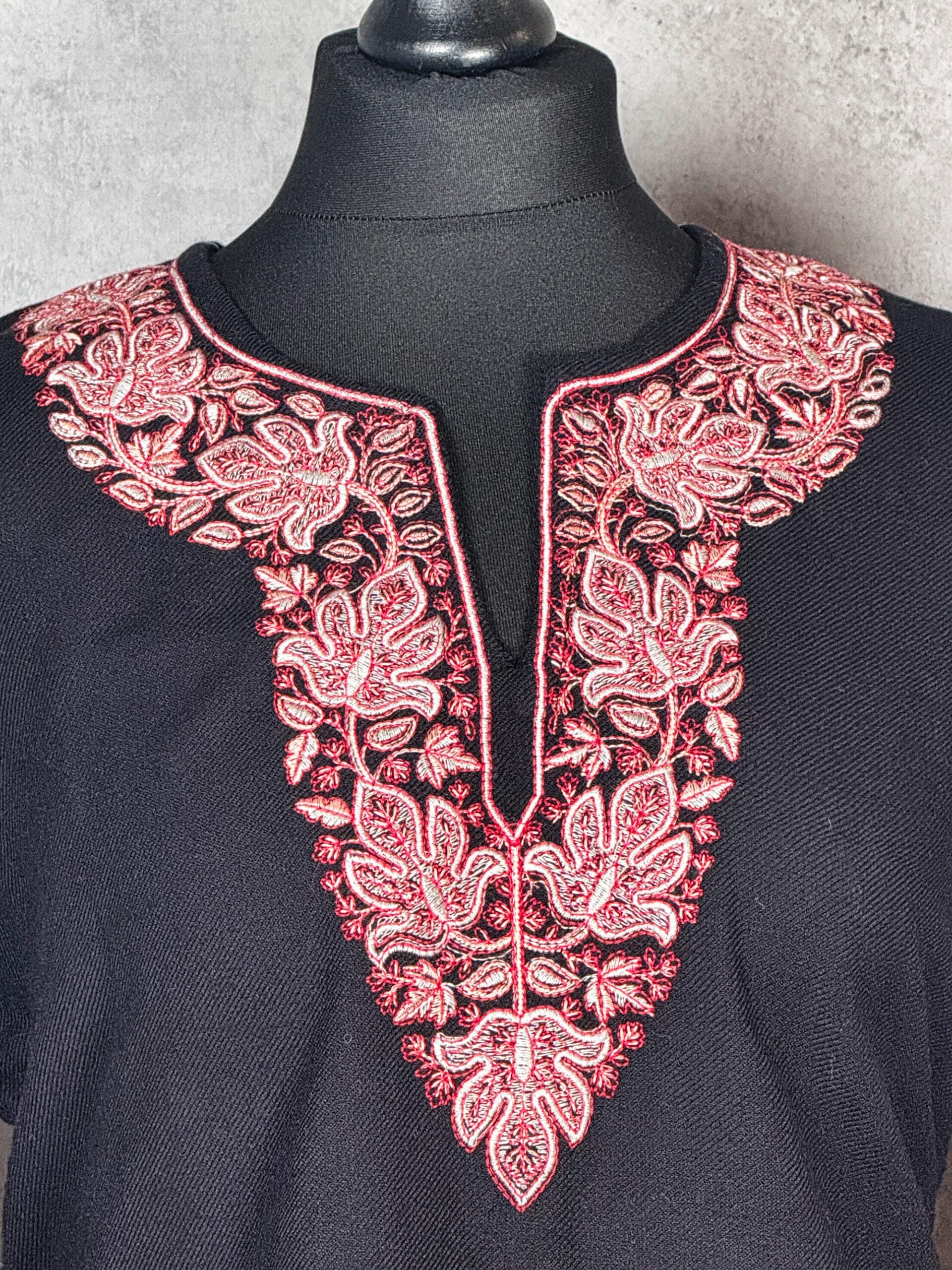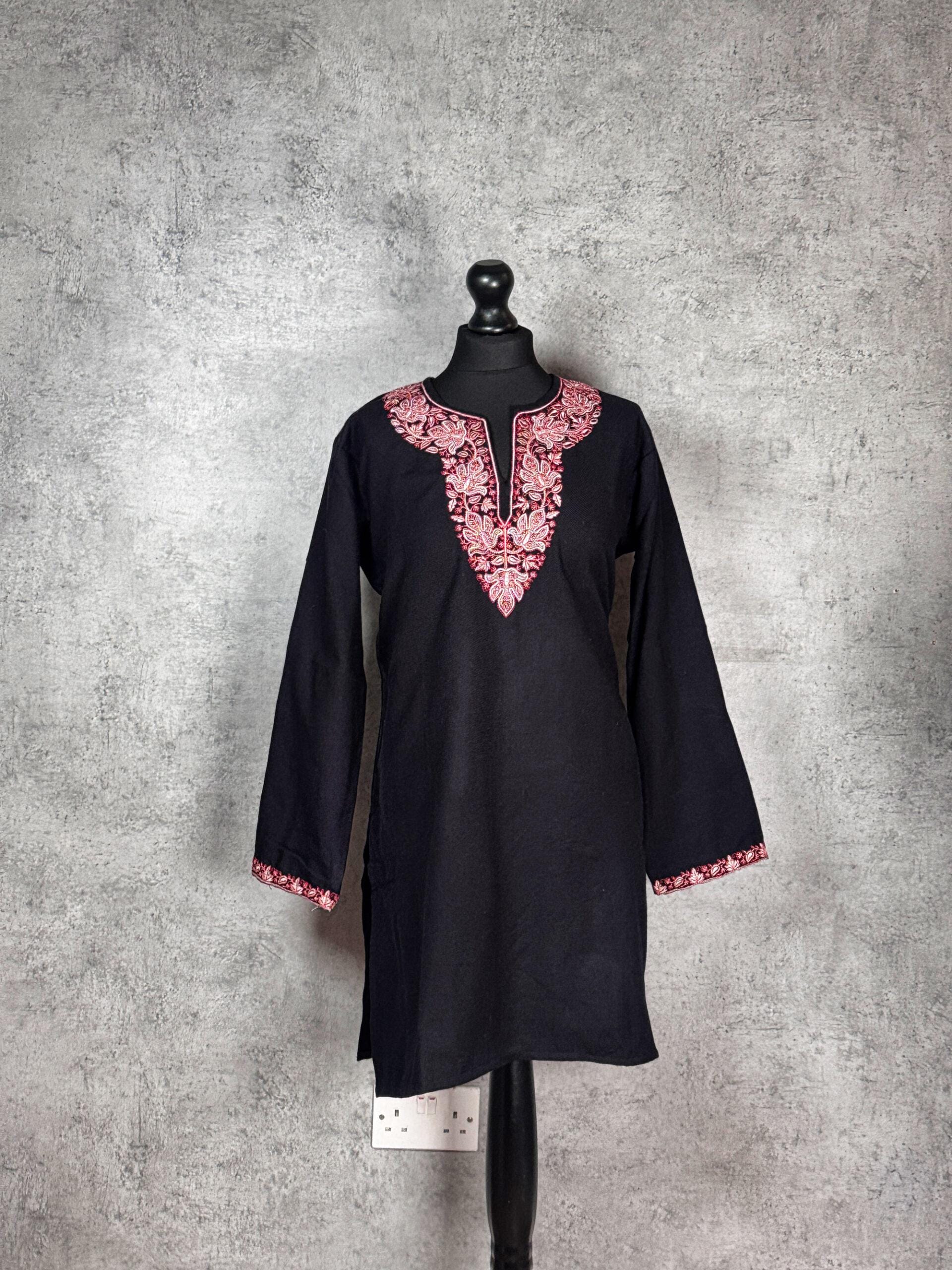 Nocturne Bloom Kashmiri Short Kurti captures the quiet elegance of twilight gardens through refined Kashmiri craftsmanship. Set against a deep, dark base, the kurti is adorned with intricate hand-done aari embroidery blooming across the neckline in a graceful floral arrangement. The detailed vine-and-petal motifs create a striking contrast, while the balanced short kurti silhouette ensures effortless wearability. Thoughtfully finished with embroidered sleeve cuffs, this piece reflects timeless artistry perfect for evenings, cultural gatherings, or elevated everyday dressing.