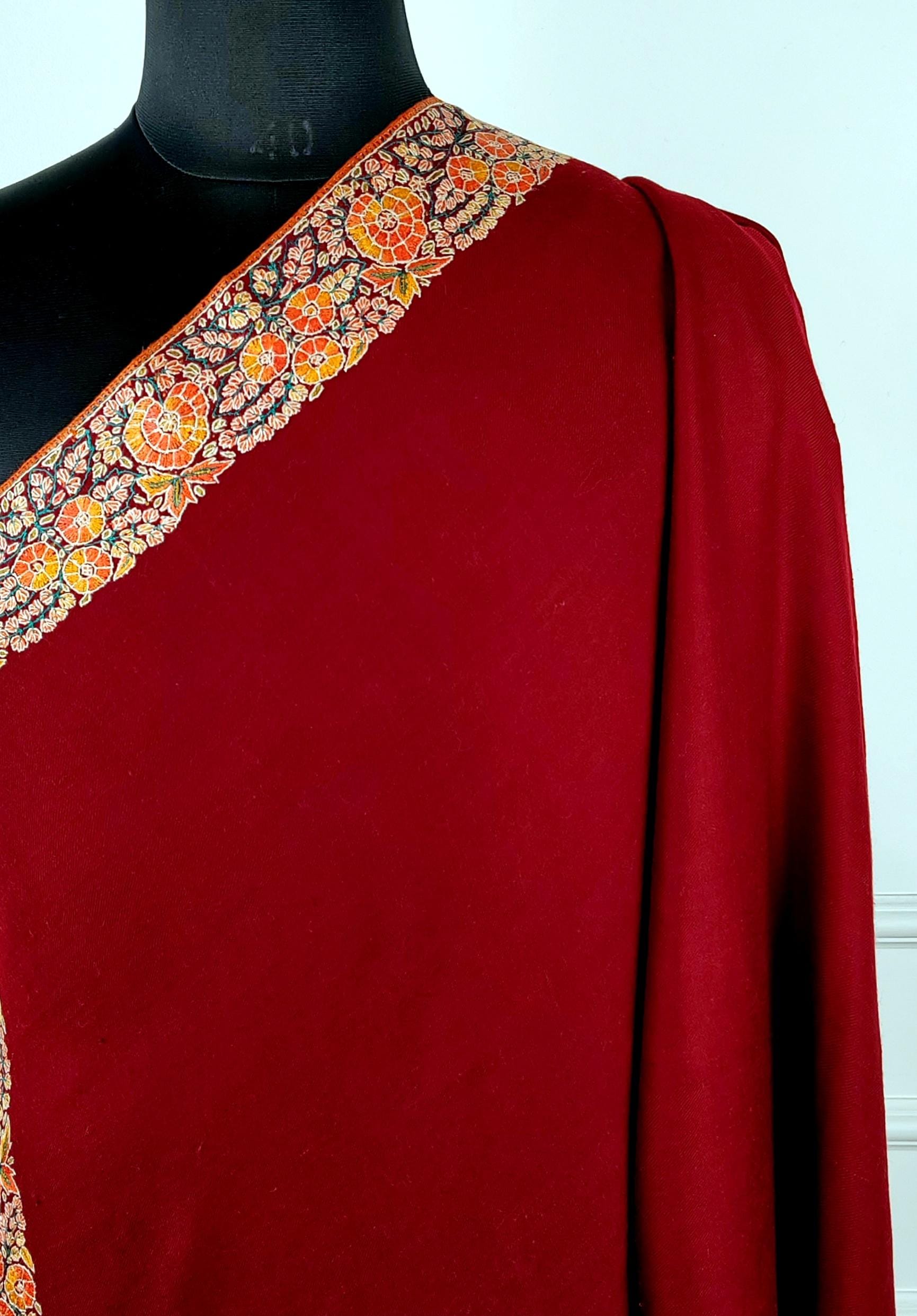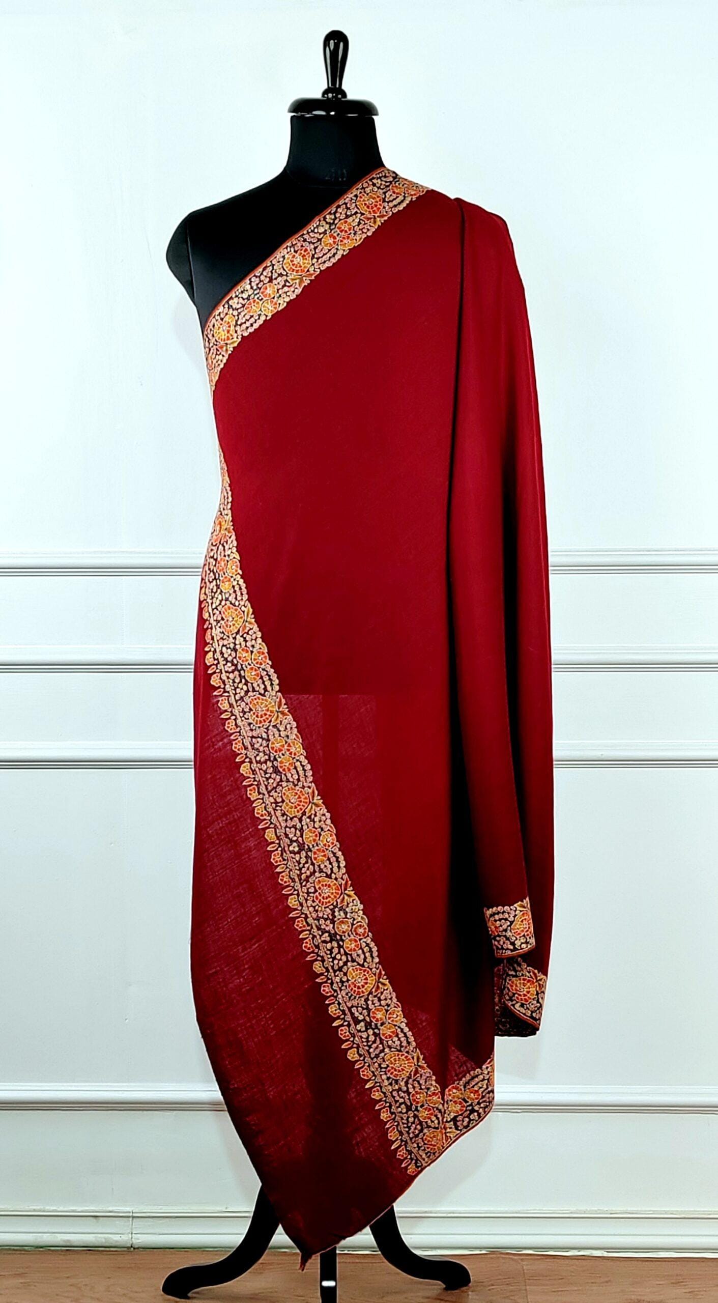 The Noor-e-Zar Sozni Shawl is an exquisite Kashmiri women’s shawl created as a celebration of opulence, tradition, and feminine grace. Crafted from super fine Merino wool, the shawl offers a luxuriously soft texture with a fluid drape that enhances its regal presence. The base fabric is machine woven, providing a smooth, consistent canvas that allows the embroidery to take centre stage. What sets this shawl apart is its extensive and ornate Sozni hand embroidery, featuring richly detailed floral and paisley-inspired motifs. The embroidery flows diagonally across the shawl, framing the silhouette with rhythmic elegance and visual movement. This piece embraces abundance, dense floral borders, accent motifs, and finely finished cuffs that echo traditional Kashmiri bridal and festive aesthetics. Designed for women who appreciate heirloom-quality textiles, this shawl is ideal for weddings, formal gatherings, winter soirées, and ceremonial occasions. It is not merely an accessory, but a statement of heritage, artistry, and timeless luxury.