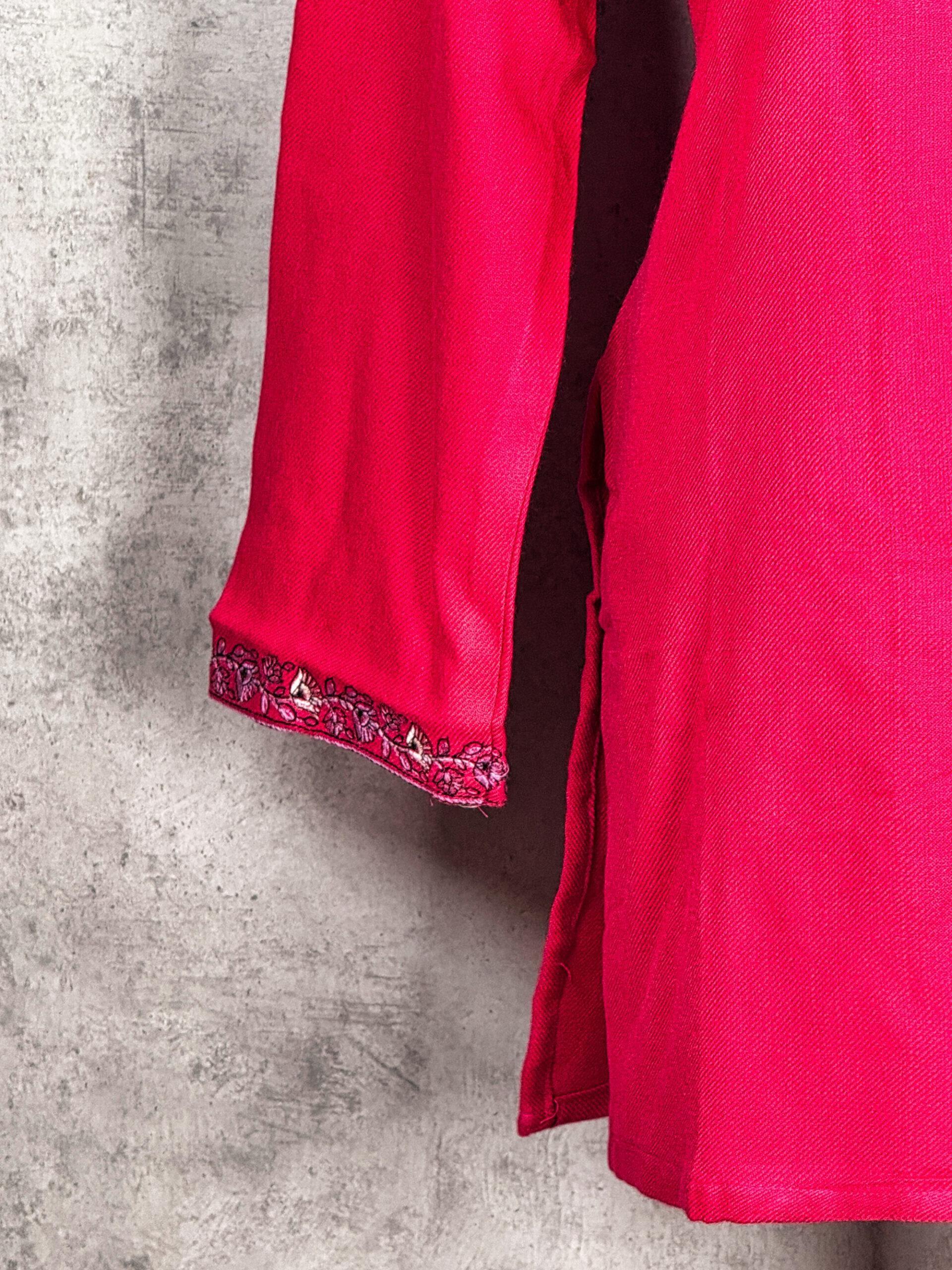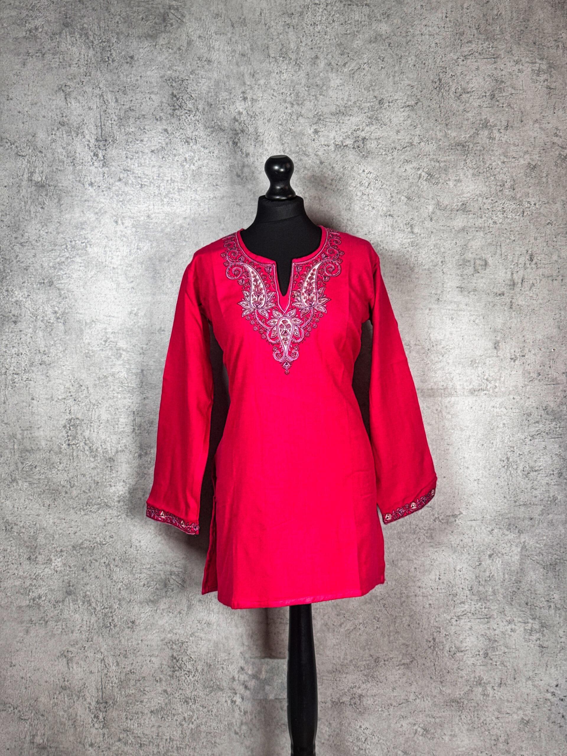 Gracefully echoing the decorative traditions of Kashmir, the Ornate Bloom Kashmiri Short Kurti is a refined Kashmiri short kurti crafted from warm, comfortable Acrowool with a machine-woven base. The kurti is adorned with intricate Aari-style paisley and floral embroidery flowing elegantly around the neckline an homage to classic Kashmiri ornamental design. Subtle embroidered detailing on the sleeve cuffs adds balance and finesse to the overall silhouette. Designed for winter comfort and timeless appeal, this kurti is ideal for cultural gatherings, festive moments, or elevated everyday wear, blending heritage-inspired artistry with modern practicality.