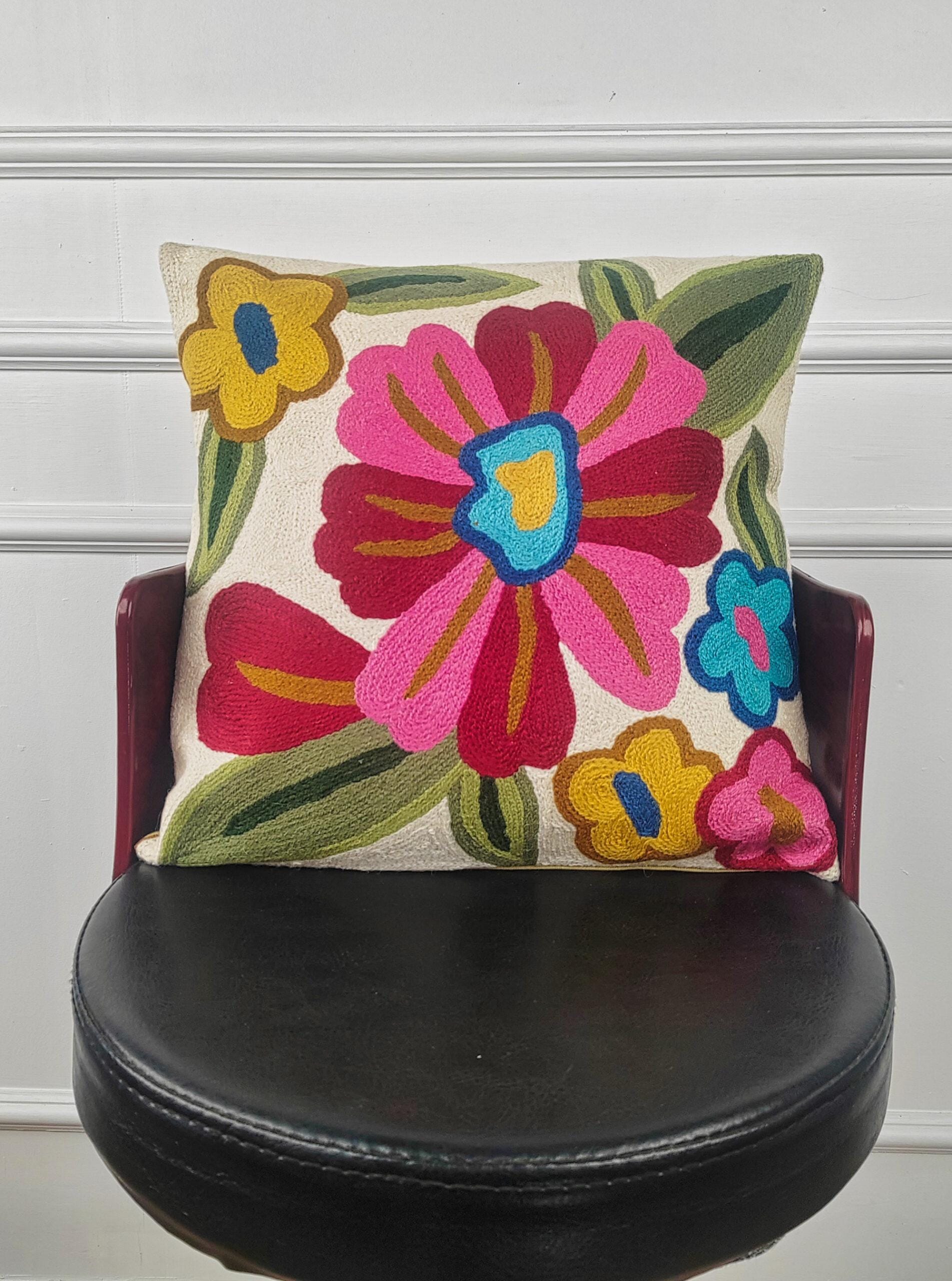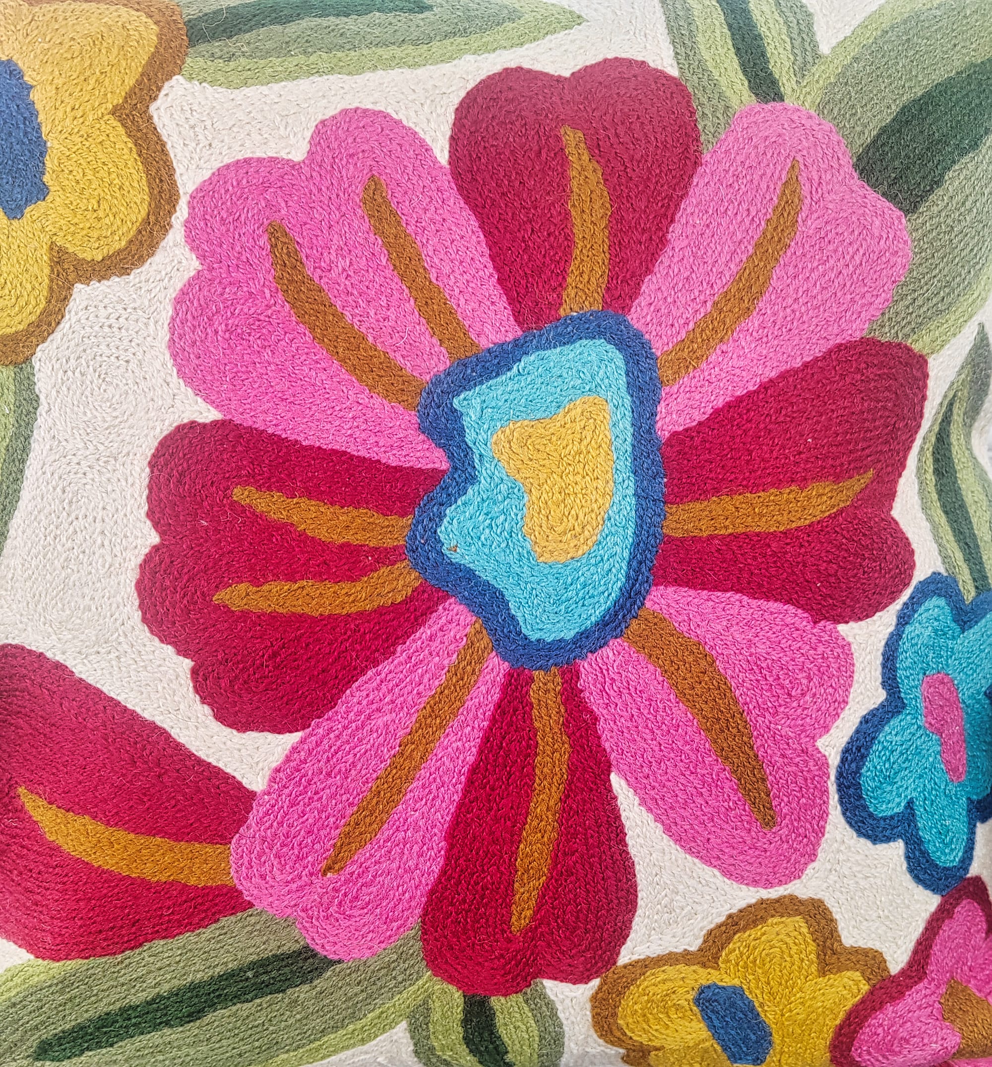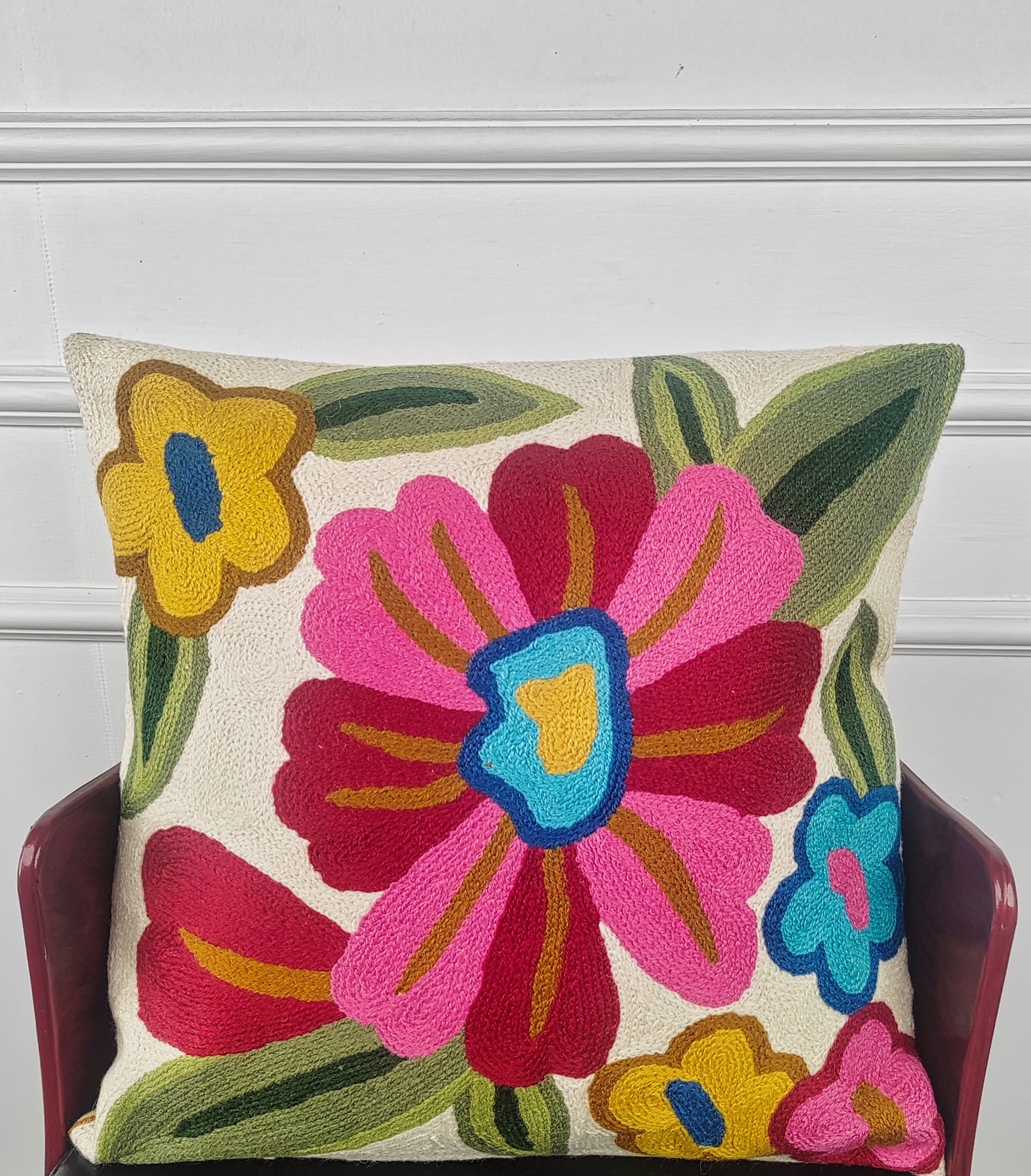 This handcrafted Kashmiri embroidered cushion cover showcases a bold central floral motif surrounded by gently flowing leaves and accent blossoms. Crafted from 100% pure wool, the design features a striking crimson and rose-pink flower at its heart, highlighted with turquoise and mustard detailing for a vivid yet balanced contrast. Set against a soft ivory base, the dense crewel embroidery reflects the mastery of Kashmiri artisans, creating a plush, textured surface with strong visual impact. Perfect for adding warmth and artistic character, this cushion cover elevates both modern and traditional interiors.