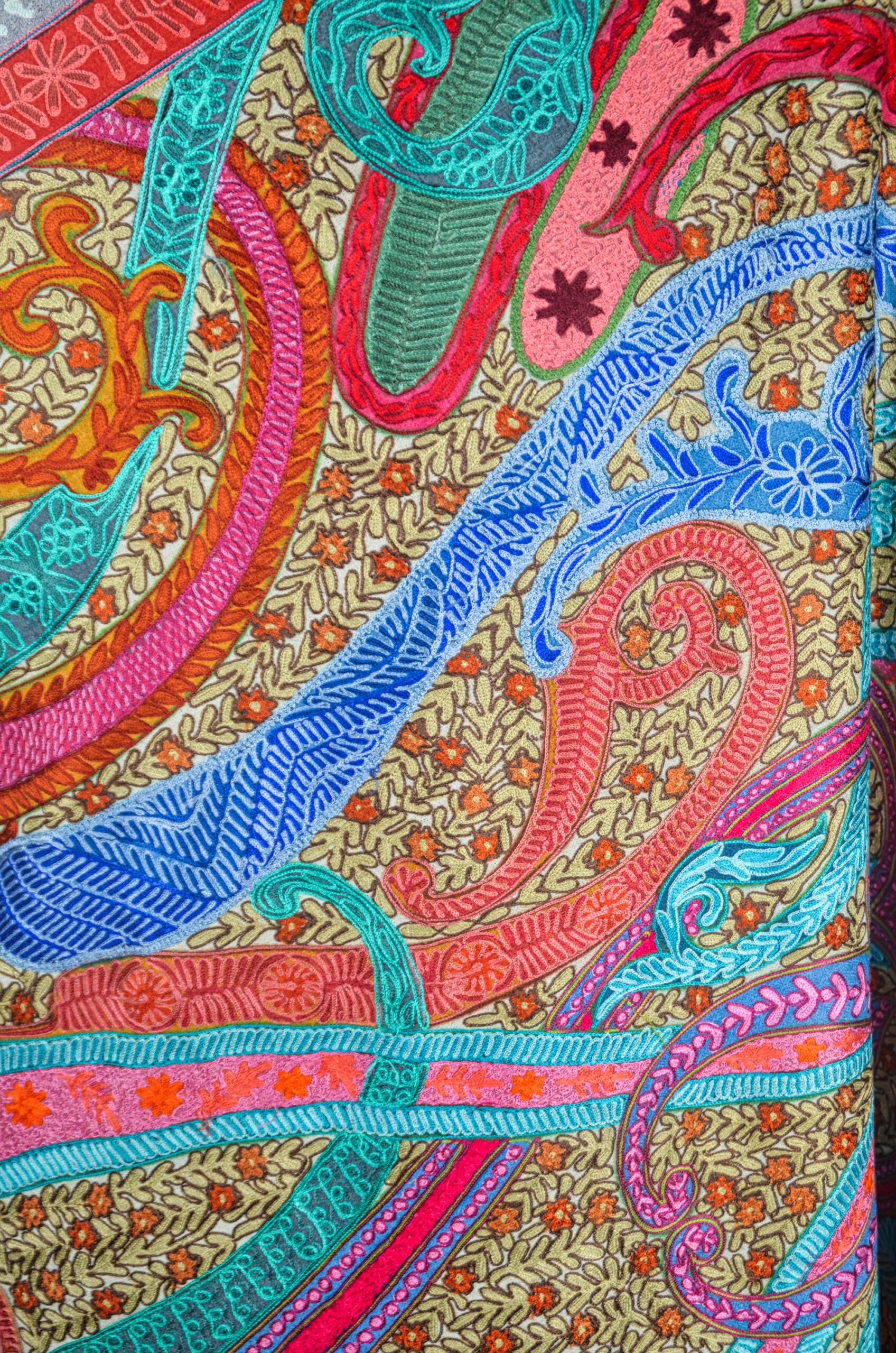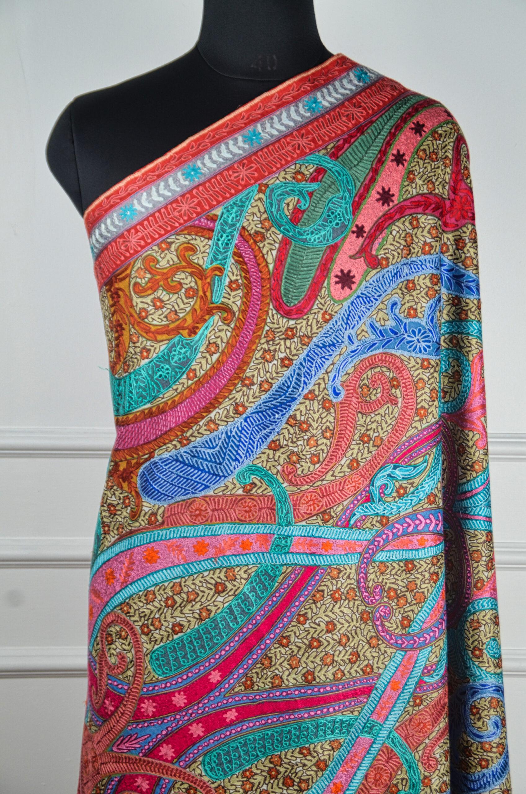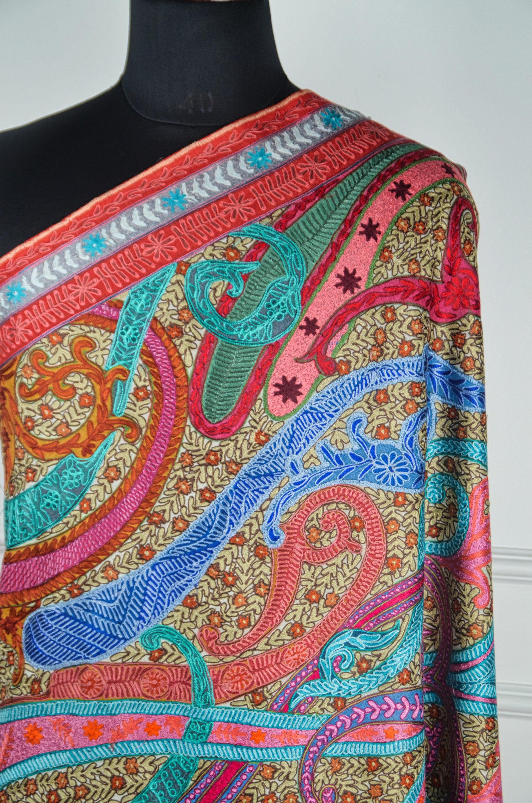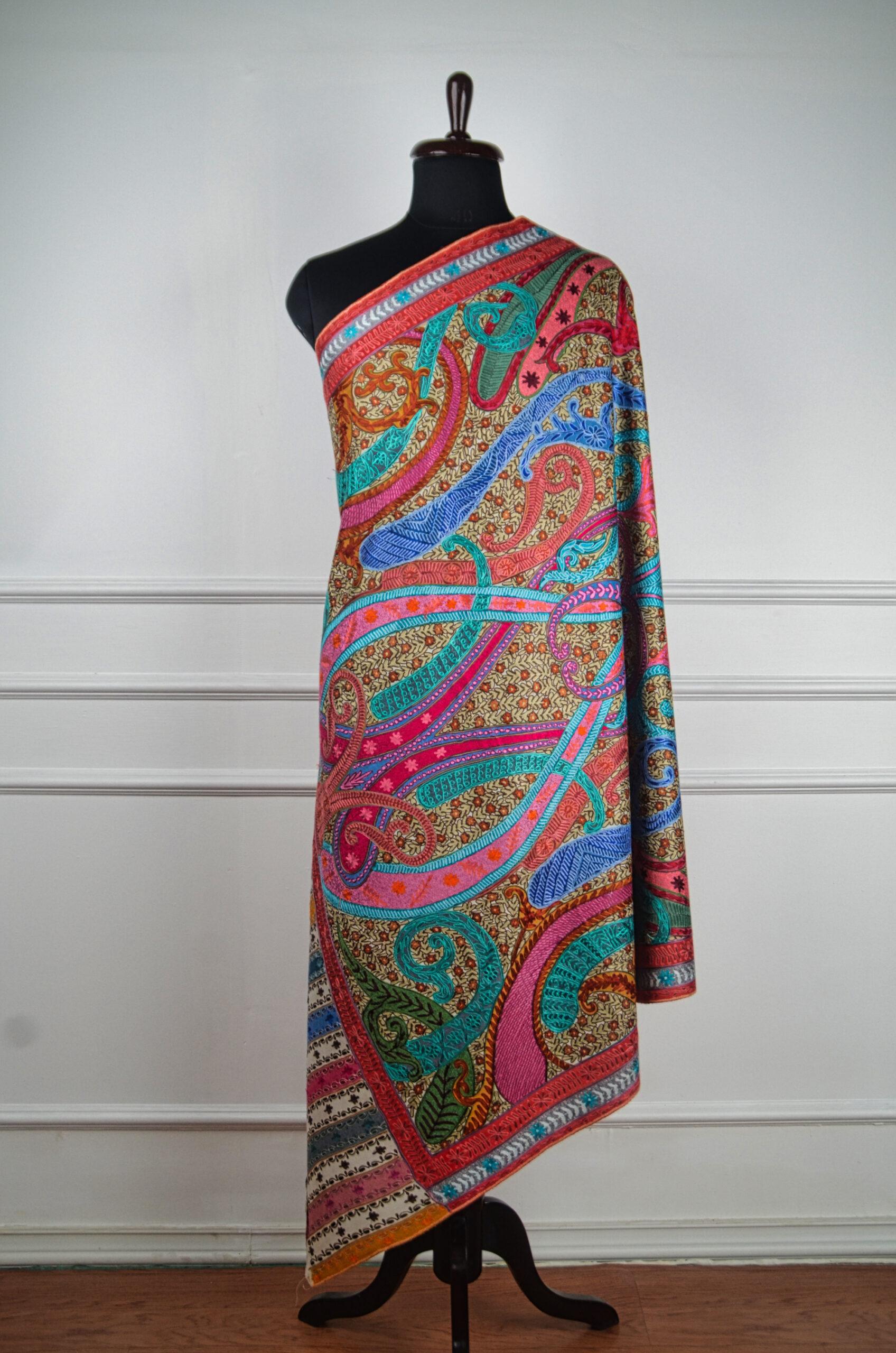 A celebration of color, craft, and culture, the Rang-e-Naghma Kalamkari Wool Shawl is a stunning example of Kashmiri artistry. This shawl features a mesmerizing tapestry of swirling paisleys, blooming florals, and abstract vine motifs all rendered in vibrant Kalamkari-inspired hues. Each section is brought to life with meticulous Aari embroidery, layered over a traditional patterned base that echoes centuries of storytelling through thread. Made from fine pure wool, the shawl is soft, warm, and drapes gracefully, making it both a wearable artwork and a timeless heirloom. Perfect for elevating winter ensembles or gifting to someone who appreciates high craftsmanship, this piece captures the soul of Kashmiri textile heritage in a riot of joyful colors.