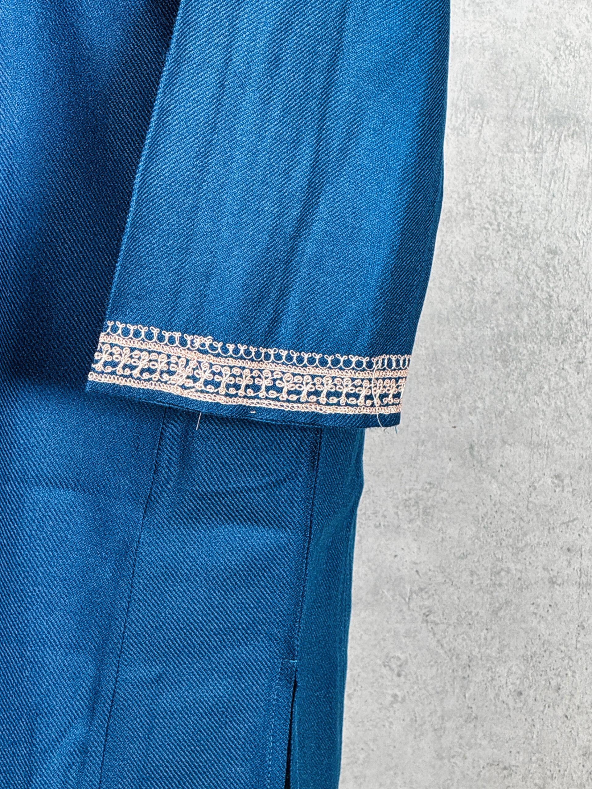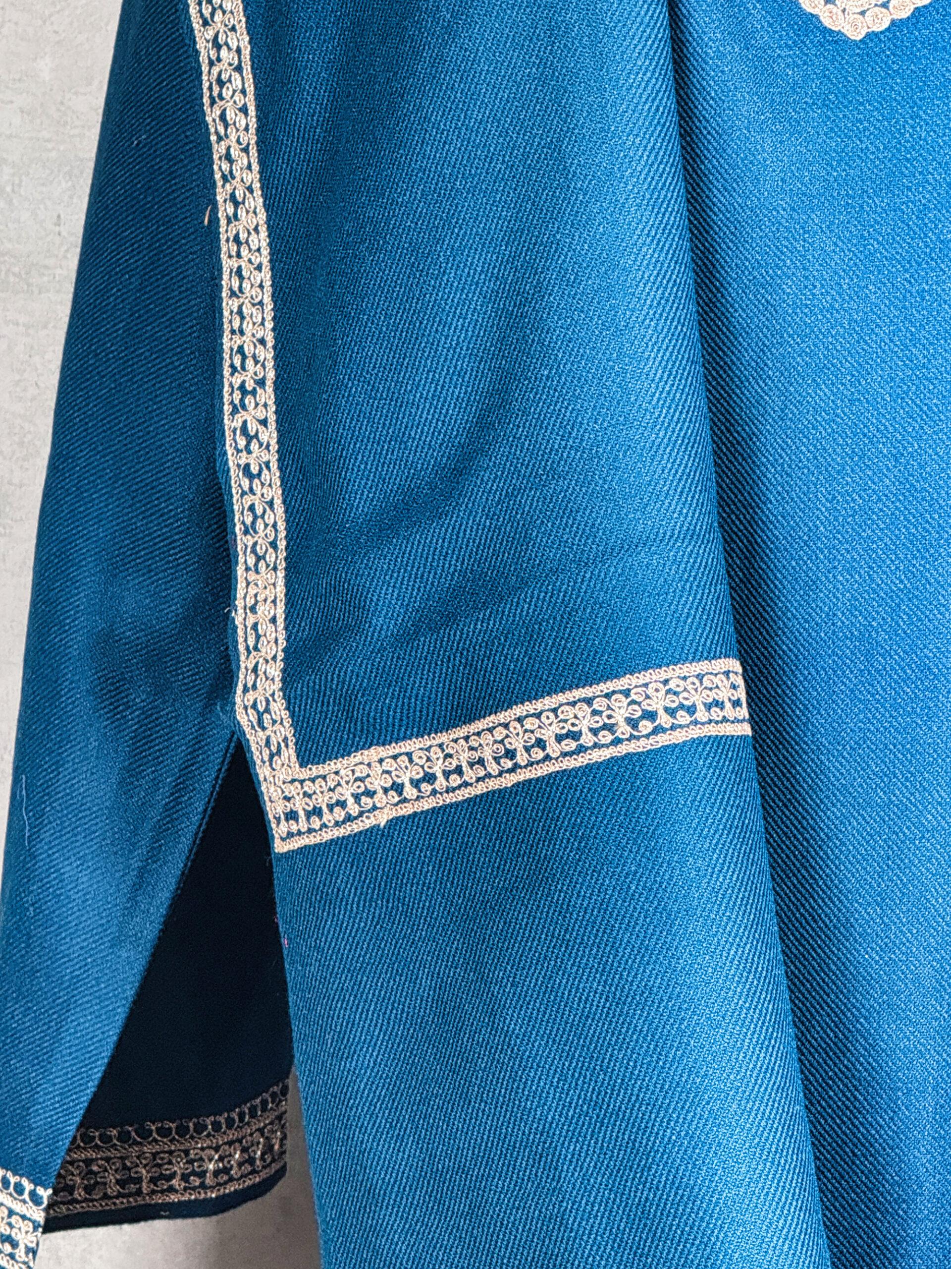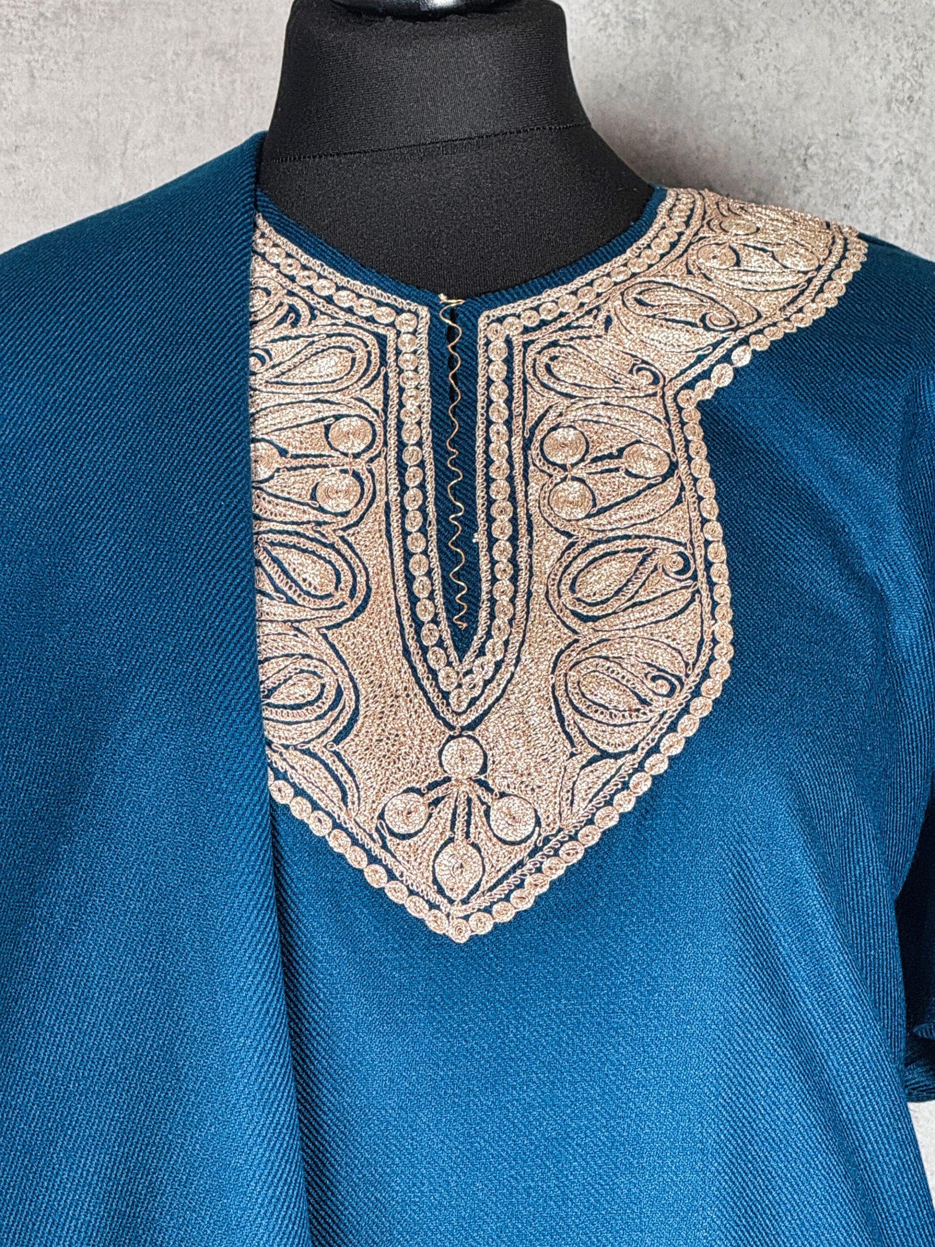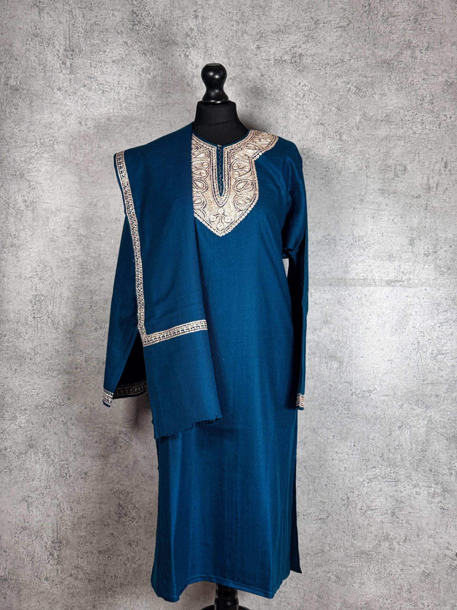The Riwaayat Pheran Set is a refined tribute to Kashmiri heritage, blending tradition with graceful sophistication. This elegant Kashmiri Tilla Work Pheran with Matching Scarf is crafted from premium Acro-wool, offering enhanced warmth and structure with a substantial 550 gram weight ideal for colder seasons and formal winter wear. The deep teal base creates a rich, jewel-toned canvas for the delicately detailed Tilla embroidery adorning the neckline. Intricate paisley and vine motifs, rendered in soft antique gold thread, lend a regal contrast while preserving understated elegance. The coordinated scarf, finished with a complementary embroidered border, completes the ensemble with harmonious refinement. Perfect for festive gatherings, cultural occasions, or elevated everyday elegance, this set embodies timeless Kashmiri artistry and comfort.