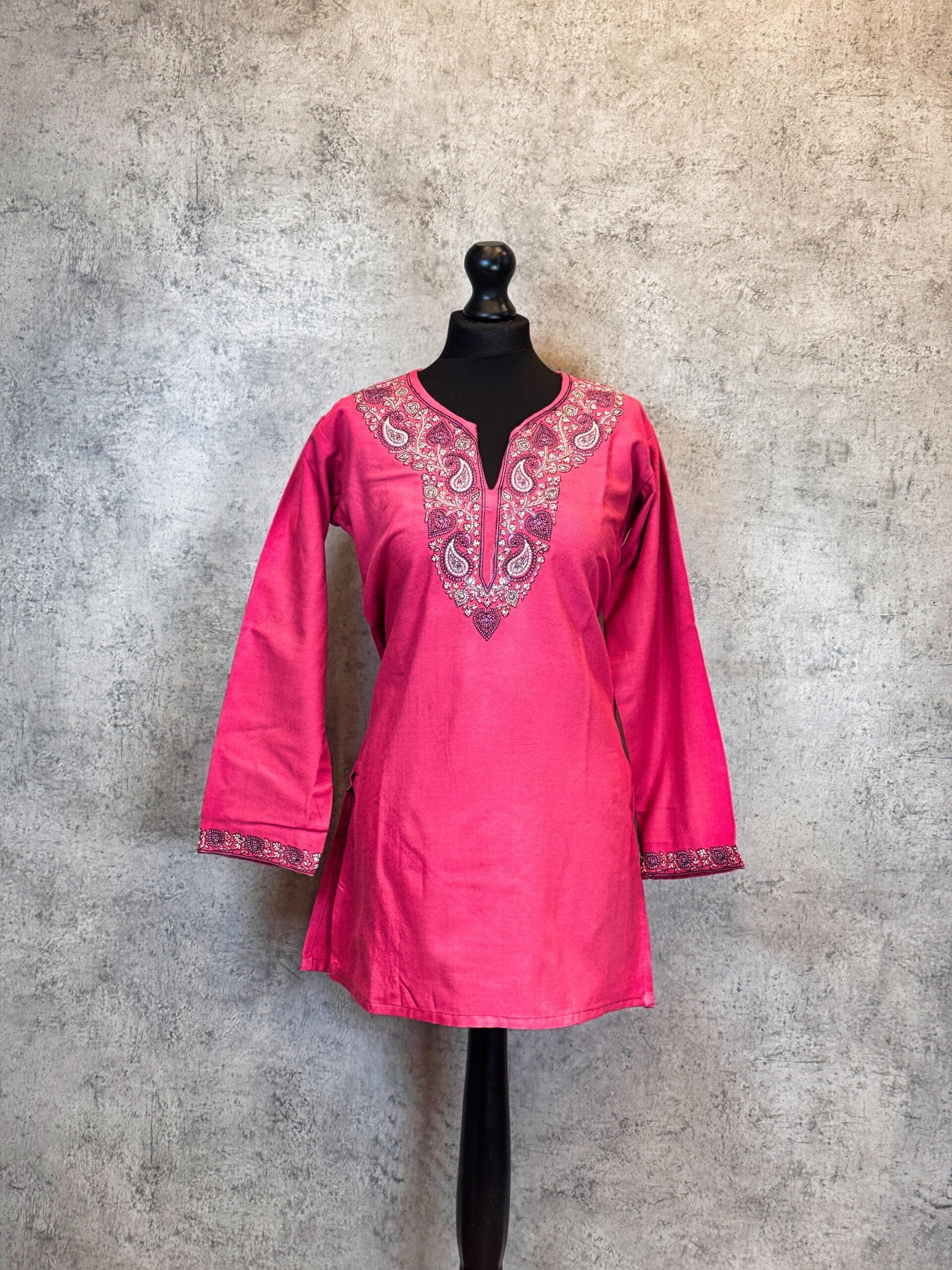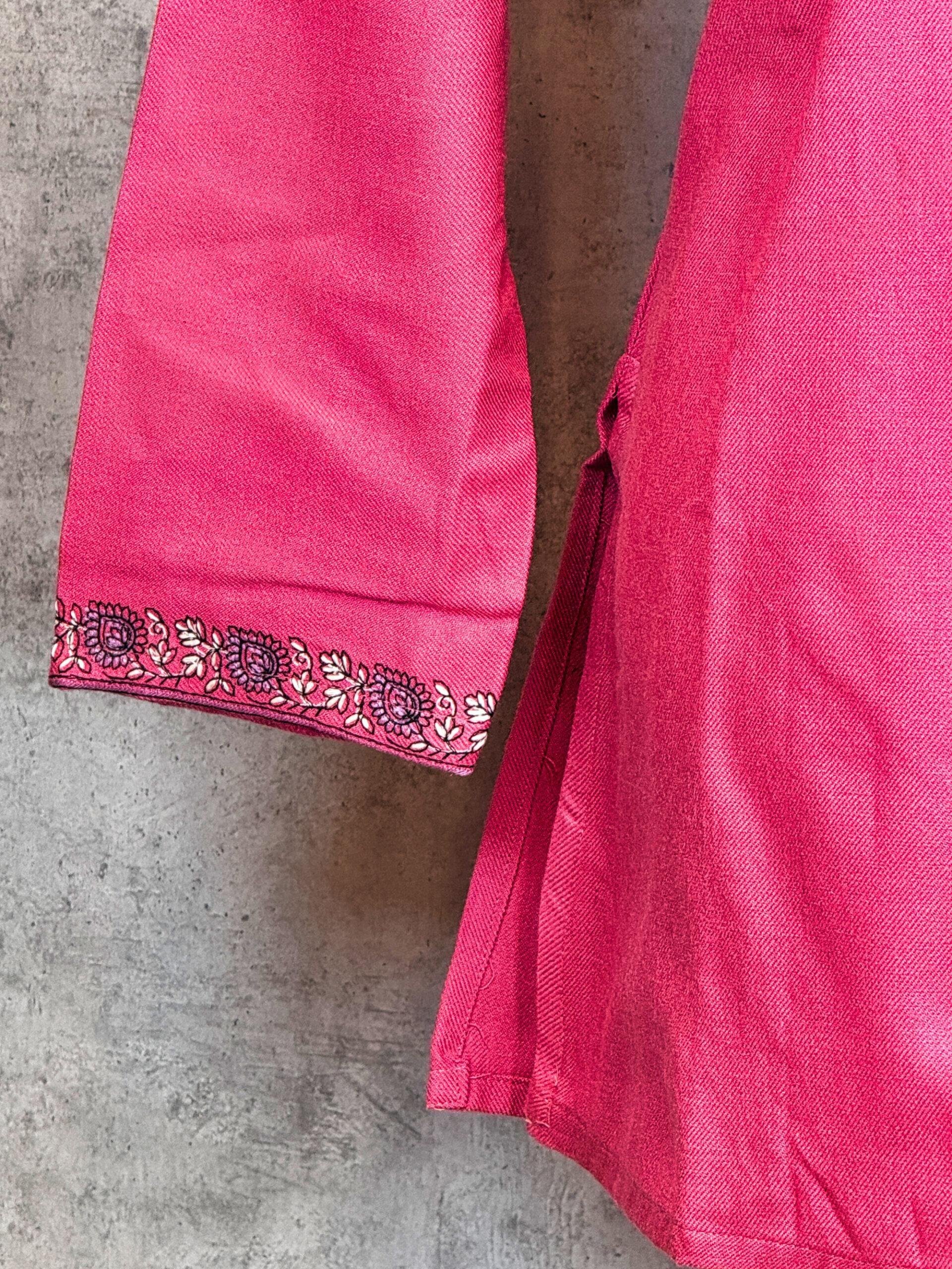 Vibrant and full of warmth, the Rose Radiance Kashmiri Short Kurti is a graceful Kashmiri short kurti designed for winter comfort and timeless elegance. Crafted from soft, insulating Acrowool with a machine-woven base, this kurti showcases intricate Aari-style paisley and floral embroidery along the neckline, inspired by classic Kashmiri ornamentation. The rich rose-pink base creates a striking contrast with the finely detailed embroidery in soft ivory and muted tones, while the embroidered sleeve cuffs complete the look with balanced finesse. Perfect for festive gatherings, cultural occasions, or elevated everyday wear, this kurti blends traditional charm with modern simplicity.