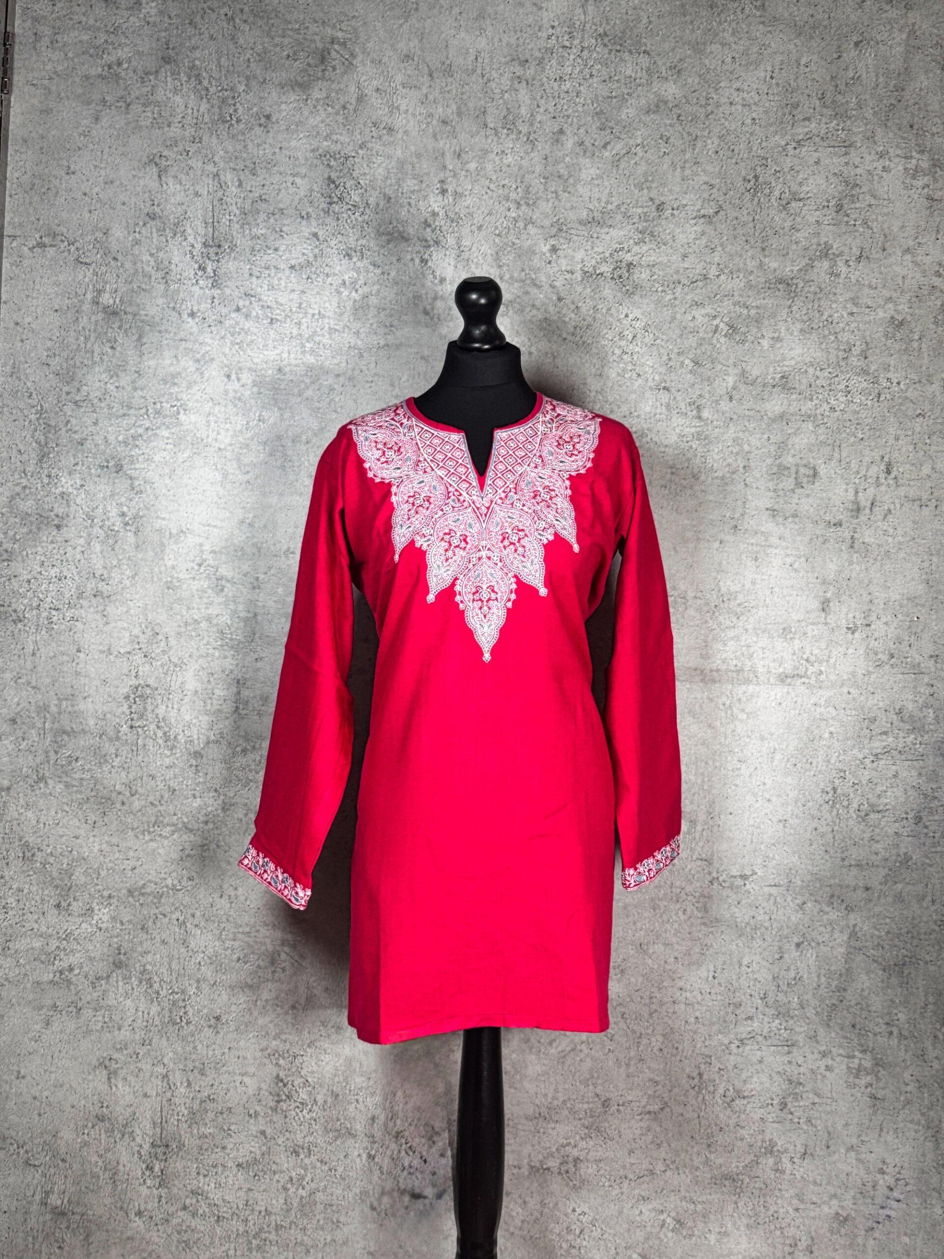The Roselace Heirloom Kashmiri Short Kurti is a refined expression of traditional Kashmiri craftsmanship brought to life through delicate white aari embroidery. Set against a rich, jewel-toned base, the kurti features an ornate neckline inspired by classic Kashmiri paisley and floral motifs, hand-embroidered with precision and grace. Crafted in a soft, breathable fabric, this short kurti balances heritage artistry with contemporary wearability, making it an elegant choice for both everyday sophistication and festive moments.