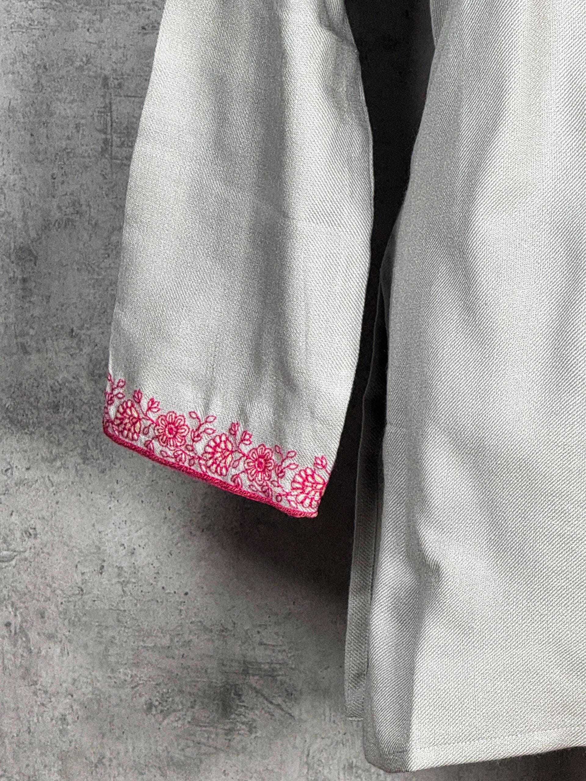 The Roseveil Kashmiri Short Kurti embodies delicate elegance through its finely detailed aari embroidery and balanced composition. The neckline features an intricate arrangement of traditional Kashmiri paisley and floral motifs, hand-embroidered with precision to create a graceful focal point. Complemented by subtle embroidery along the sleeve cuffs, this kurti is crafted from a soft, breathable fabric that drapes comfortably while maintaining a polished silhouette. A timeless piece that blends artisanal heritage with everyday wearability.