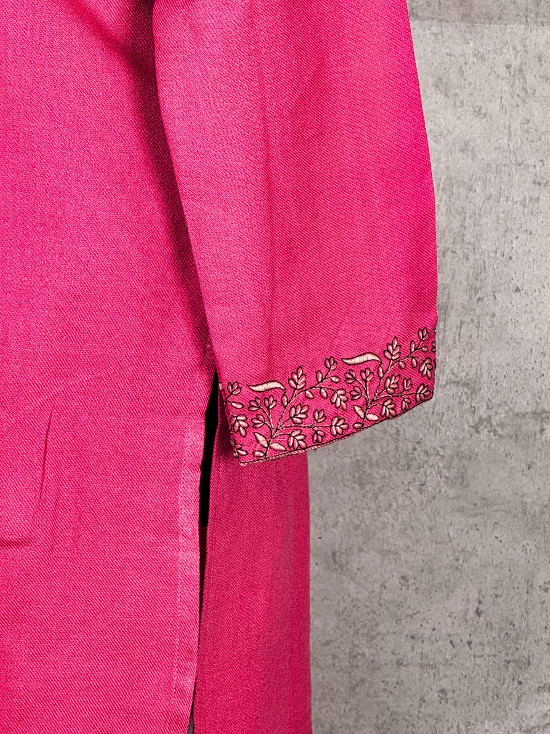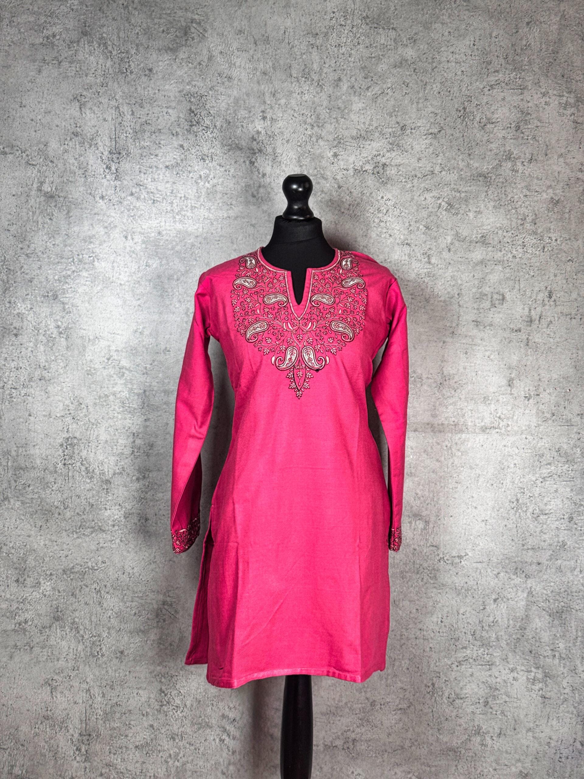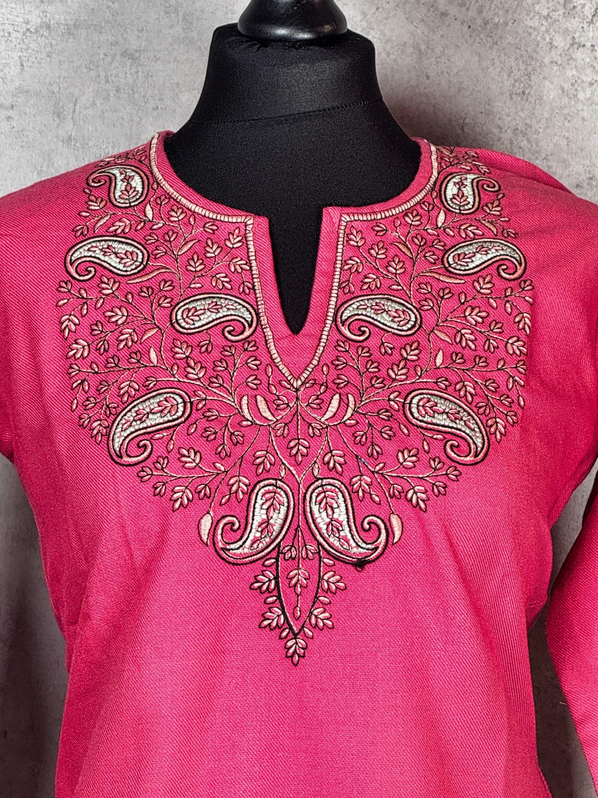 The Roseveil Paisley Kashmiri Short Kurti captures the romance of Kashmiri embroidery through an elegant paisley composition set against a rich rose-toned base. Crafted from machine-woven Acrowool, this kurti offers a smooth, lightweight feel with a gentle warmth, making it ideal for year-round wear. The finely detailed paisley and floral embroidery around the neckline creates a graceful focal point, while the subtle sleeve accents complete the look with balanced sophistication. Designed for effortless elegance, this kurti blends traditional Kashmiri artistry with contemporary charm.