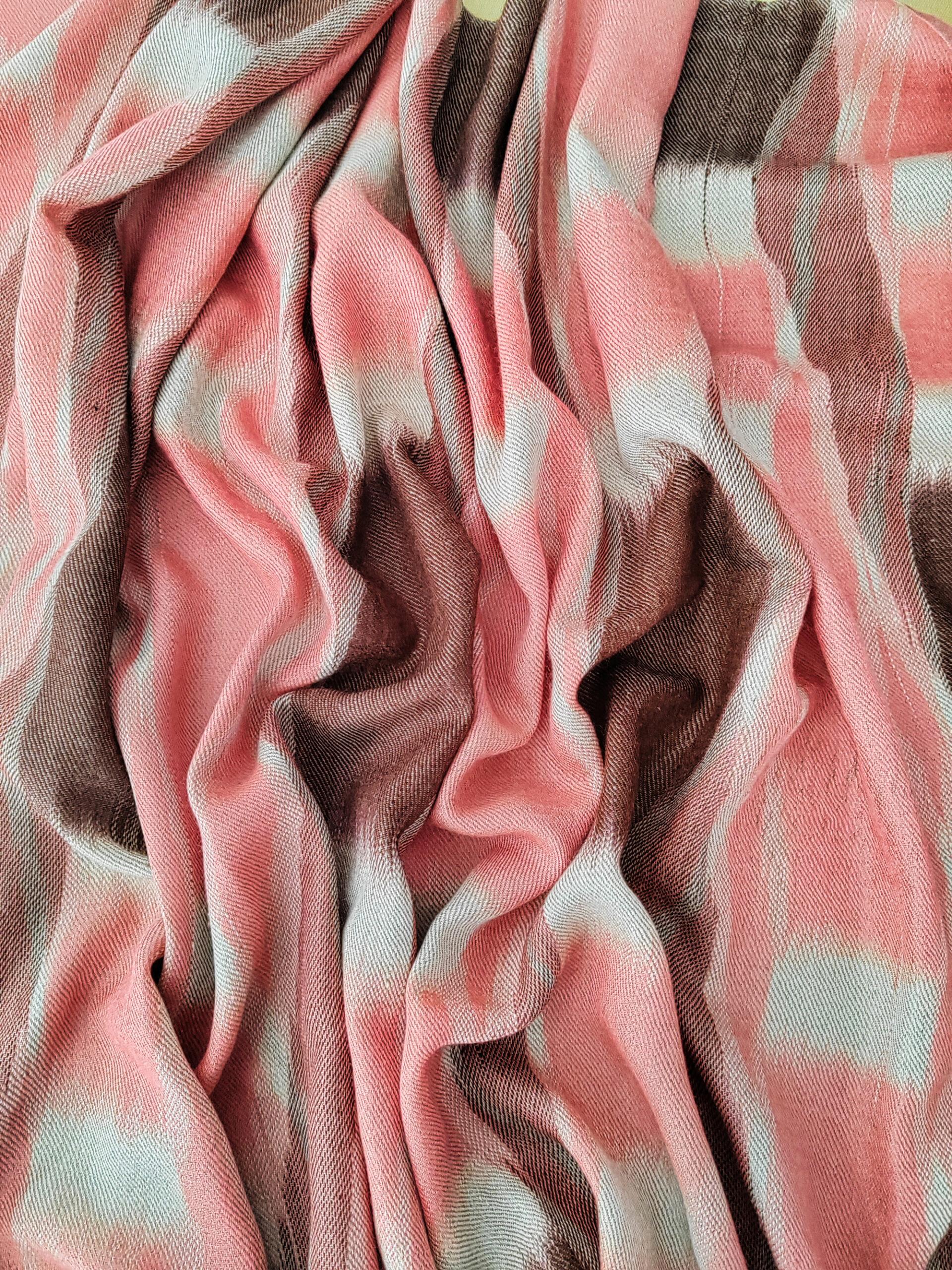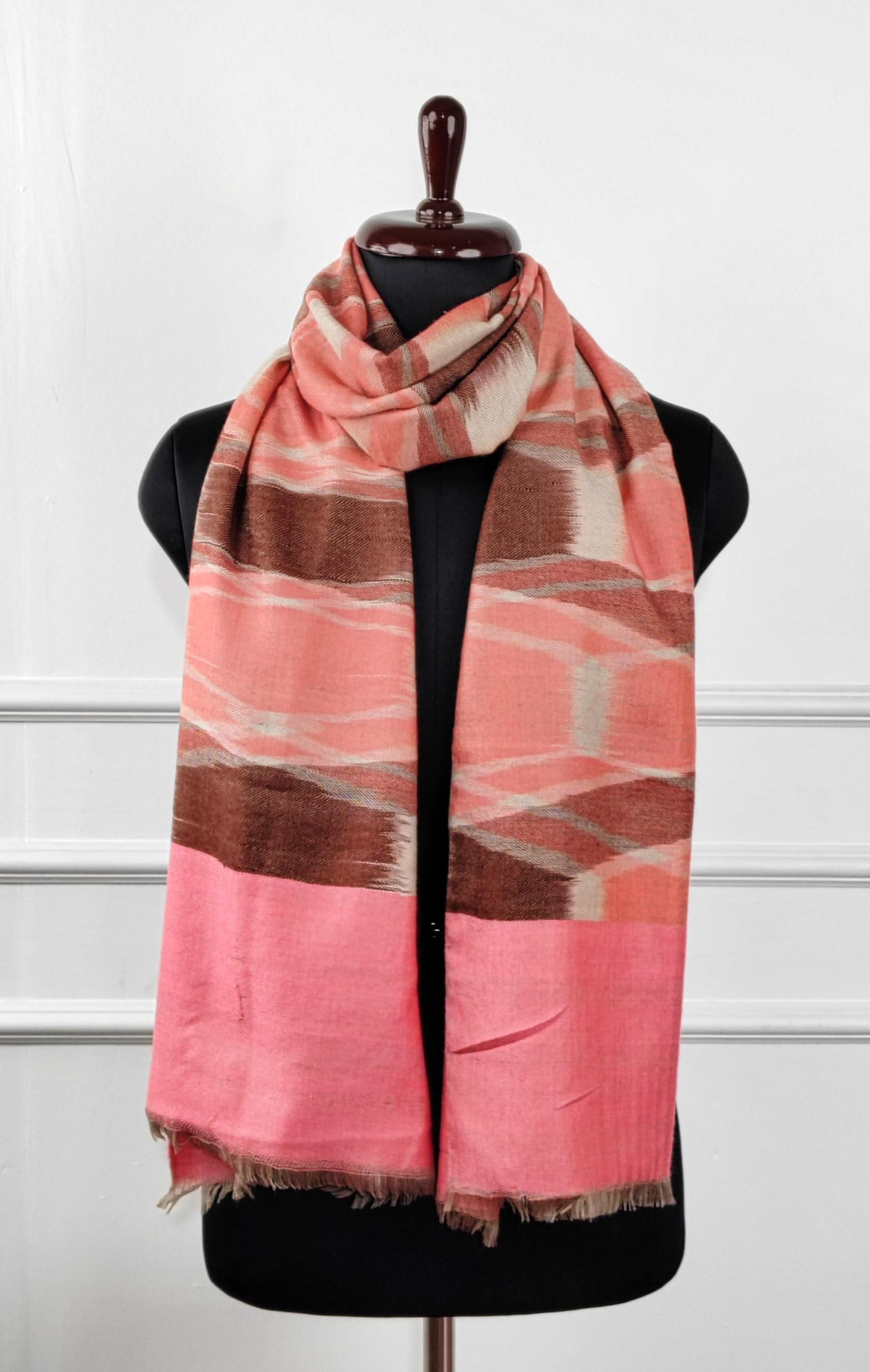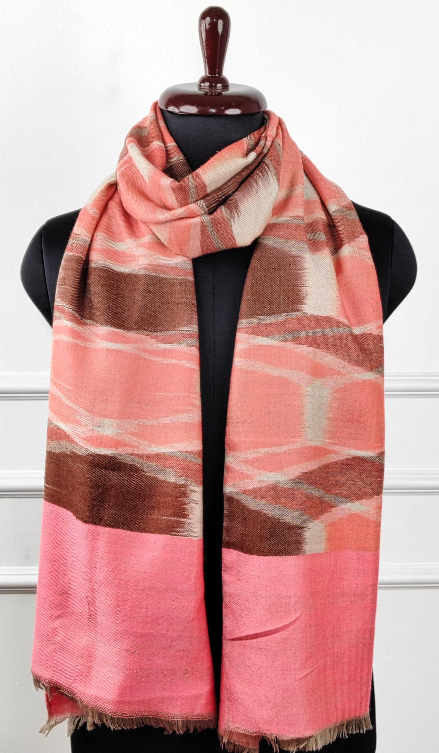Rose Bloom is a soft and romantic Kashmiri Ikat style Cashmere Scarf, featuring fluid brush-stroke stripes in warm blush pink, cocoa brown, and creamy ivory. The pattern flows like layered twilight clouds, giving the Scarf an elegant modern look with a handcrafted Ikat inspired charm. Made from luxuriously fine Cashmere, it feels feather light yet naturally warm, offering a graceful drape that elevates both casual and formal winter outfits. A timeless statement piece that blends warmth, softness, and refined Kashmiri artistry.