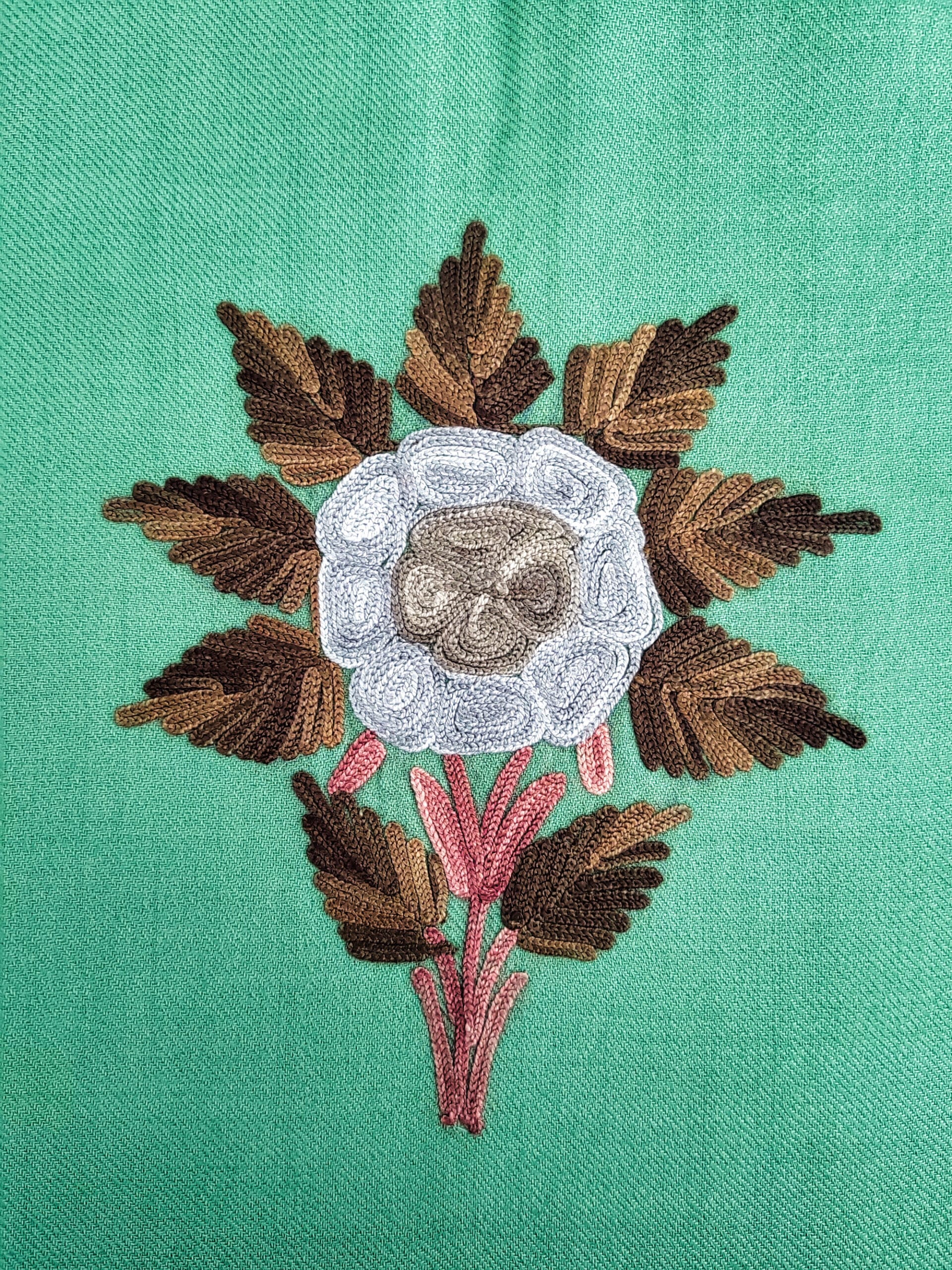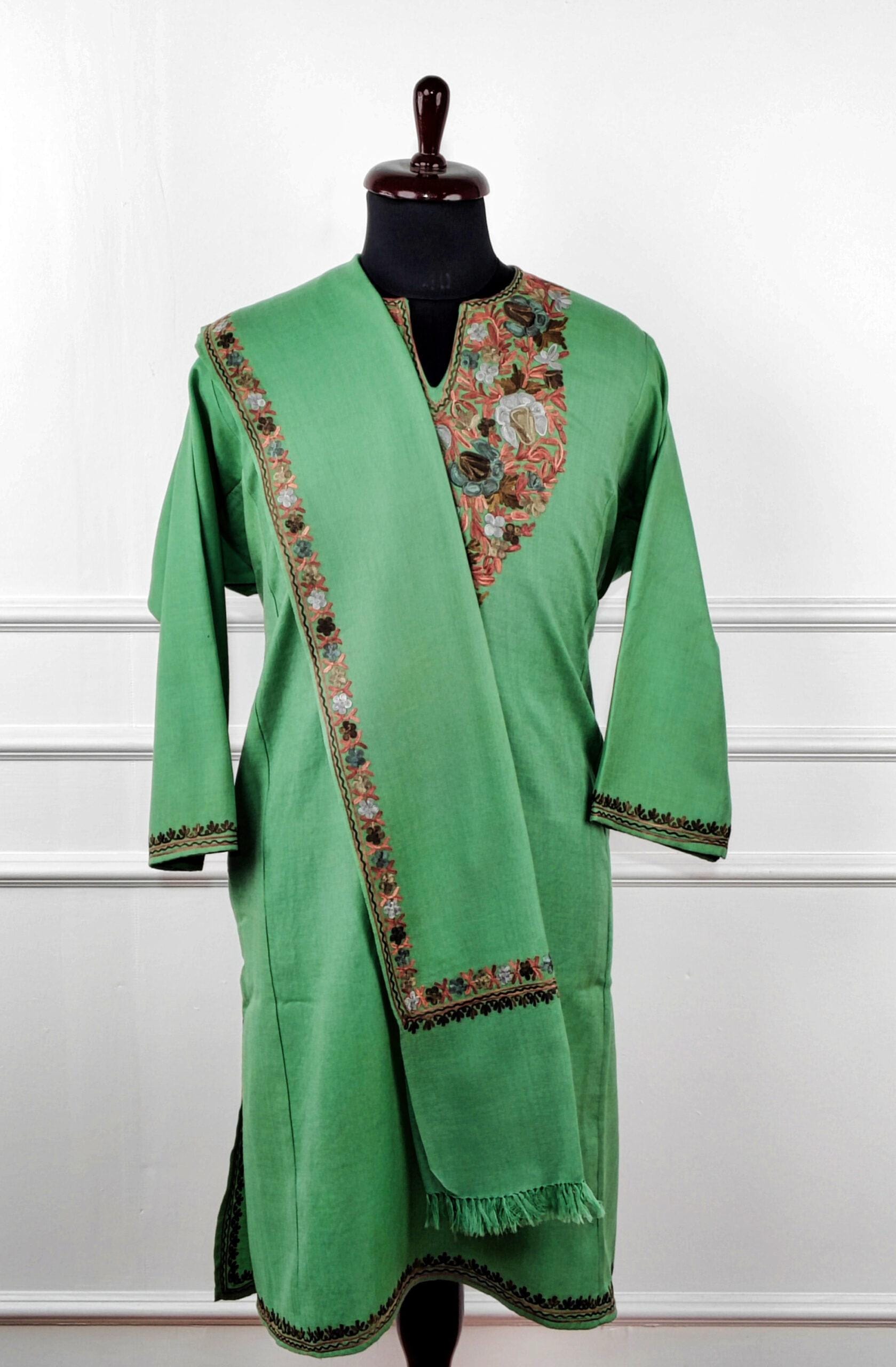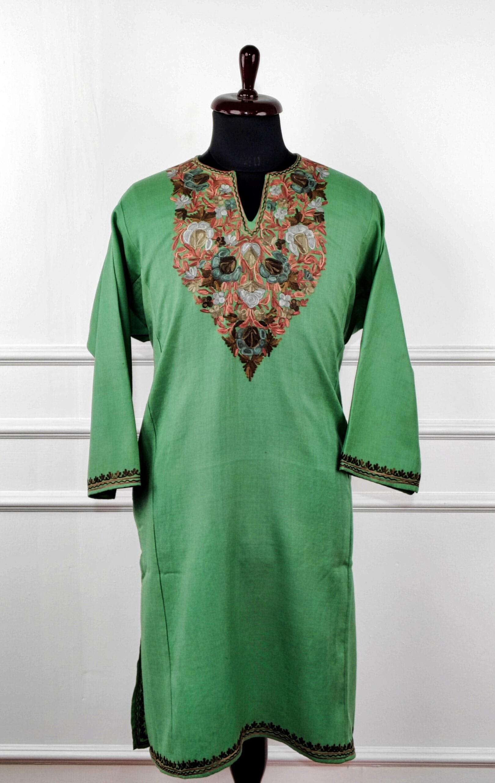 Sabz-e-Mehr is an elegant Kashmiri Aari Embroidered Pheran crafted from warm, finely woven wool, reflecting serenity and refined heritage craftsmanship. The pheran features a fresh mid-green base that feels soothing and balanced, serving as a graceful canvas for the intricate Aari embroidery concentrated around the neckline. Floral motifs in layered tones of rust, earthy brown, soft ivory, and muted sage create a harmonious, nature-inspired composition. Minimal embroidery on the cuffs and hemline complements the central design, while the classic straight-cut pheran silhouette ensures comfort, ease, and timeless winter wear rooted in Kashmiri tradition.