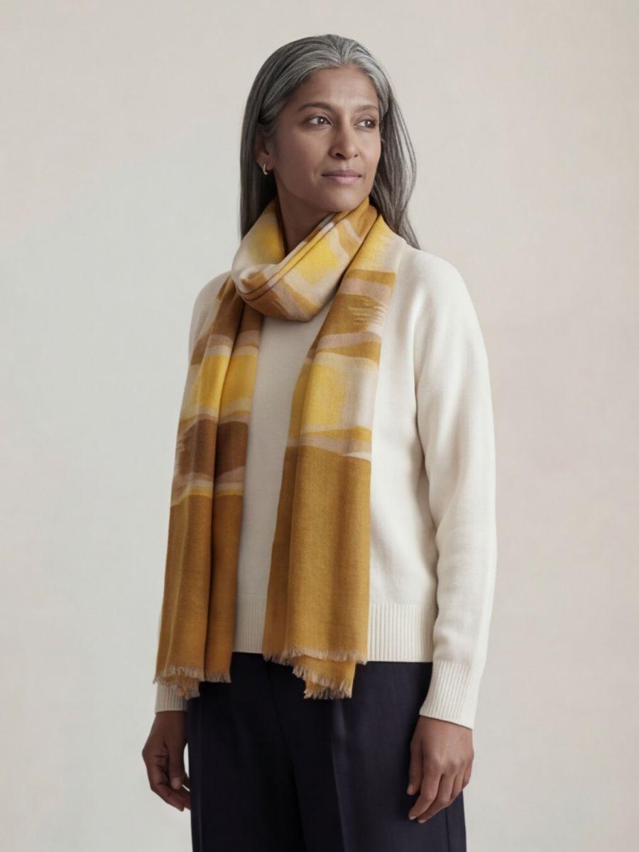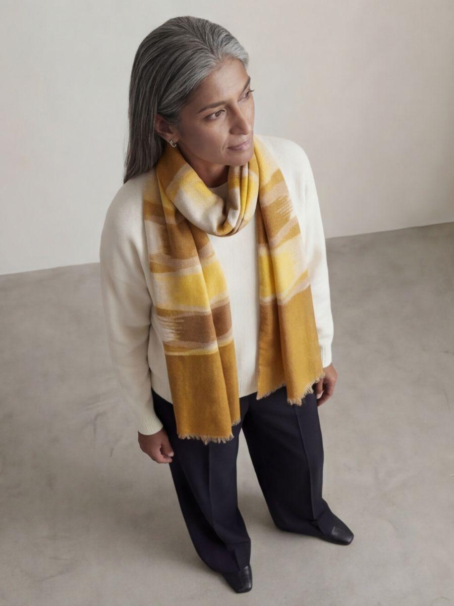 Saffron Mist is a graceful Kashmiri Ikat style Cashmere Scarf, featuring soft, painterly stripes that resemble drifting sunlight over quiet winter skies. The design blends warm mustard, golden saffron, ivory, and sand beige tones in a calm, contemporary rhythm. Woven in luxuriously fine Cashmere, this Scarf feels feather light yet cozy, making it perfect for elegant layering. Its minimal Ikkat inspired pattern gives it a refined, modern appeal while still celebrating Kashmiri artistry and timeless warmth.