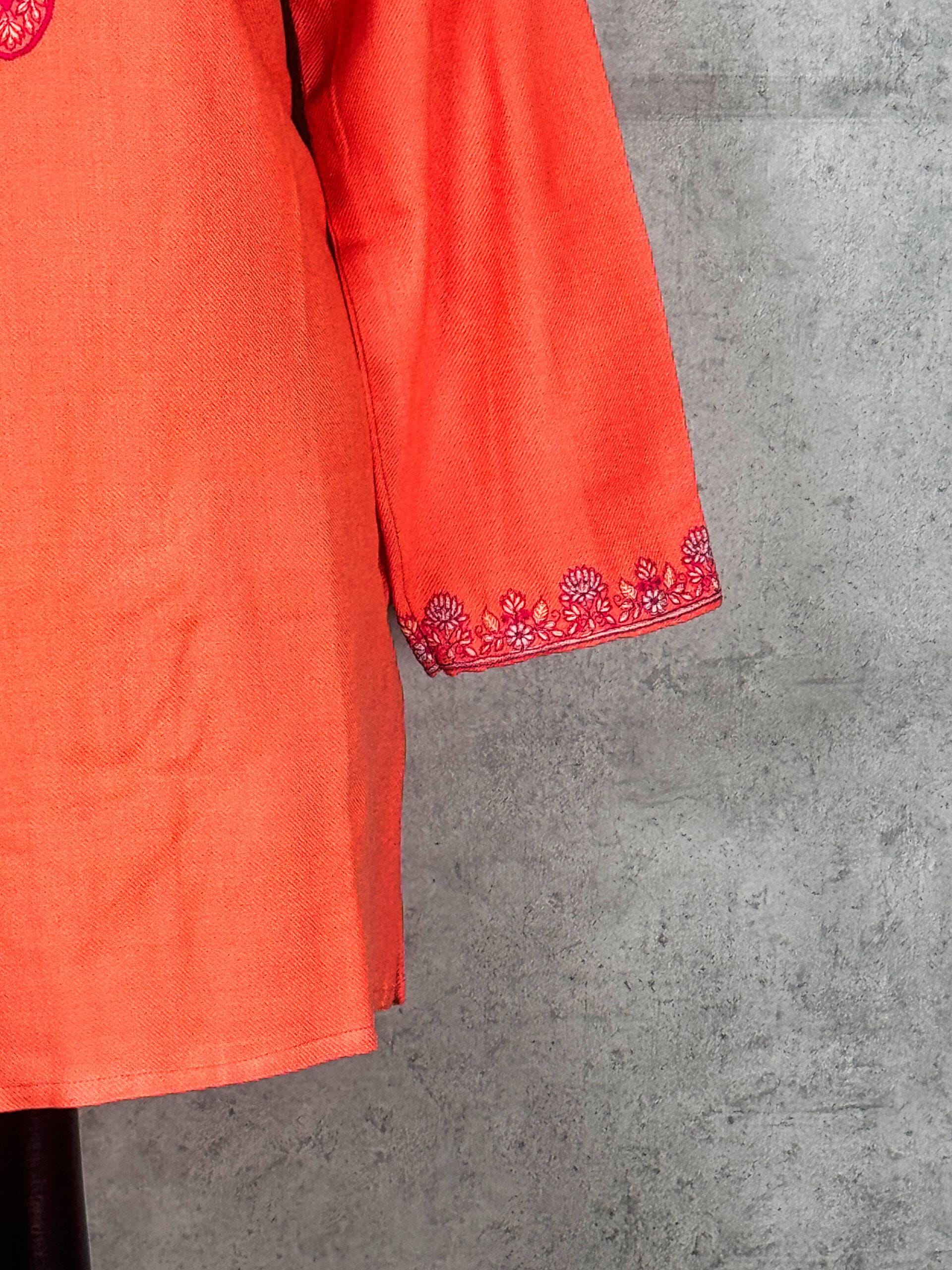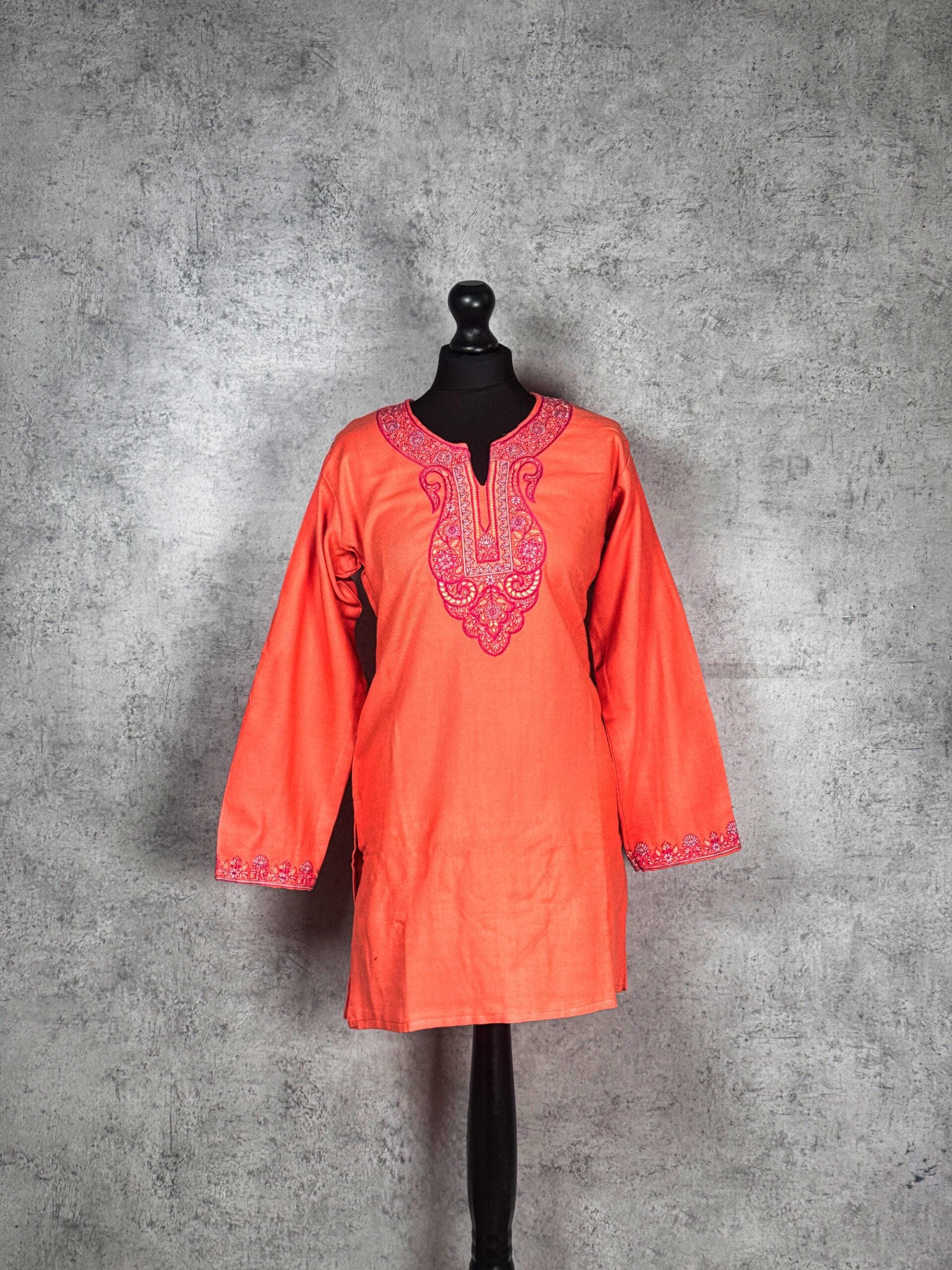The Serenelle Kashmiri Short Kurti captures the warmth of sunlit hues with the finesse of traditional Kashmiri embroidery. Crafted in a soft coral base, the kurti is elevated with intricate pink threadwork along the neckline and sleeve cuffs, forming elegant vine and paisley motifs. The harmonious contrast lends it a refined yet lively charm perfect for effortless everyday elegance or intimate festive moments.