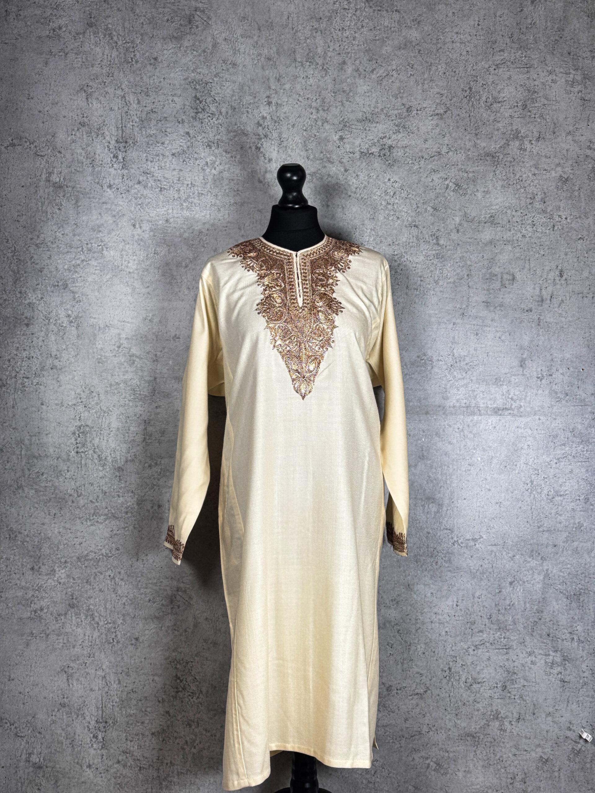 Step into timeless Kashmiri elegance with the Shehzadi Zareen Pheran, a graceful expression of heritage craftsmanship. This traditional Kashmiri Pheran is tailored in refined Acro-wool, offering a soft, warm drape with a comfortable 350 gram weight ideal for cooler seasons while remaining breathable and easy to wear. The neckline is adorned with intricate Tilla embroidery, cascading in a regal paisley-inspired pattern that reflects classic Kashmiri artistry. The rich metallic threadwork enhances the understated base, creating a harmonious balance between simplicity and ornamentation. Delicately embroidered sleeve cuffs add a refined finishing touch. This pheran embodies cultural sophistication perfect for festive gatherings, formal occasions, or elegant winter wear.