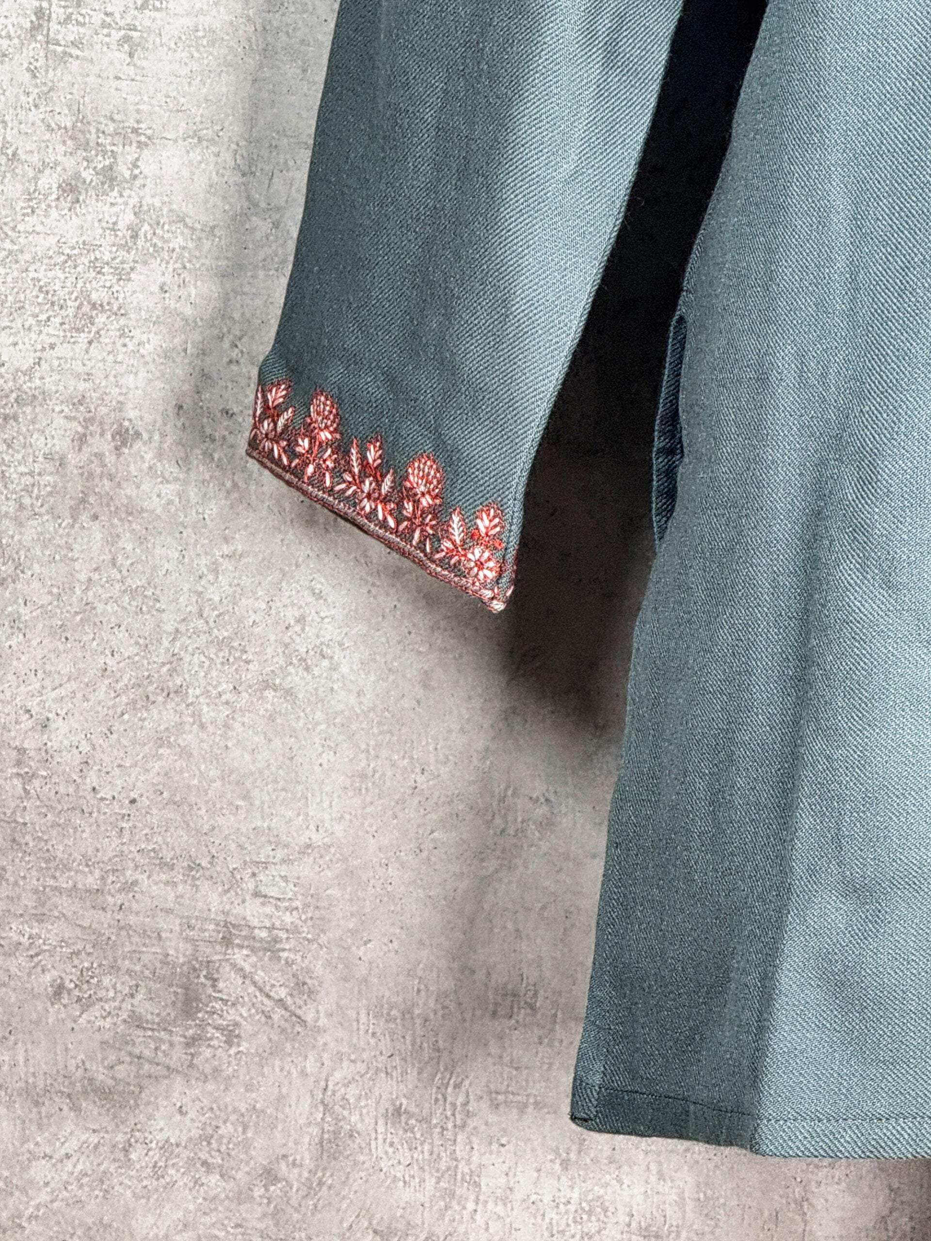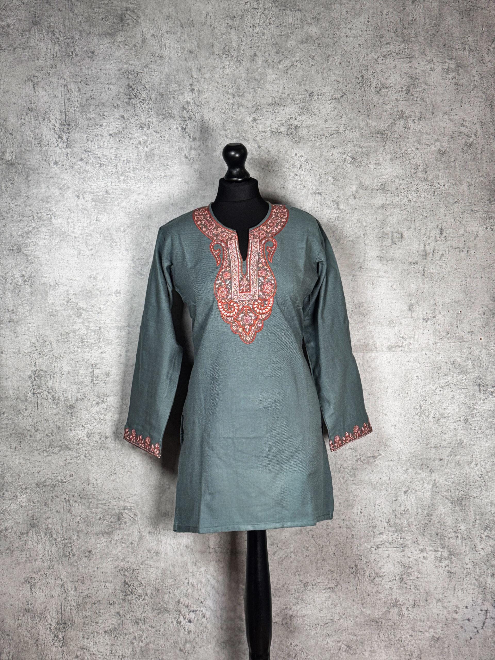 Silkfern Kashmiri Short Kurti draws inspiration from the quiet elegance of fern fronds found in Kashmir’s shaded valleys. Crafted in a soft, earthy-toned base, this kurti is adorned with traditional hand-done aari embroidery that flows gracefully along the neckline and sleeve cuffs. The delicate motifs echo organic forms, creating a refined balance between heritage craftsmanship and contemporary wearability. Designed for effortless sophistication, this short kurti is ideal for relaxed gatherings, cultural occasions, or elevated everyday styling.