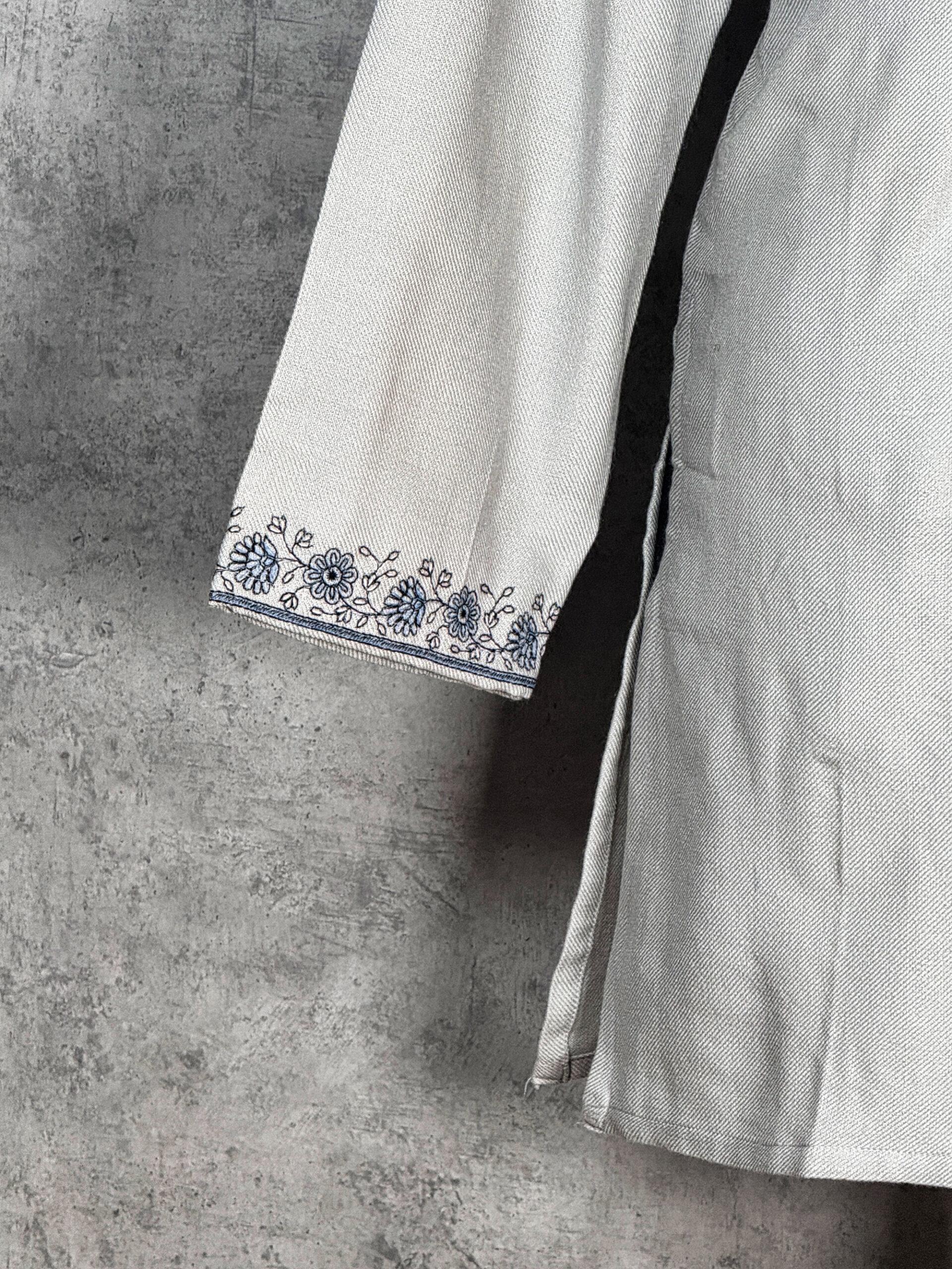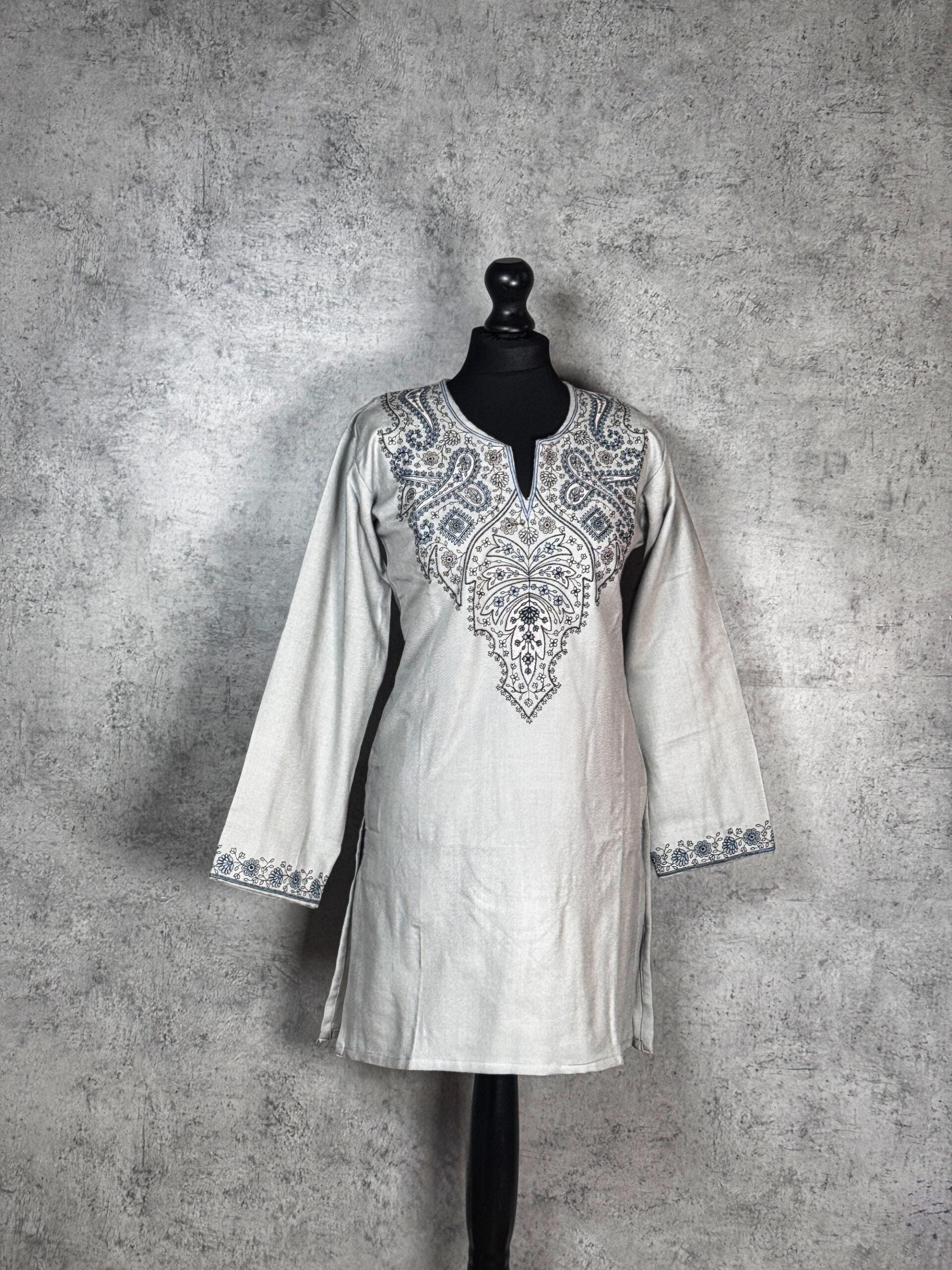 Graceful and understated, the Silver Willow Kashmiri Short Kurti is a refined Kashmiri short kurti that embodies timeless elegance and traditional craftsmanship. Crafted from soft, winter-friendly Acrowool with a machine-woven base, this kurti features finely detailed Aari-style paisley and floral embroidery arranged symmetrically along the neckline. Inspired by flowing willow forms and classic Kashmiri motifs, the embroidery adds a sense of calm sophistication. Finished with delicately embroidered sleeve cuffs, this kurti is ideal for winter wear, cultural gatherings, or elevated everyday styling offering a perfect balance of heritage artistry and modern simplicity.