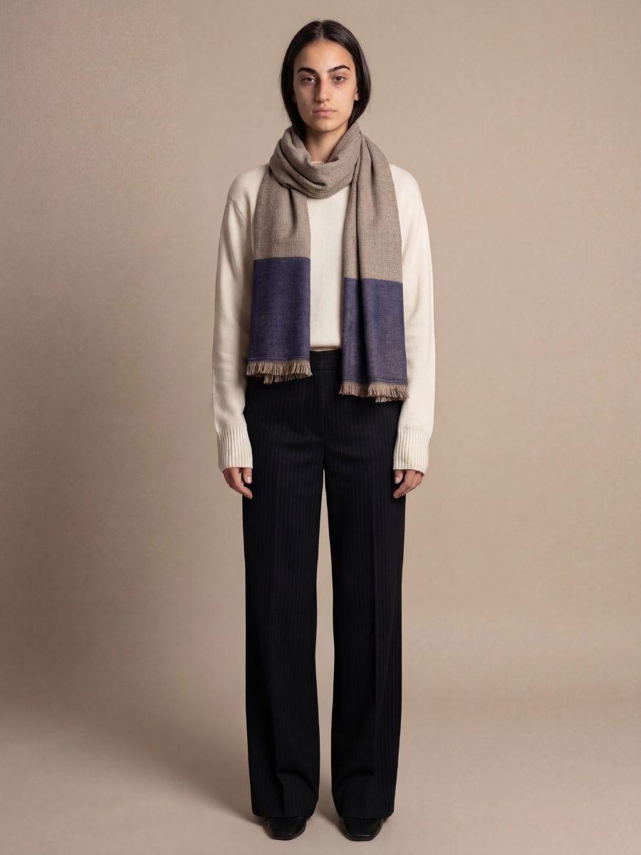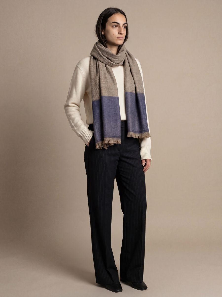 Sukoot-e-Shab handwoven Kashmiri cashmere scarf carries a calm, refined presence with its soft neutral body and deep twilight-toned border. The subtle micro-texture adds depth and character, while the contrasting edge brings a quiet richness that feels both modern and timeless. Effortlessly elegant, it drapes beautifully and pairs well with everyday layers as well as evening looks an understated statement of heritage craftsmanship.