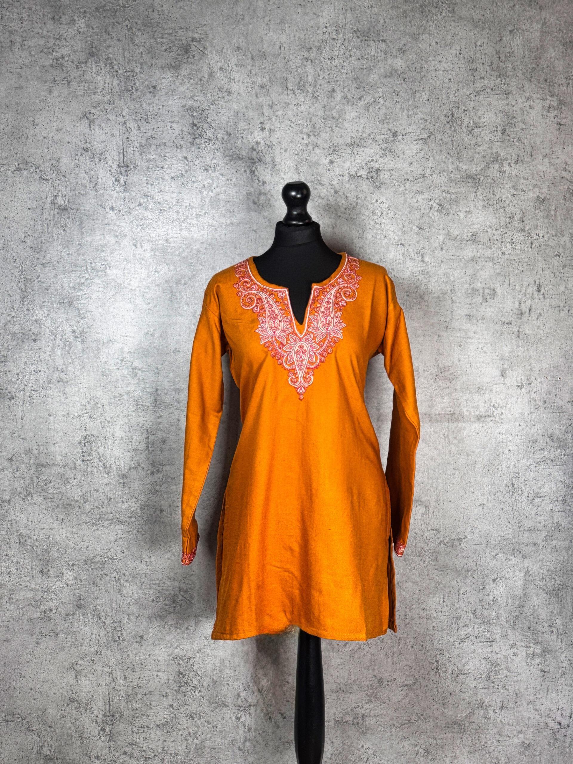 Inspired by the warm glow of sun-kissed valleys, the Sunlit Valley Short Kurti is an elegant Kashmiri short kurti that captures the harmony of nature and tradition. Crafted from soft, winter-friendly Acrowool with a machine-woven base, this kurti features delicate Aari-style paisley and floral embroidery flowing gracefully from the neckline. The embroidery reflects classic Kashmiri motifs, adding depth and artisanal character, while the clean silhouette ensures everyday comfort and versatility. Finished with subtly embroidered sleeve cuffs, this kurti is ideal for winter wear, cultural gatherings, or refined daily styling offering warmth, grace, and timeless appeal.