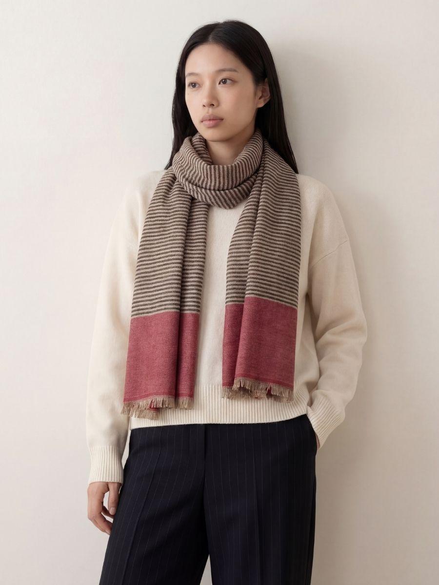 Surkh Kinara is an elegant handwoven Kashmiri cashmere scarf that blends timeless minimalism with a bold finishing touch. The upper body features fine charcoal pinstripes on a warm beige base, creating a refined, tailored look, while the deep crimson-red border adds richness and contrast like a signature accent at the edge of a classic silhouette. Crafted in pure cashmere for a feather-soft feel and natural warmth, this scarf is a versatile luxury essential, perfect for layering over neutrals and elevating everyday winter styling.