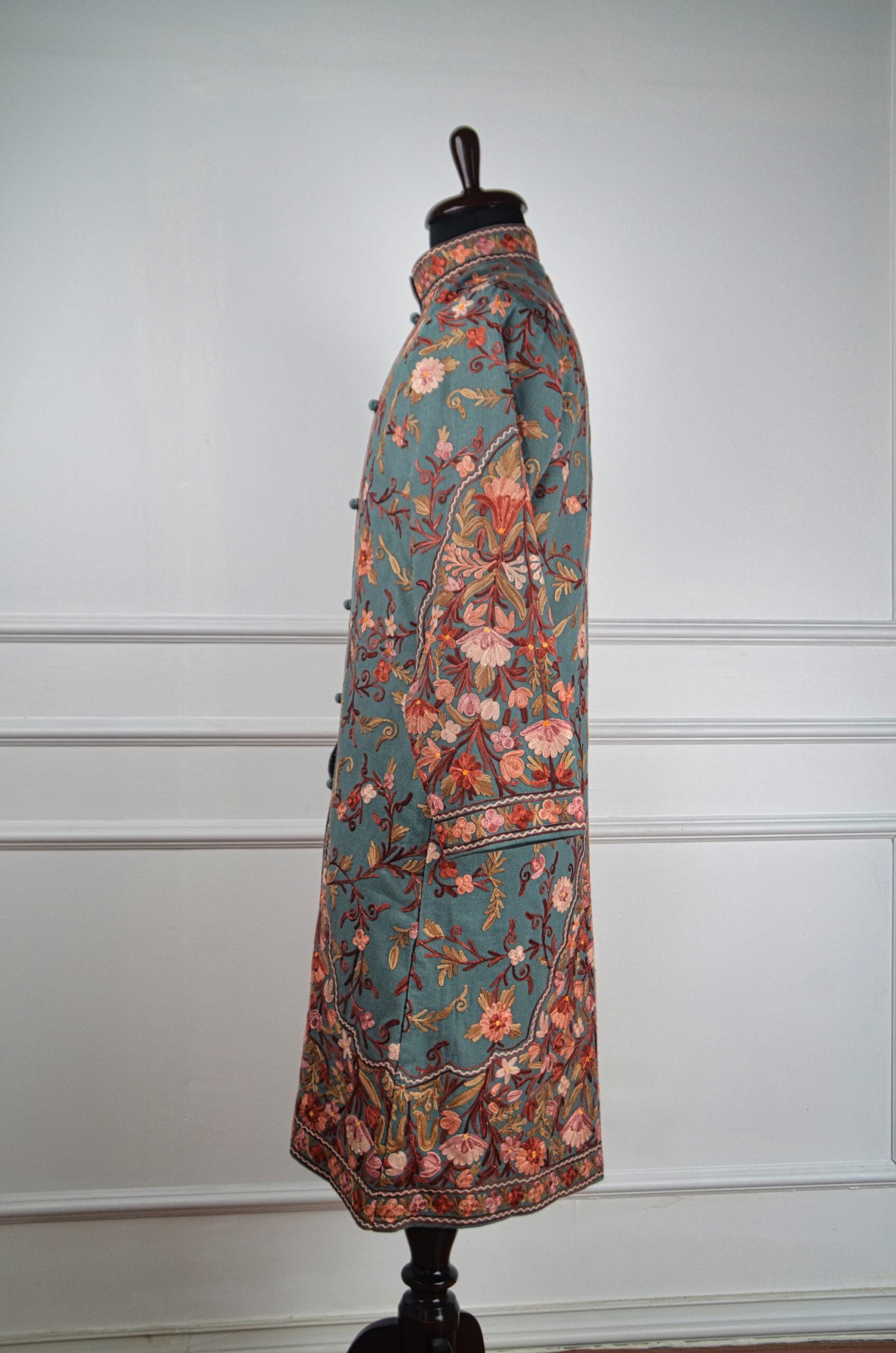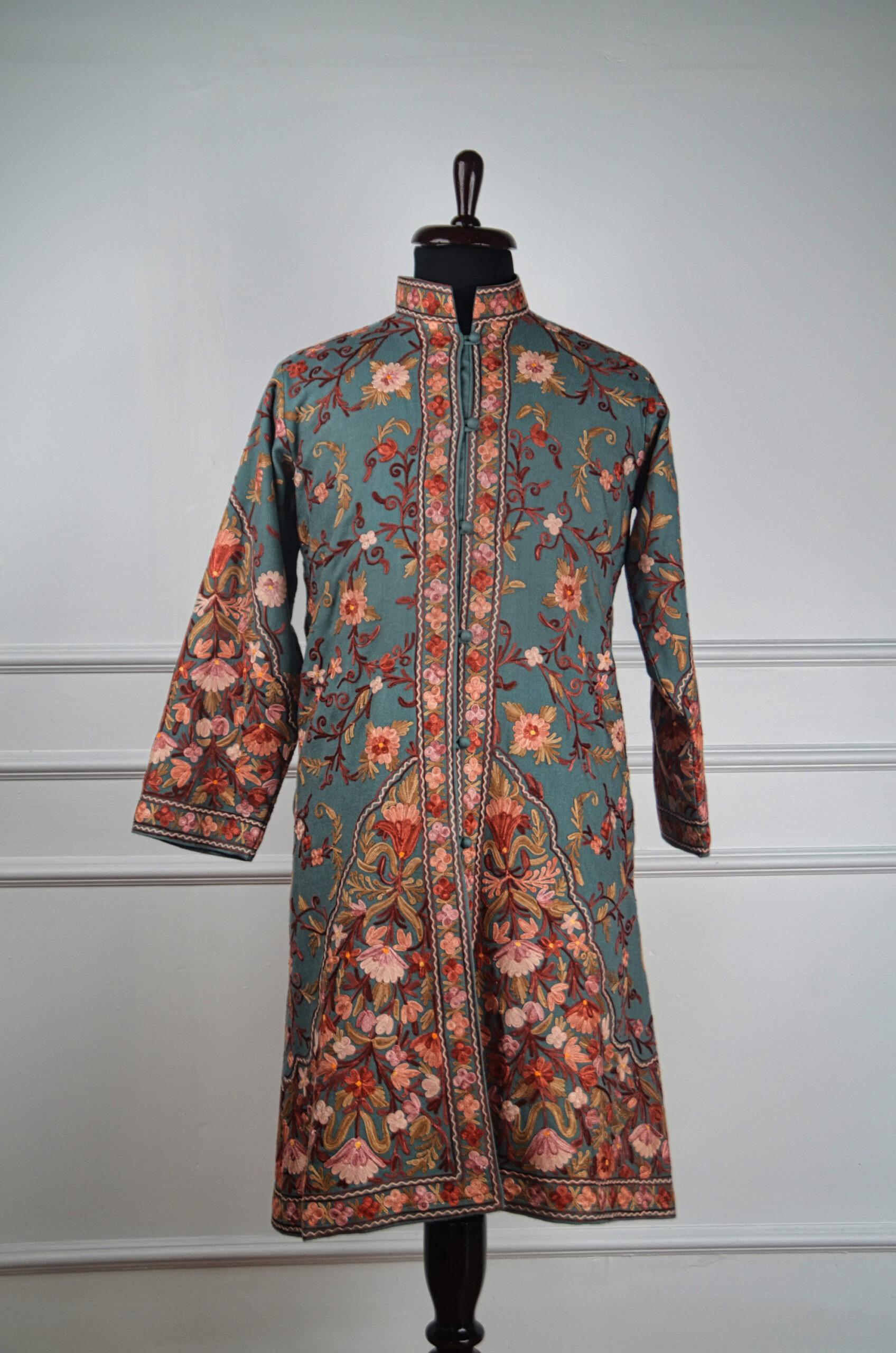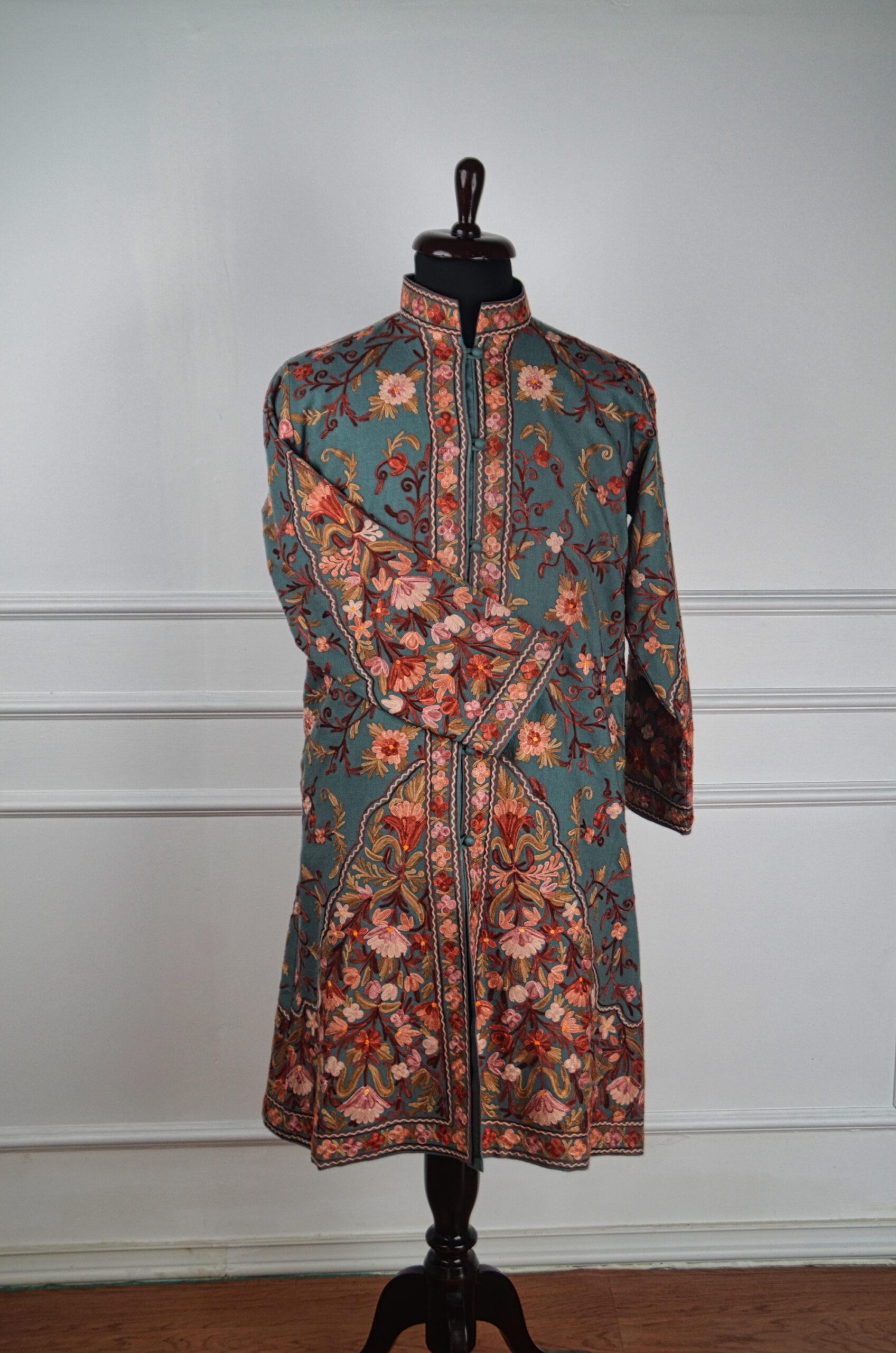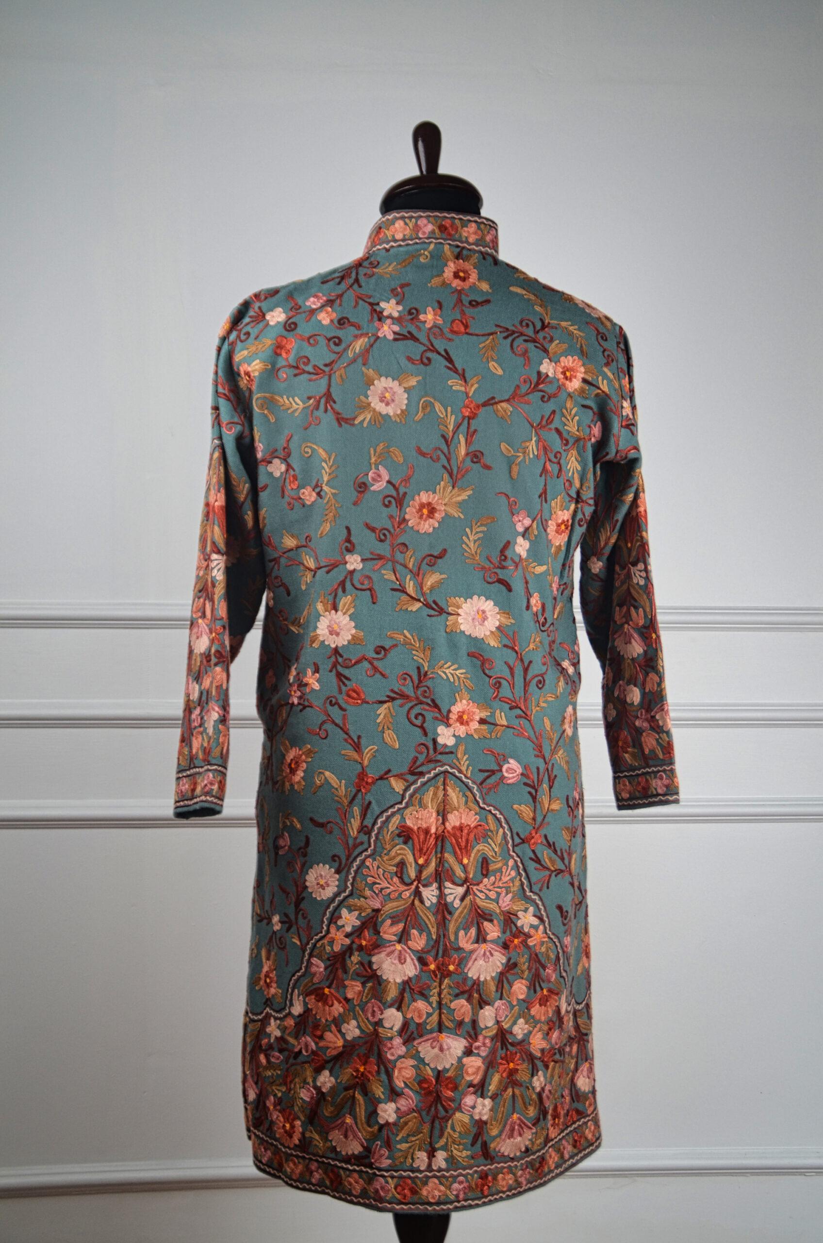 Autumn Reverie captures the soul of Kashmir’s golden season where rustling leaves meet timeless craftsmanship. This long woollen jacket, made of pure wool, is adorned with exquisite Aari embroidery in warm tones of coral, amber, blush, and russet that dance across a serene sage-green base. The intricate floral motifs and paisley vines reflect nature’s transition a poetic blend of vibrance and calm. Finished with a traditional mandarin collar and fine hand-looped buttons, the jacket evokes the romance of fall meadows and mountain winds. Autumn Reverie is not just an attire; it’s a story of heritage stitched in every golden thread.