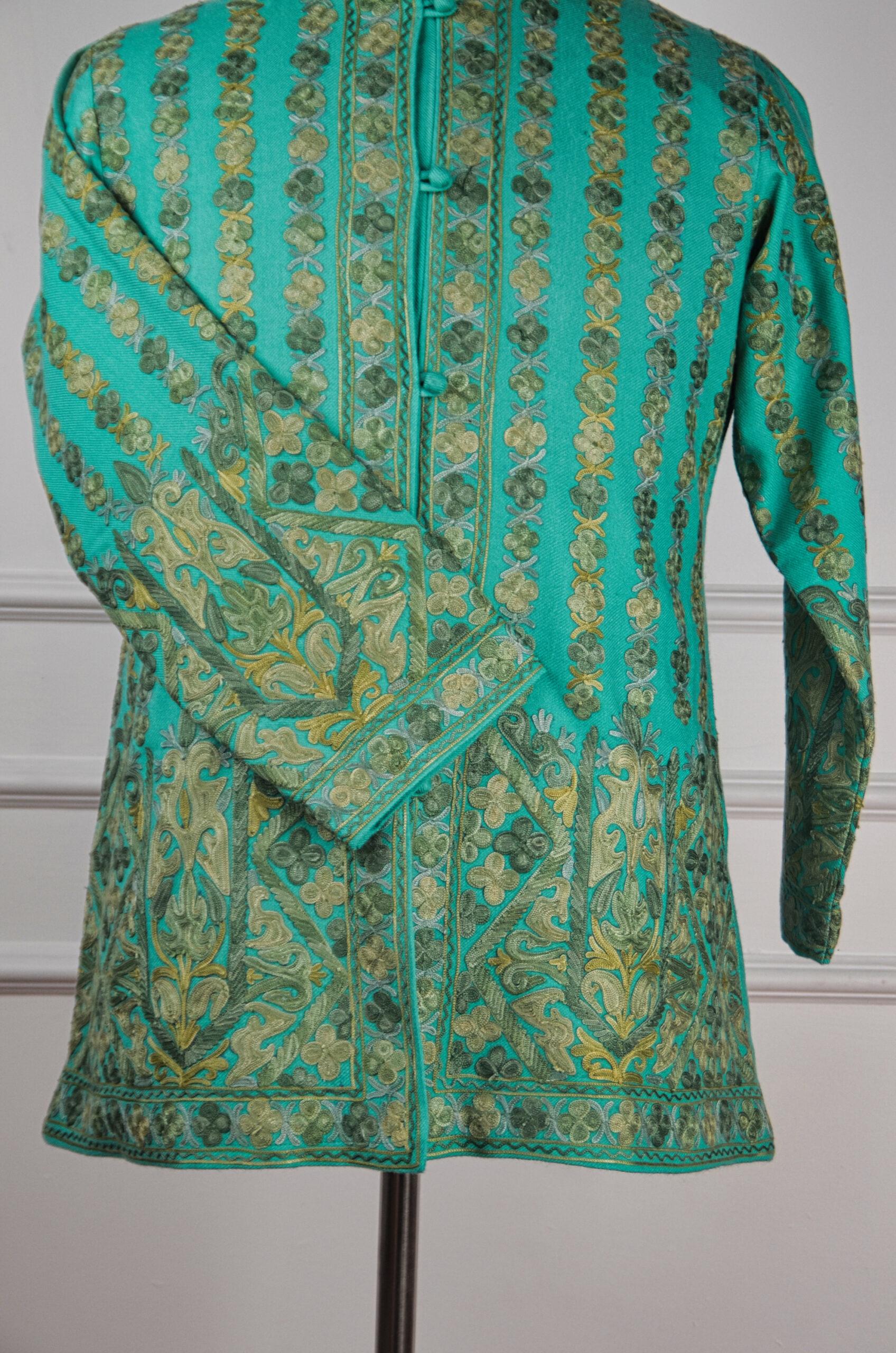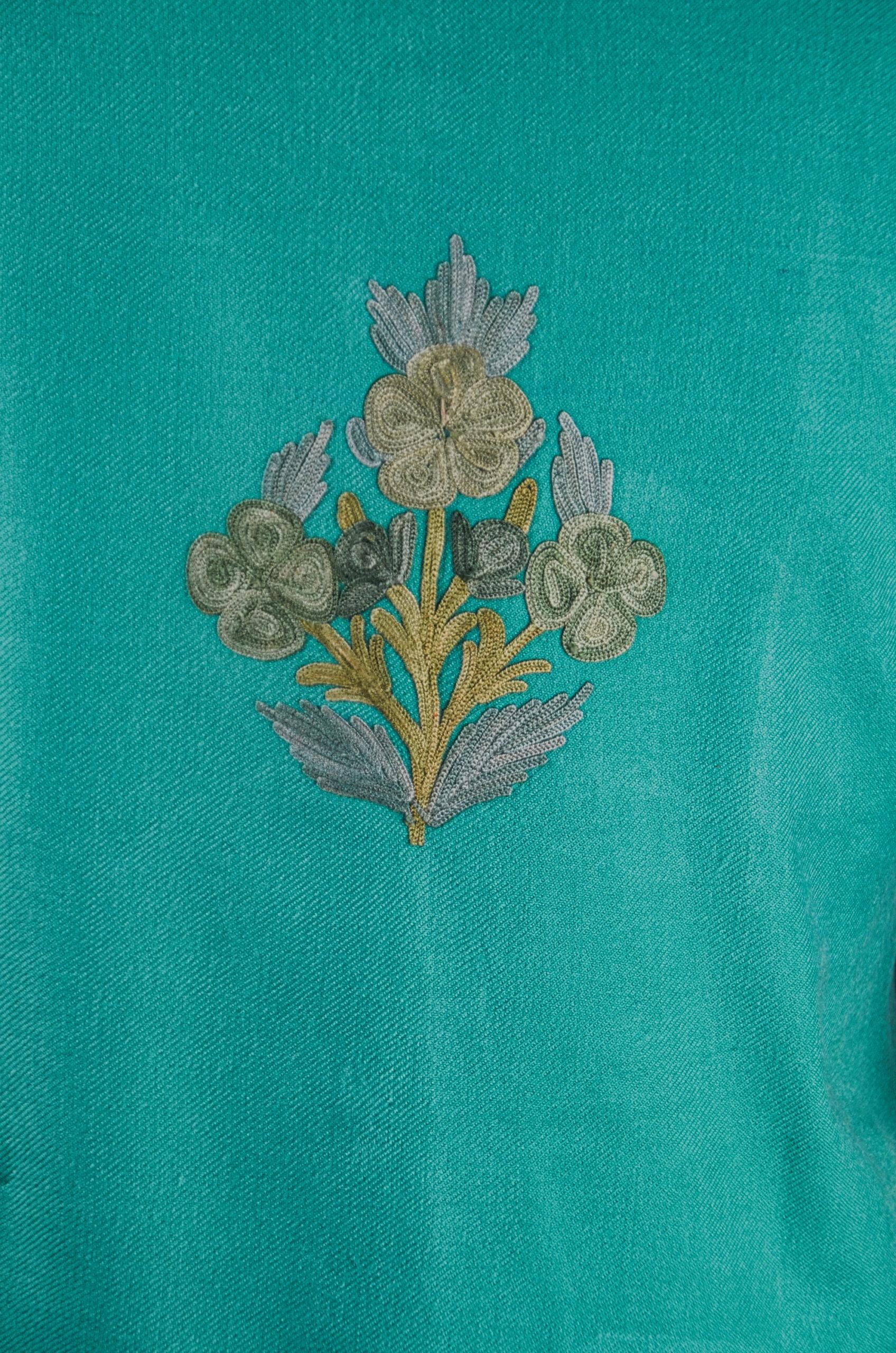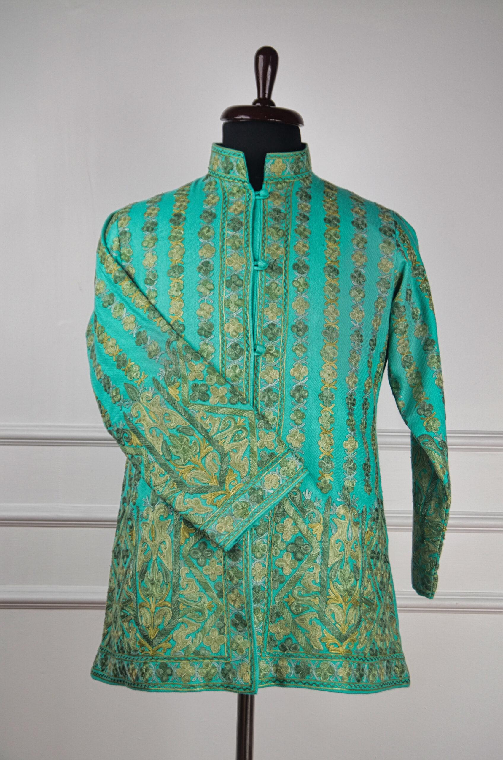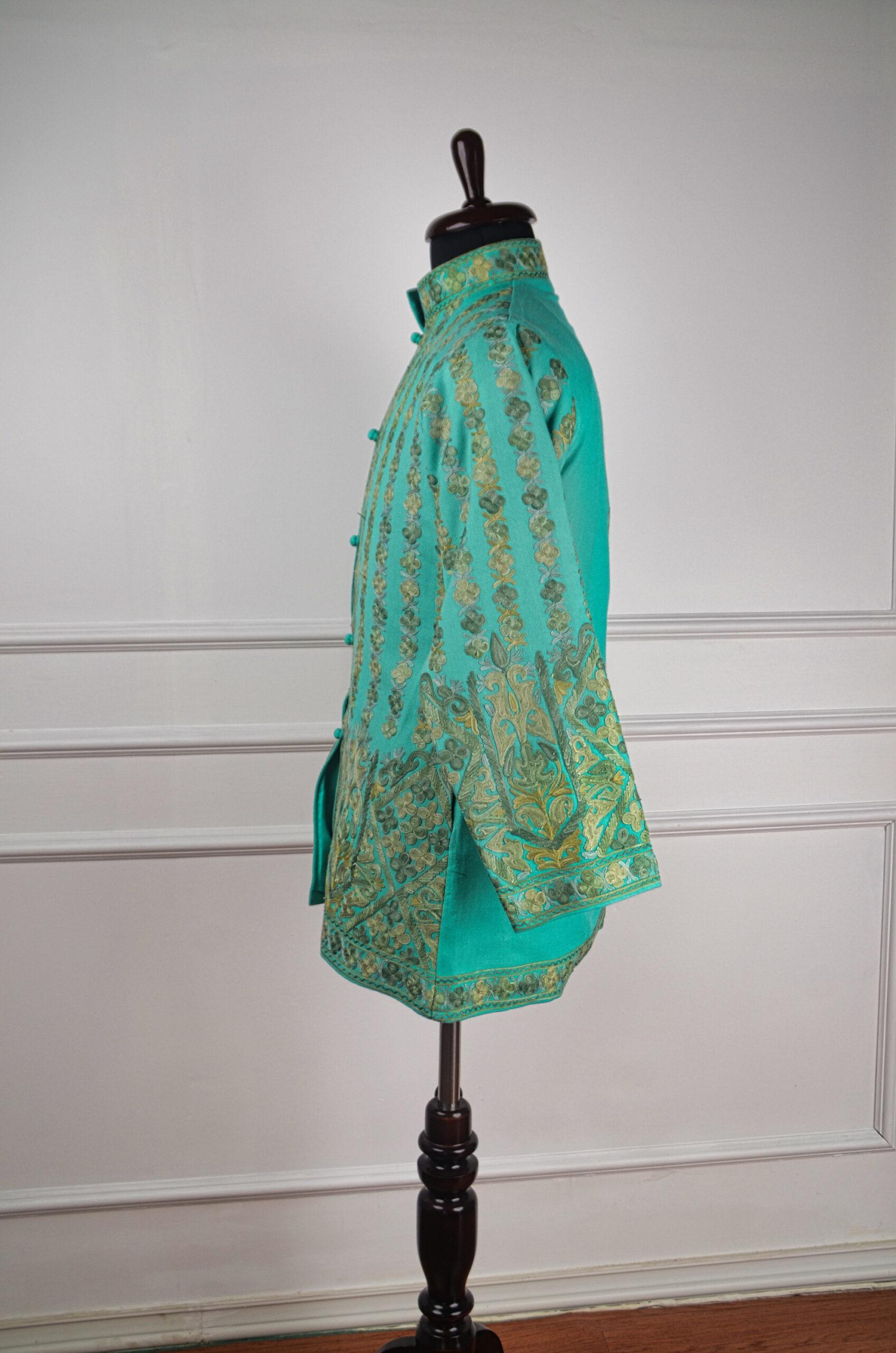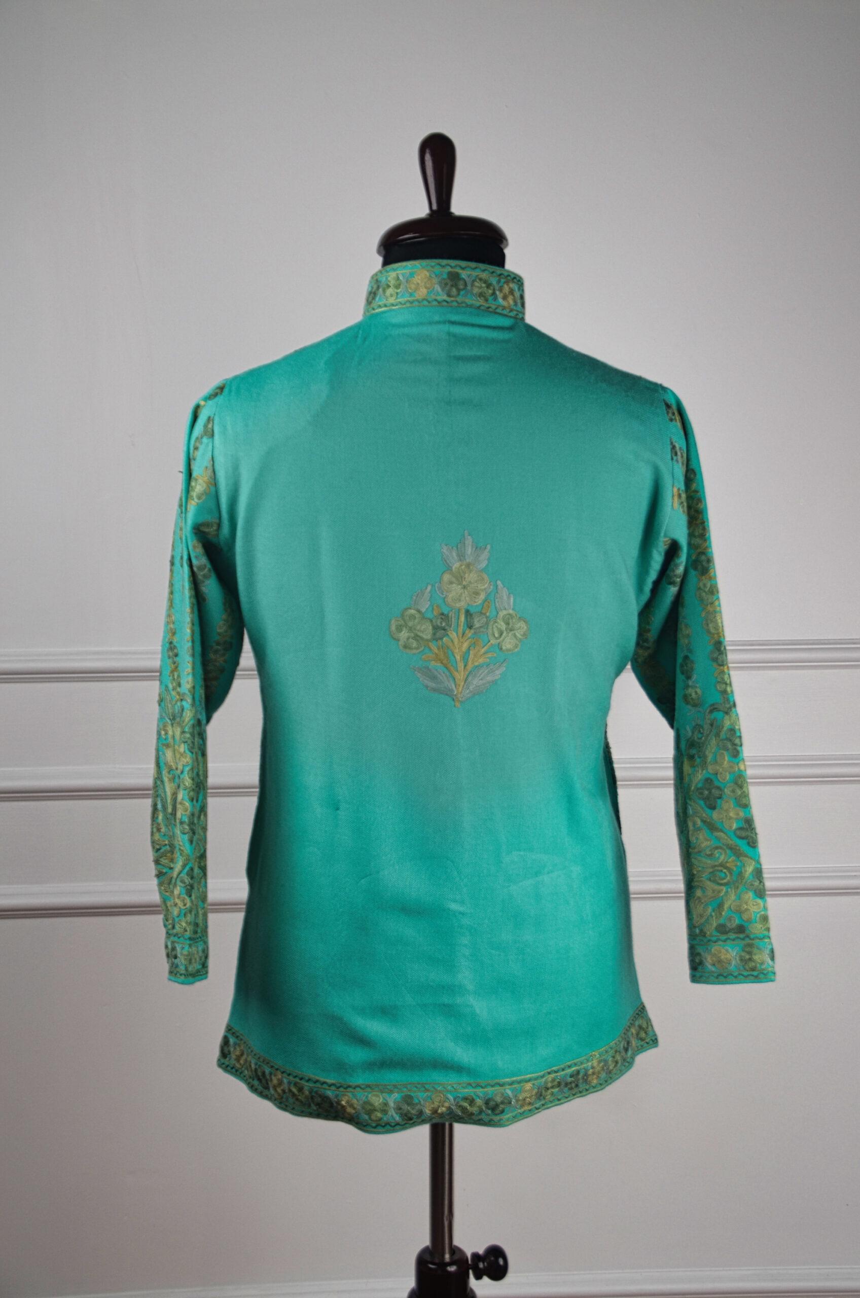 Whispering Willows is a serene ode to Kashmir’s artistic grace a short woollen jacket that merges nature’s tranquility with exquisite handcraft. Made from pure wool, this piece showcases delicate Aari embroidery in muted shades of olive, moss, and gold that ripple across the soothing turquoise canvas like sunlit reflections on a willow-lined stream. The rhythmic vertical motifs evoke harmony and balance, while the mandarin collar and structured silhouette add a touch of sophistication. Each thread tells a story of patience, artistry, and timeless beauty a wearable piece of Kashmiri heritage designed to embody quiet luxury and poetic charm.