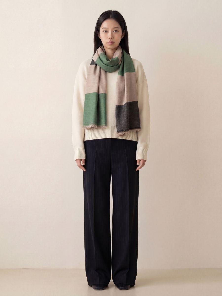 Zameen-e-Ziya is a luxurious handwoven Kashmiri cashmere scarf crafted for effortless everyday elegance. The design features bold colour-block panels in deep forest green, soft sand-beige, and charcoal grey, creating a modern geometric look with a calm, earthy character. Woven in pure cashmere, it feels feather-soft against the skin while offering natural warmth and graceful drape. A refined statement piece for winter layering, this scarf pairs beautifully with neutrals, black, and muted tones perfect for both casual styling and elevated evenings.